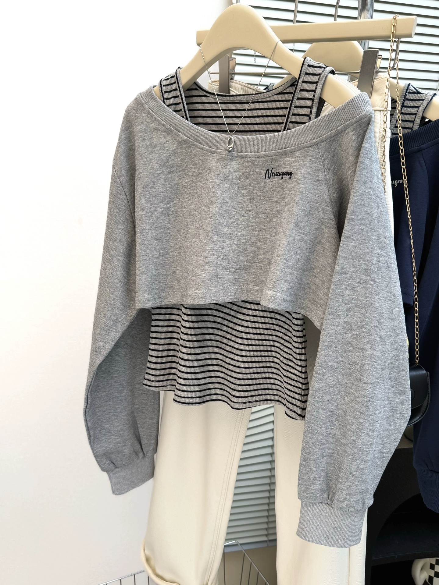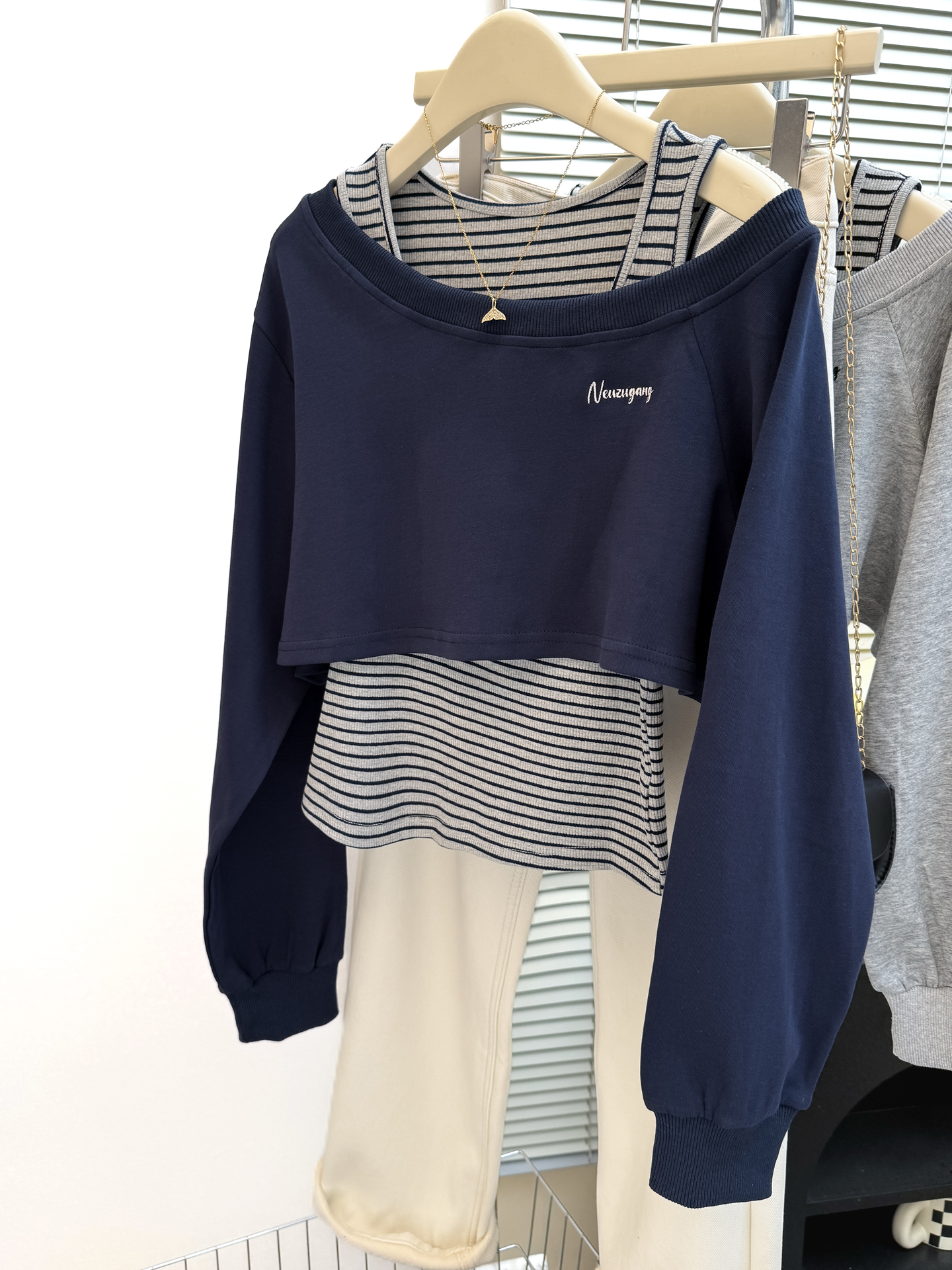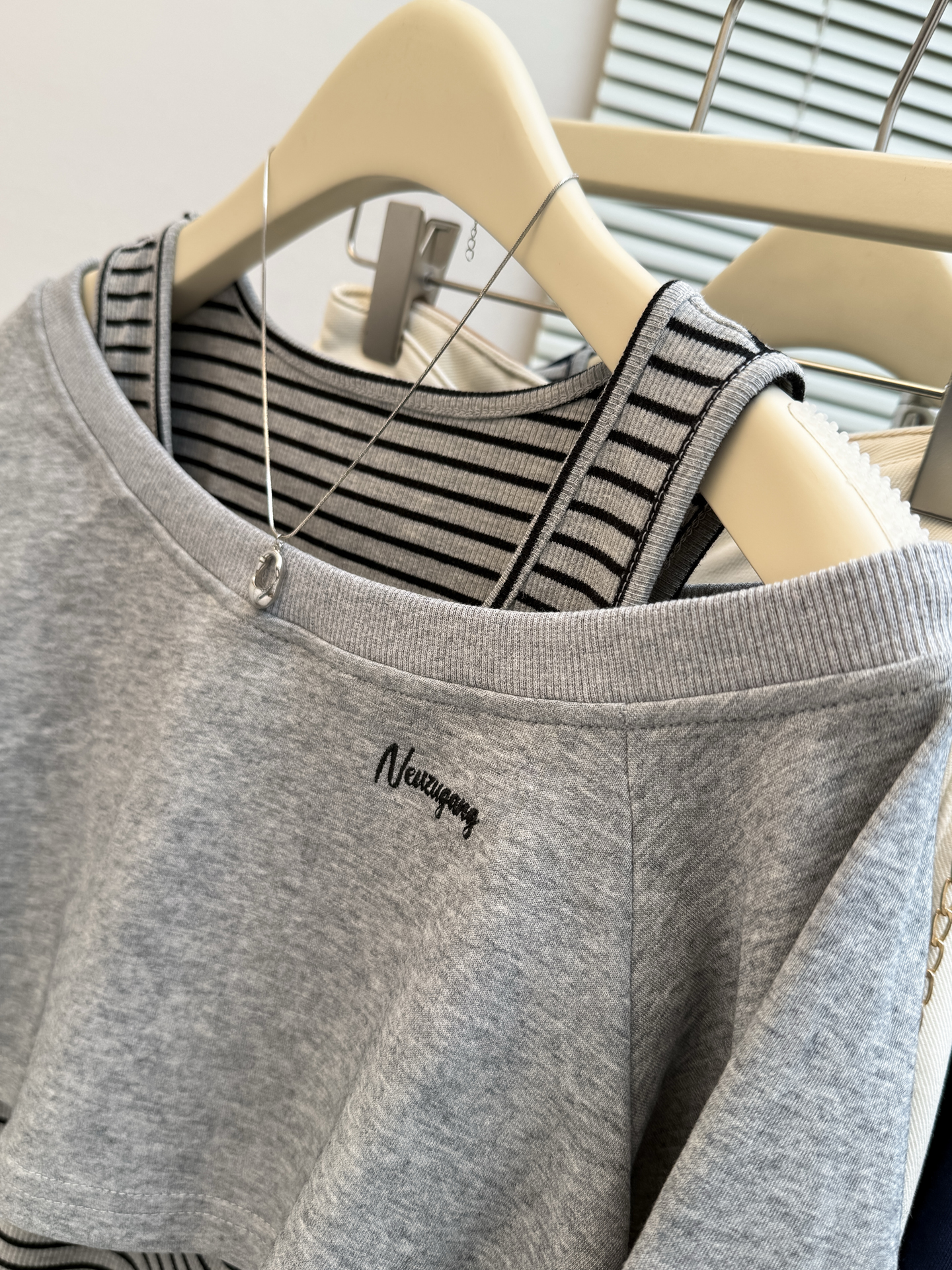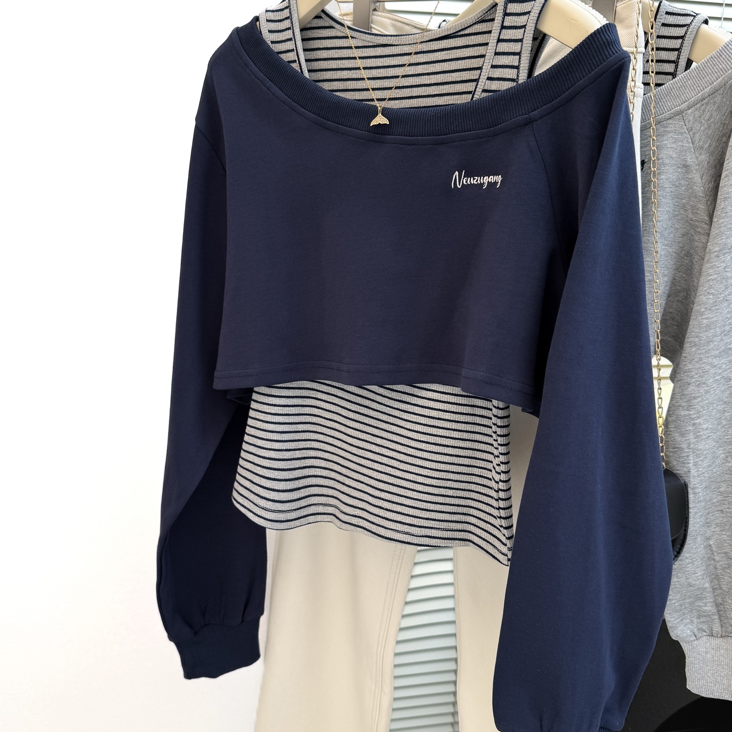RY3781# 实拍花灰色斜肩长袖条纹卫衣女2026秋季设计感搭配背心两件套上衣
