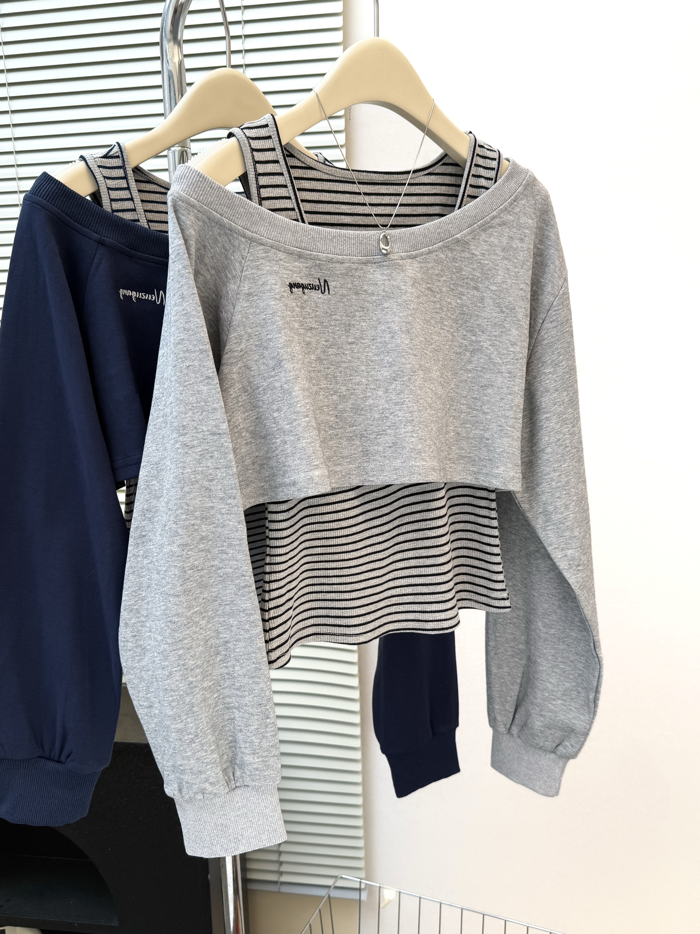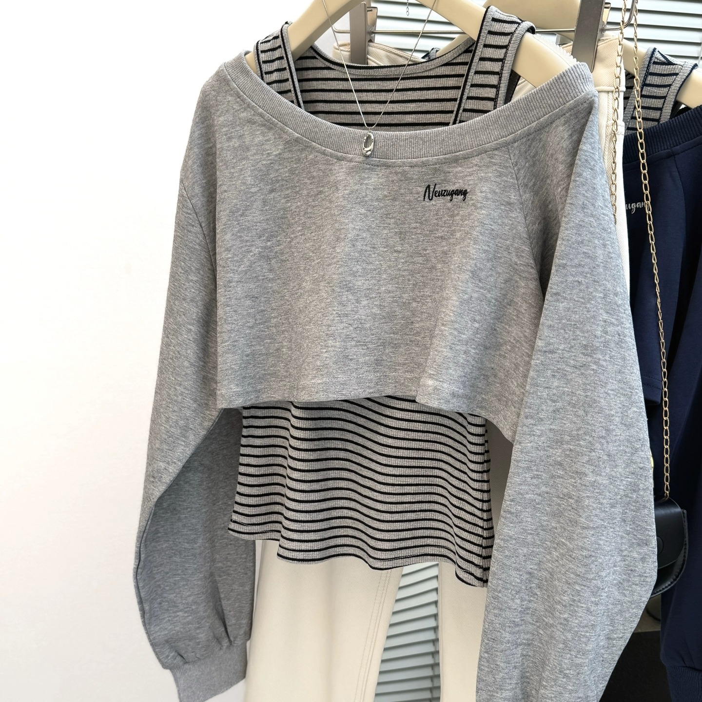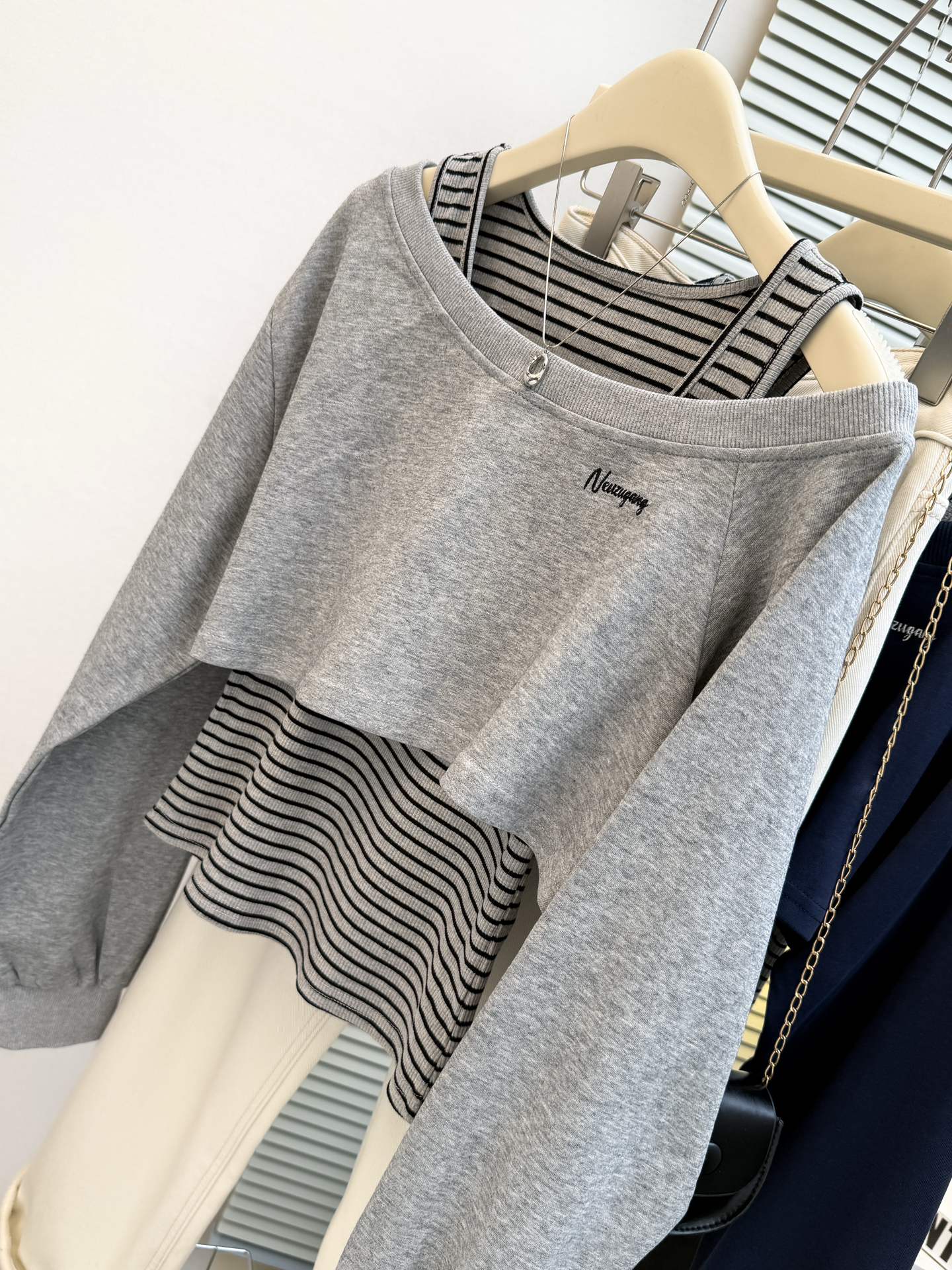 RY3781# 实拍花灰色斜肩长袖条纹卫衣女2026秋季设计感搭配背心两件套上衣
