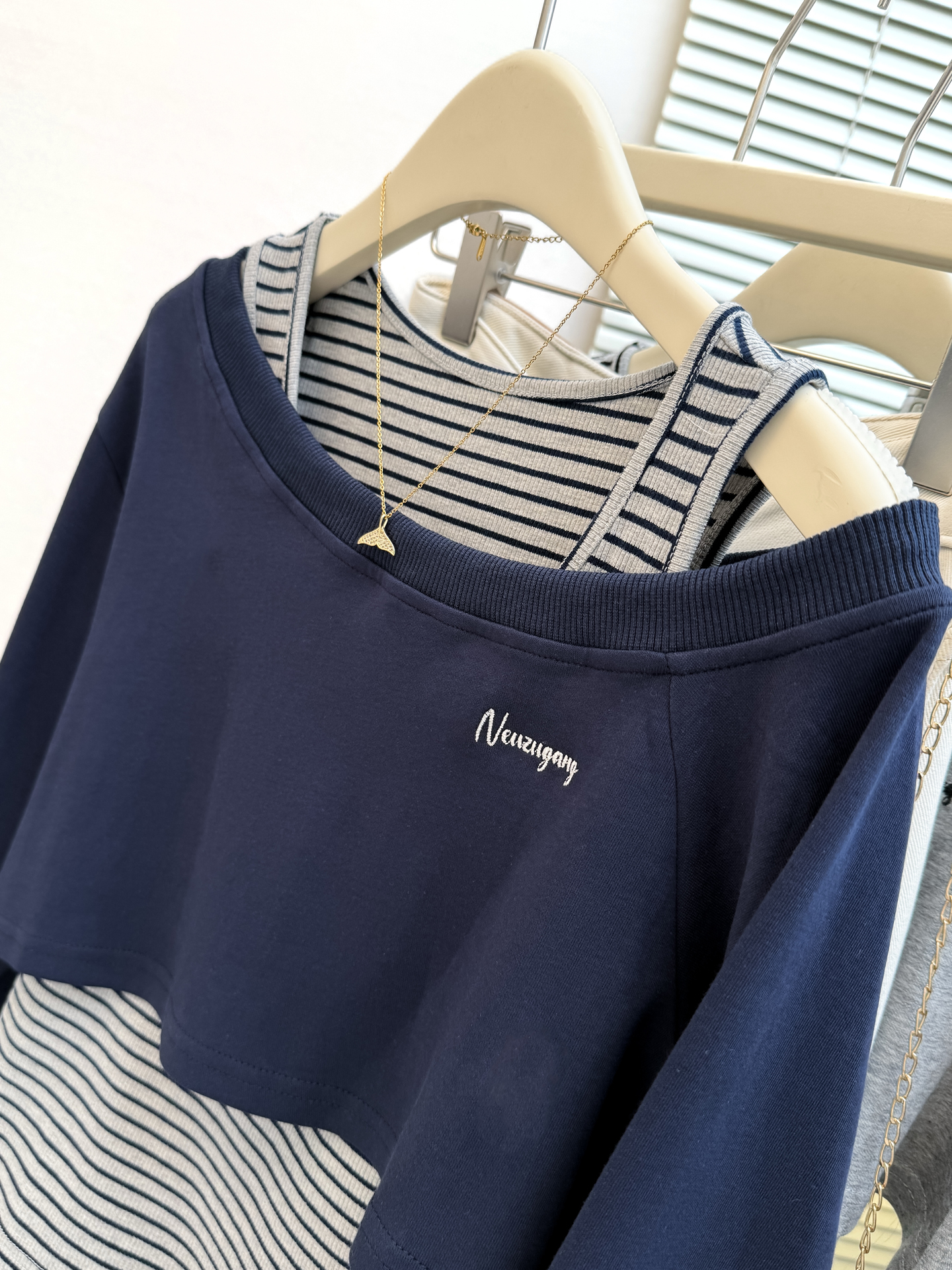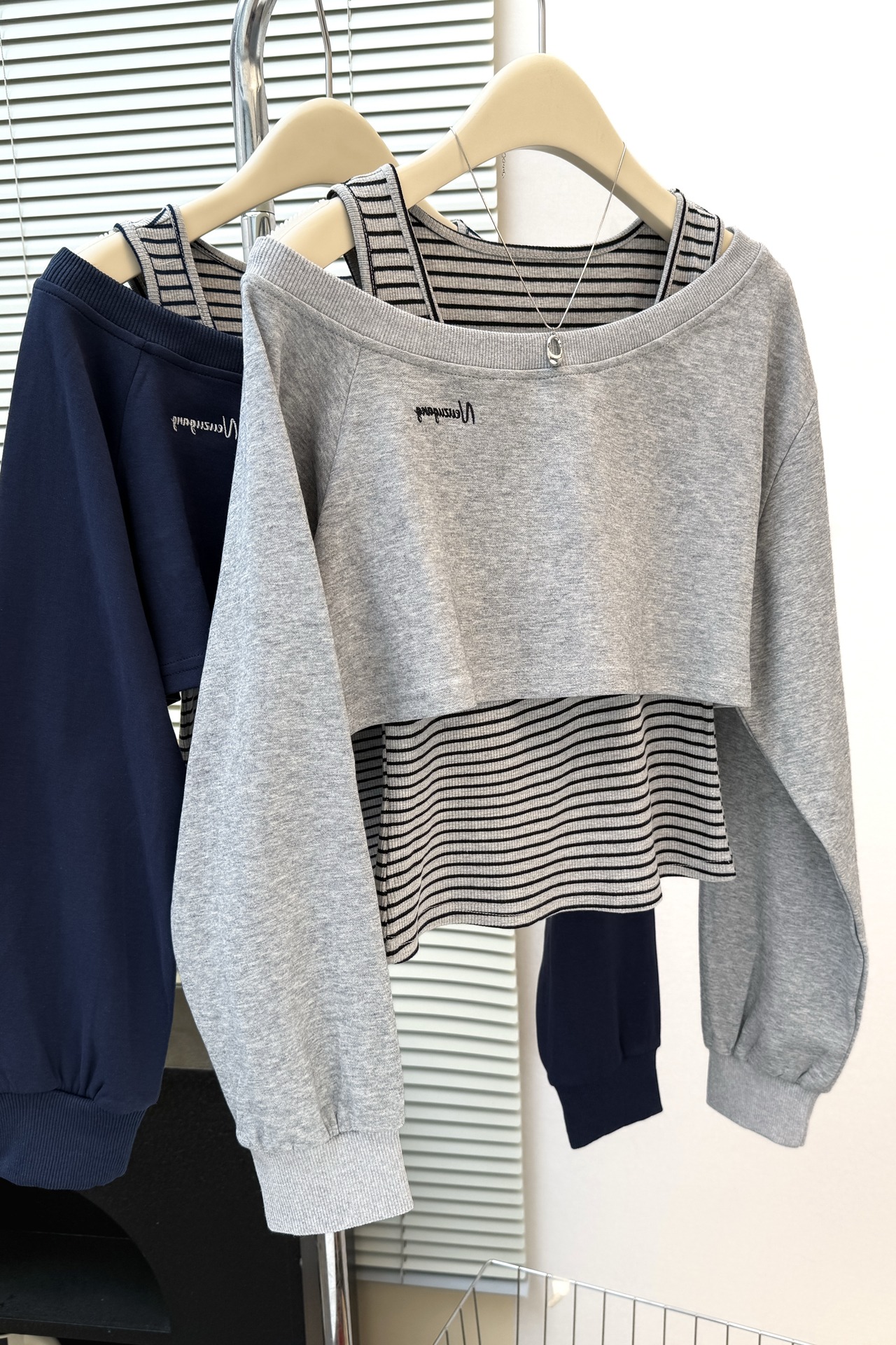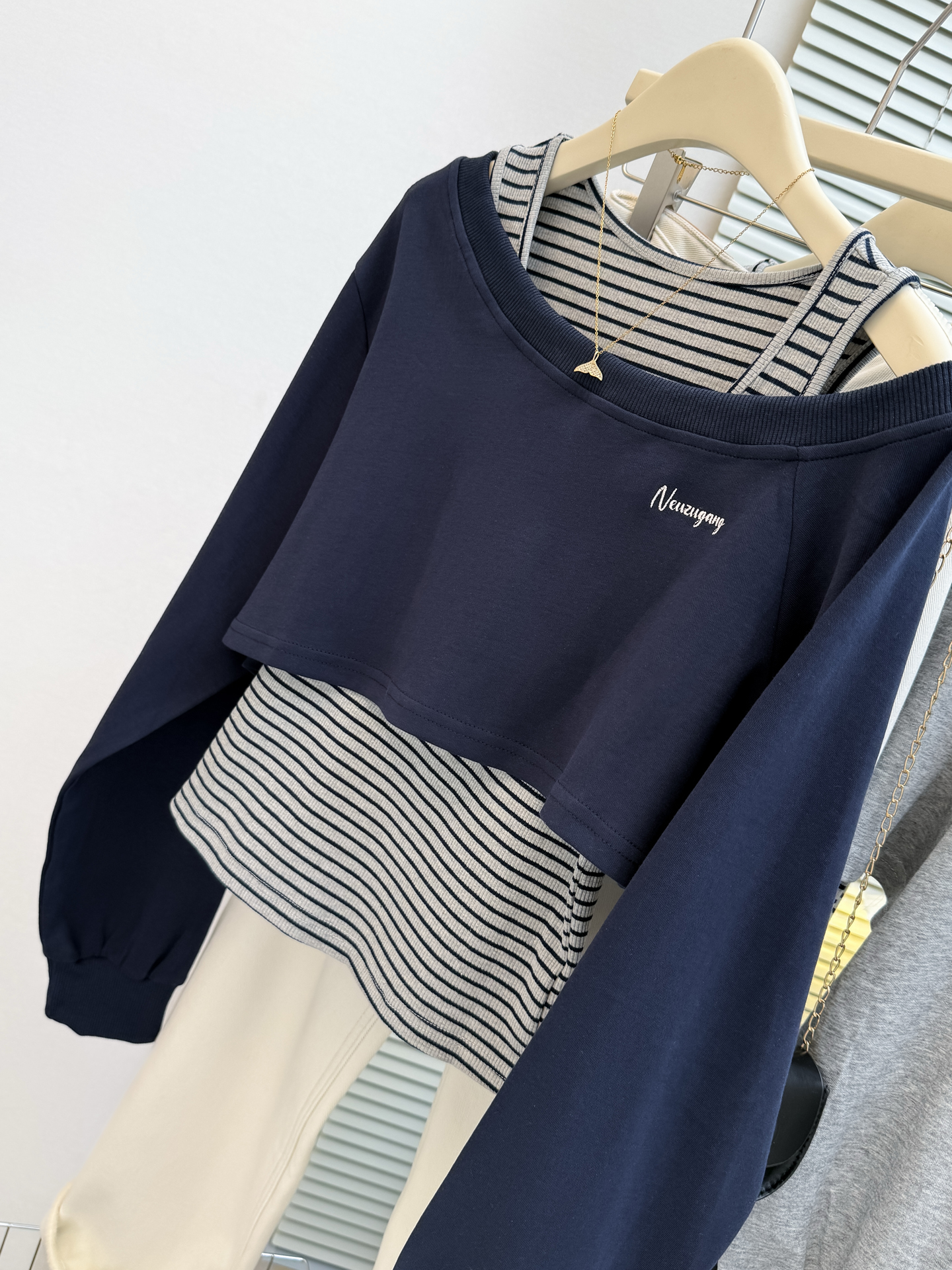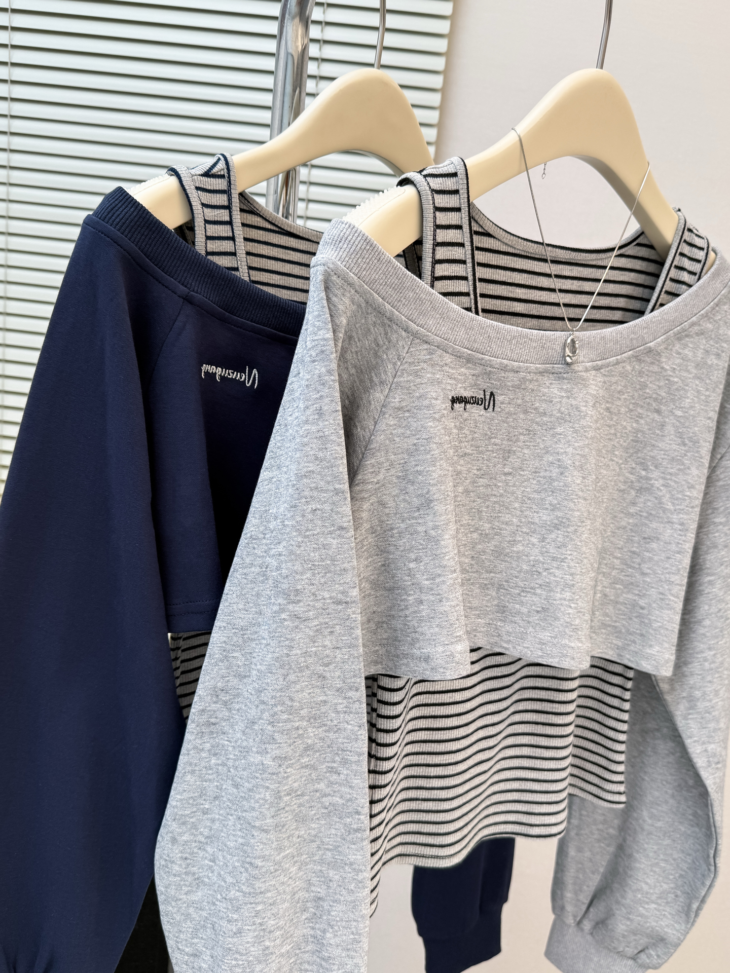 RY3781# 实拍花灰色斜肩长袖条纹卫衣女2026秋季设计感搭配背心两件套上衣