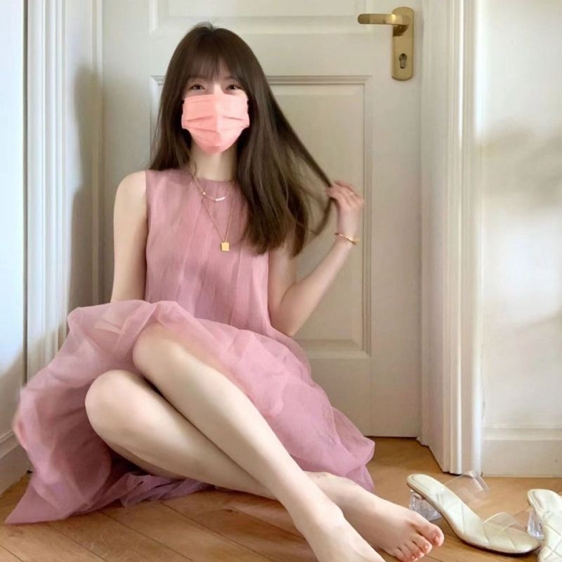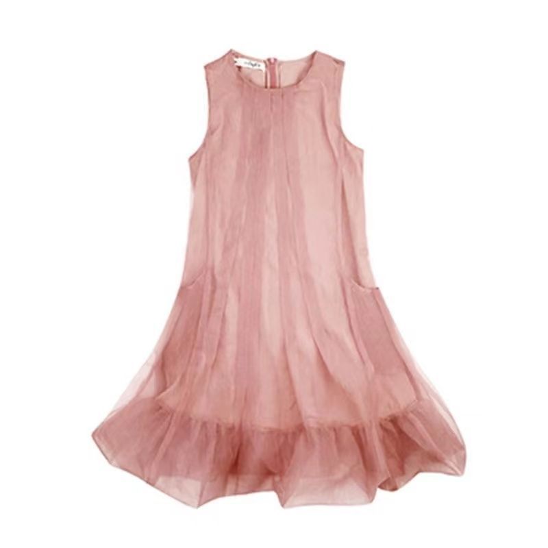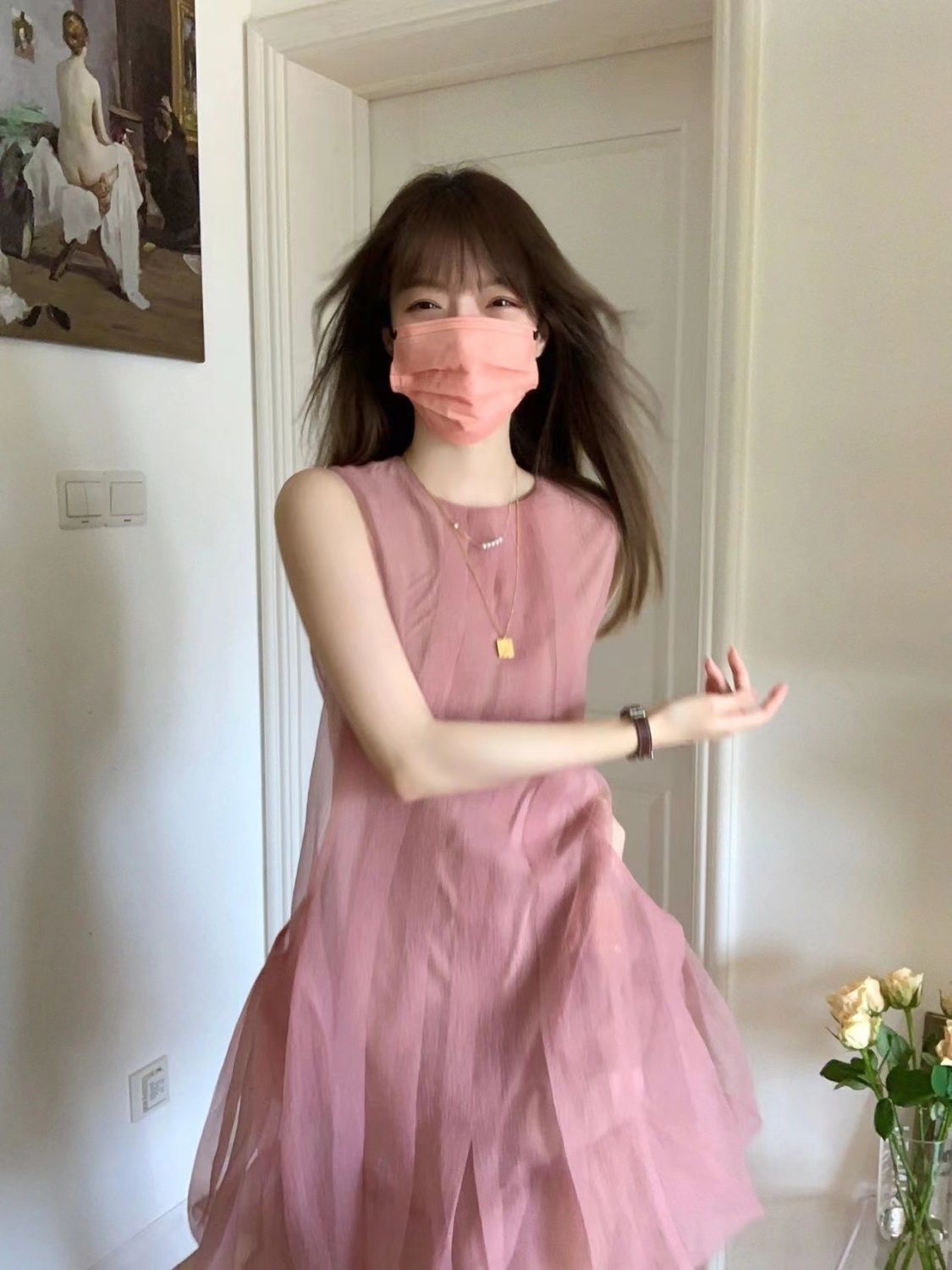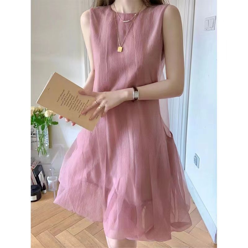 RY3785# 粉色圆领无袖连衣裙女2026年夏季新款女装气质设计感宽松连衣裙子