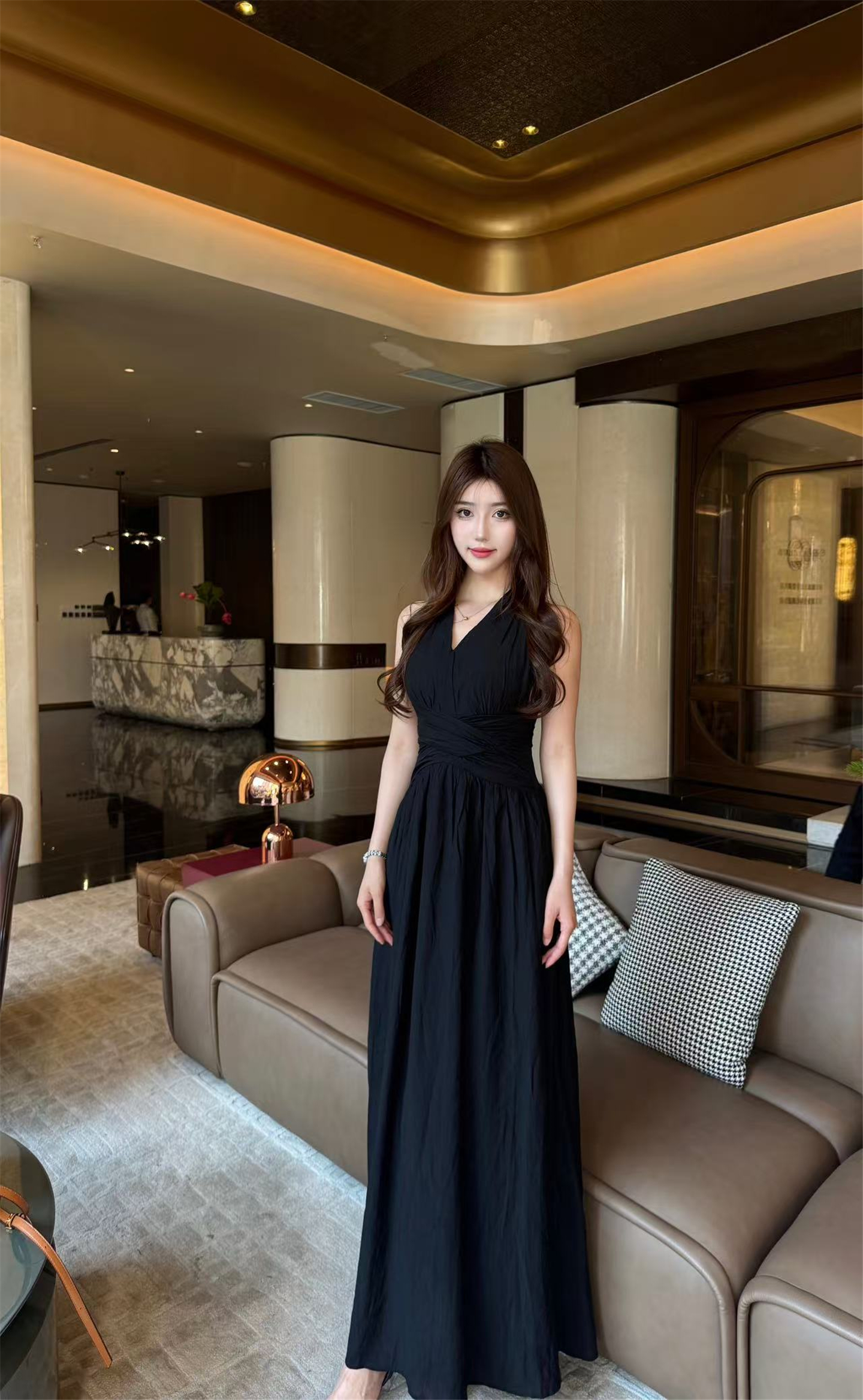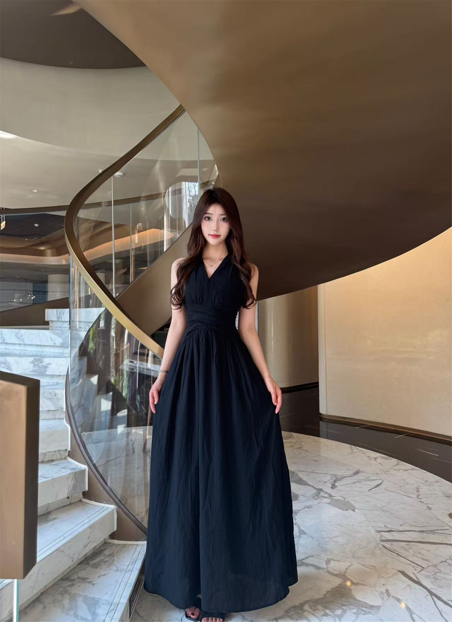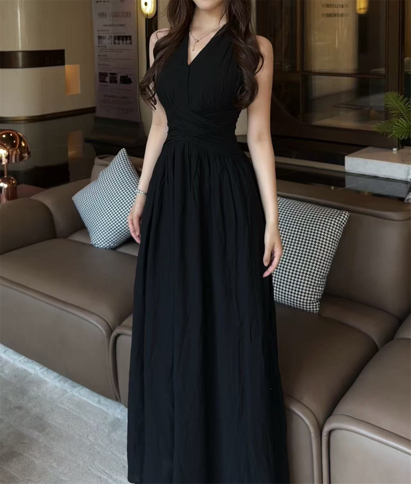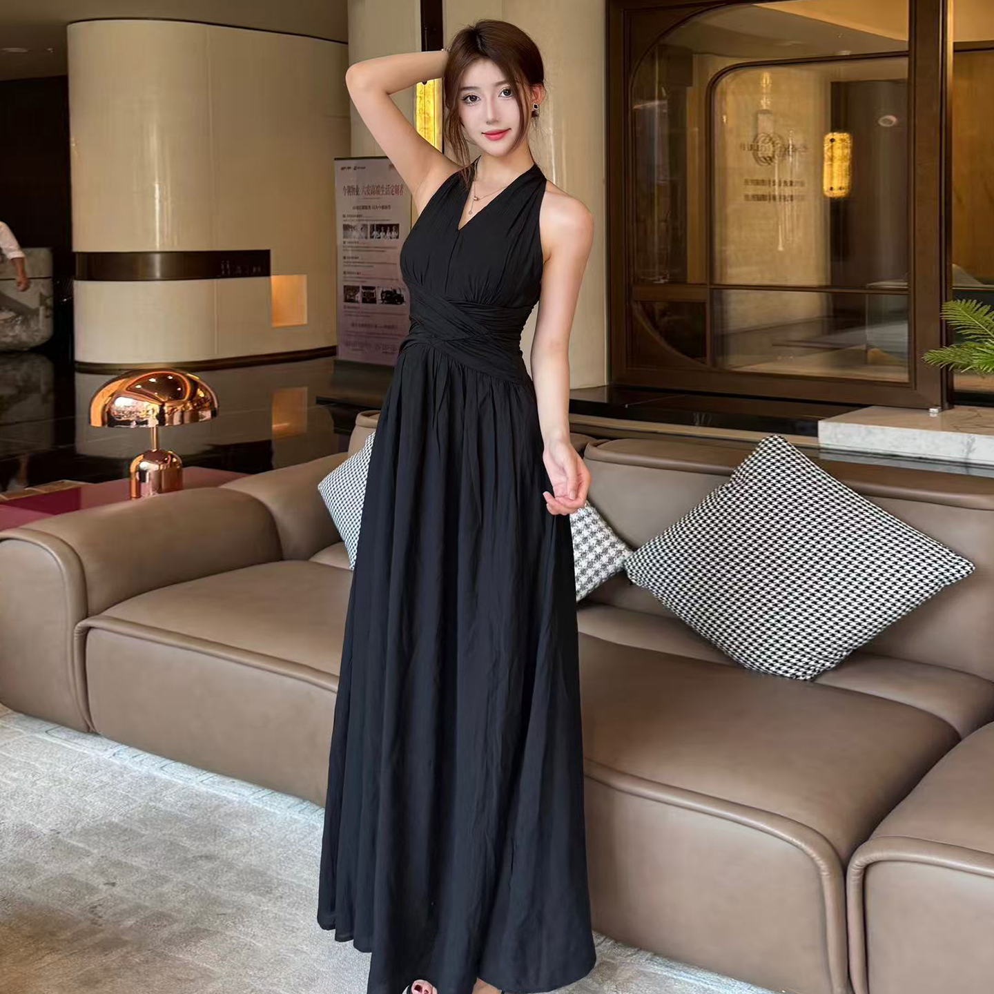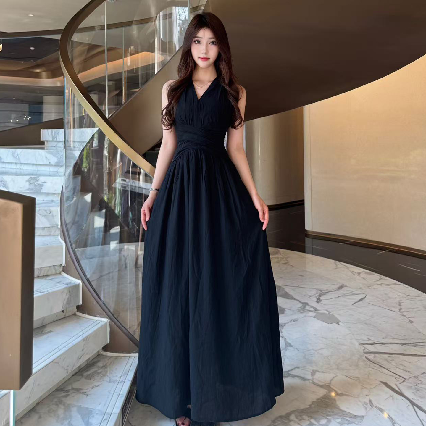 RY3786# 韩系漂亮冷淡系黑色无袖连衣裙子女夏季2026新款茶里茶气别致长裙