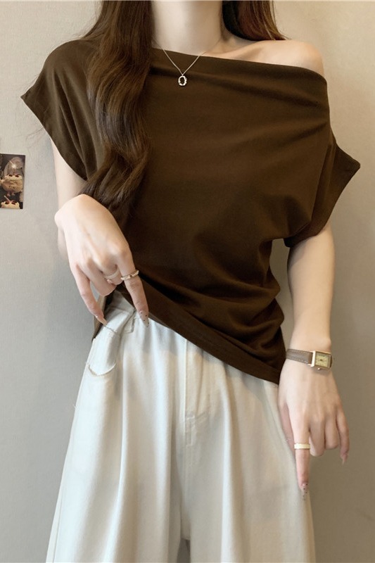 RY3787# 实拍夏装新款高级感一字肩短袖修身显瘦t恤小众别致独特上衣女