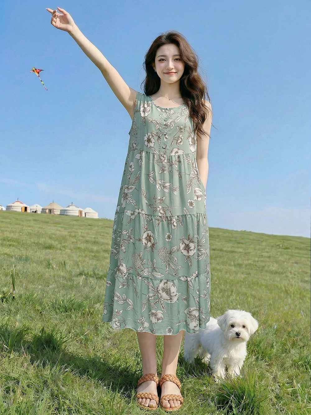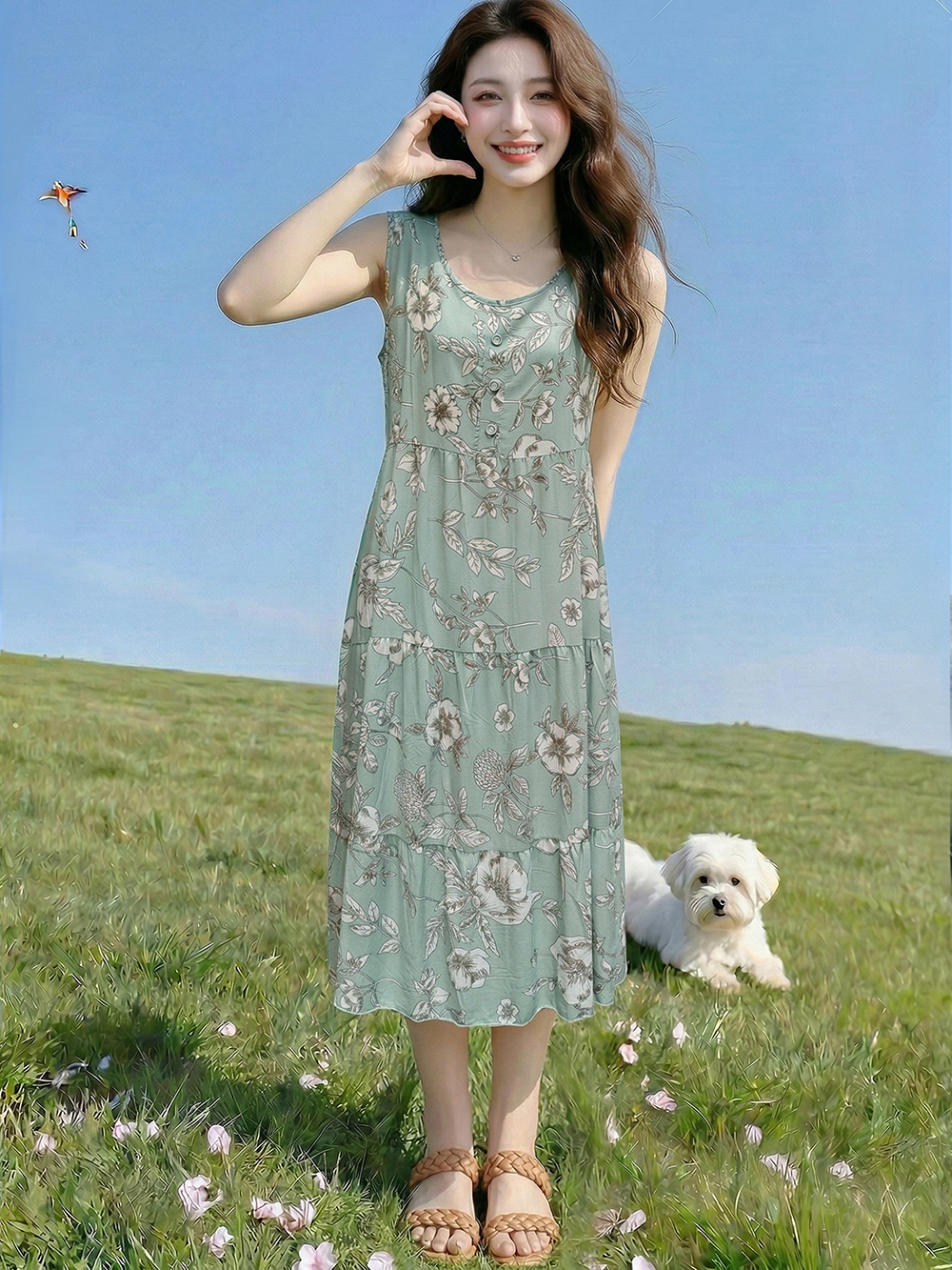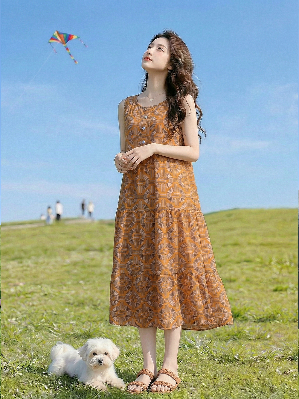 RY3789# 实拍大码女装夏装新款日韩通勤百搭人棉长款无袖连衣裙