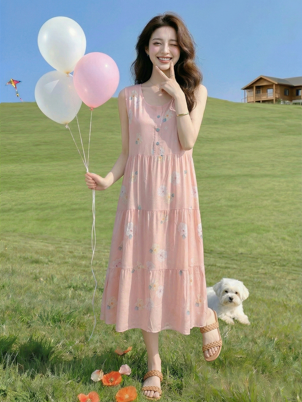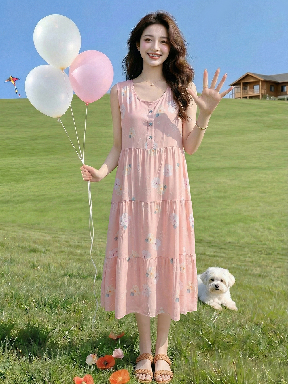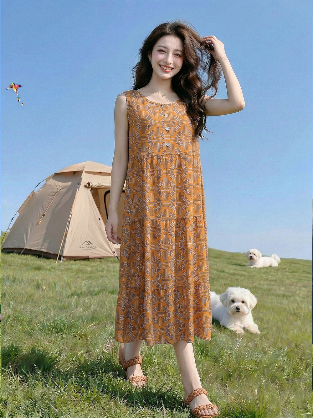 RY3789# 实拍大码女装夏装新款日韩通勤百搭人棉长款无袖连衣裙