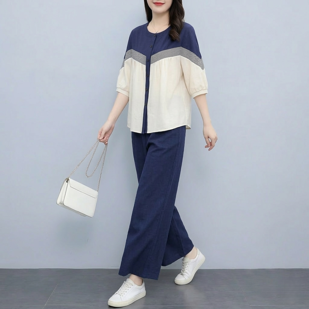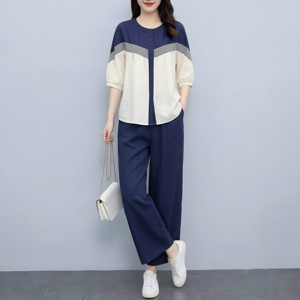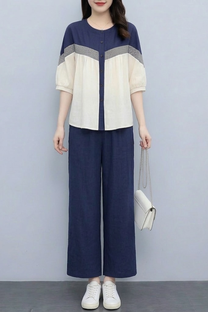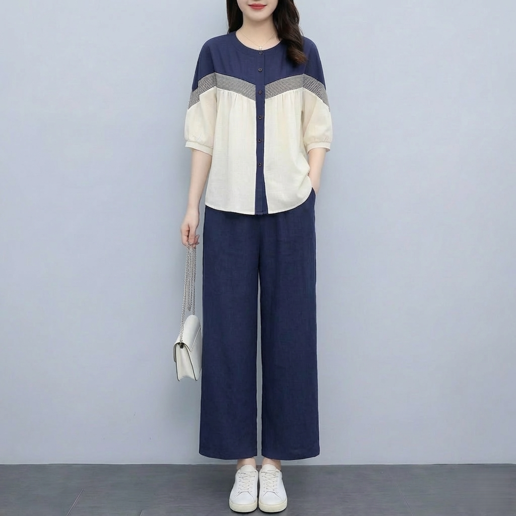 RY3798# 实拍简约艺术复古氧气拼色宽松遮肚衬衫+松紧腰九分裤阔腿裤套装