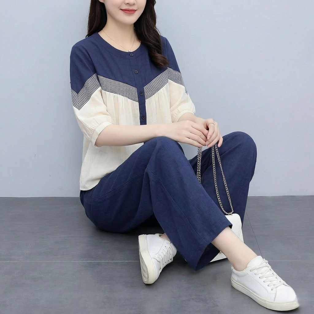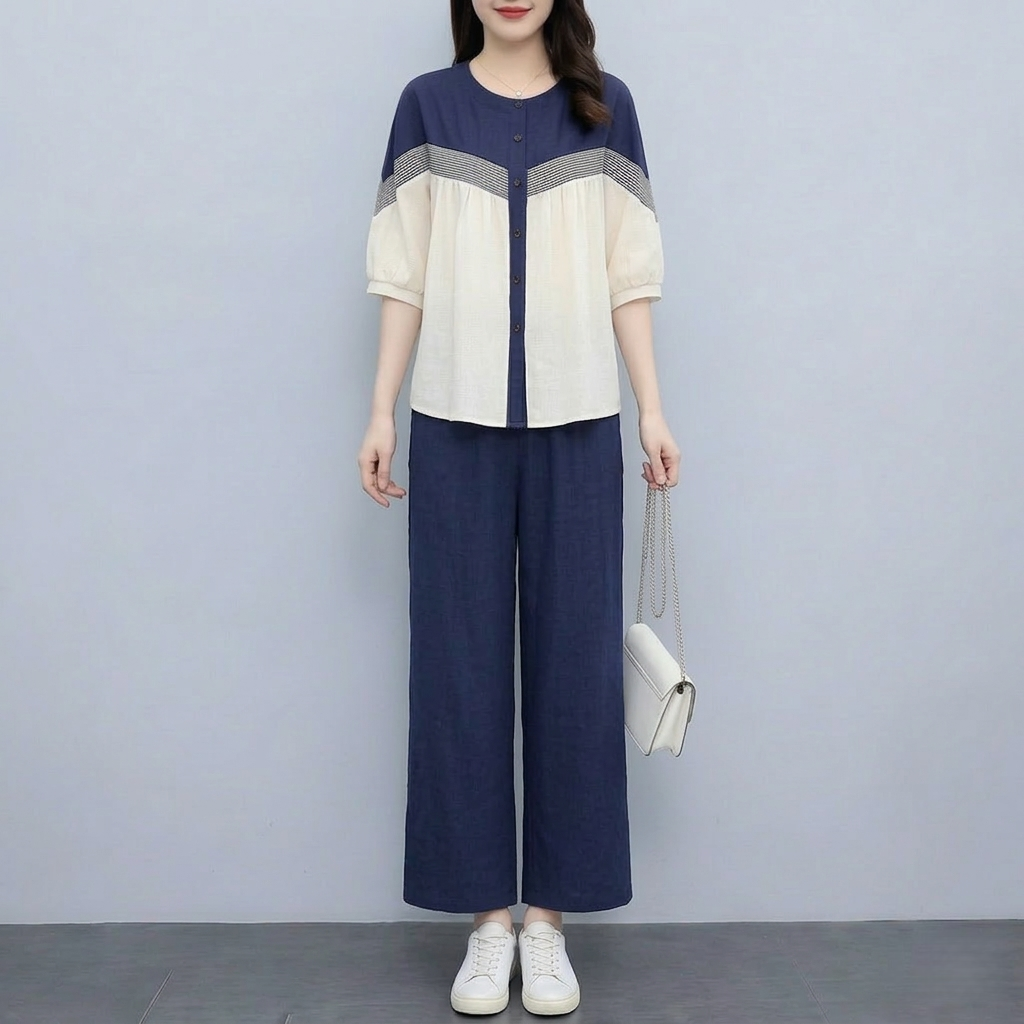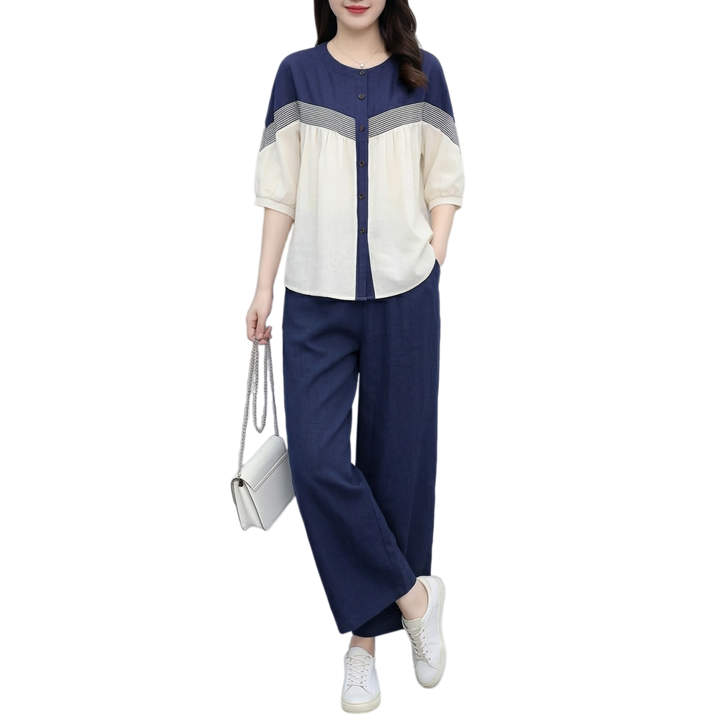 RY3798# 实拍简约艺术复古氧气拼色宽松遮肚衬衫+松紧腰九分裤阔腿裤套装