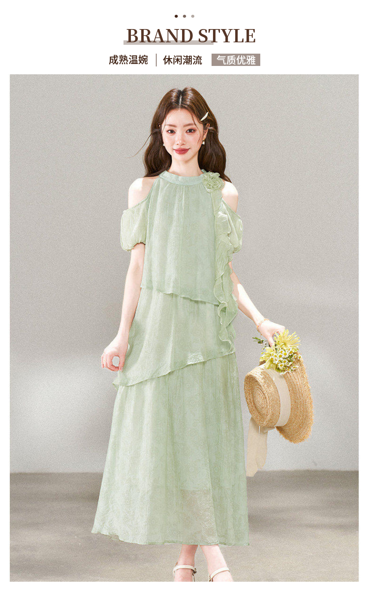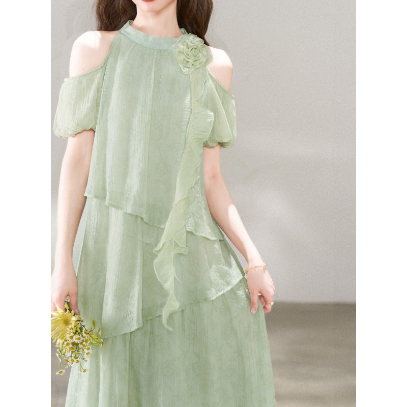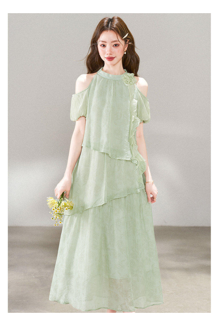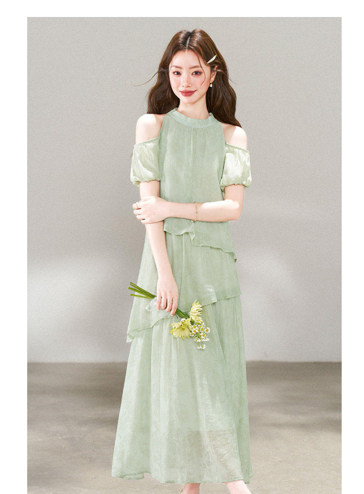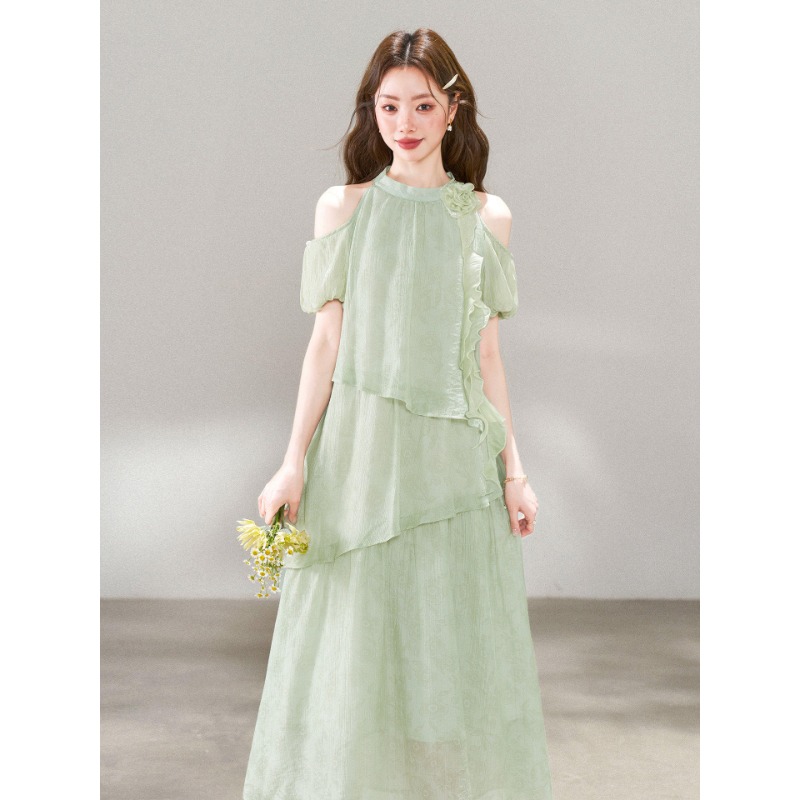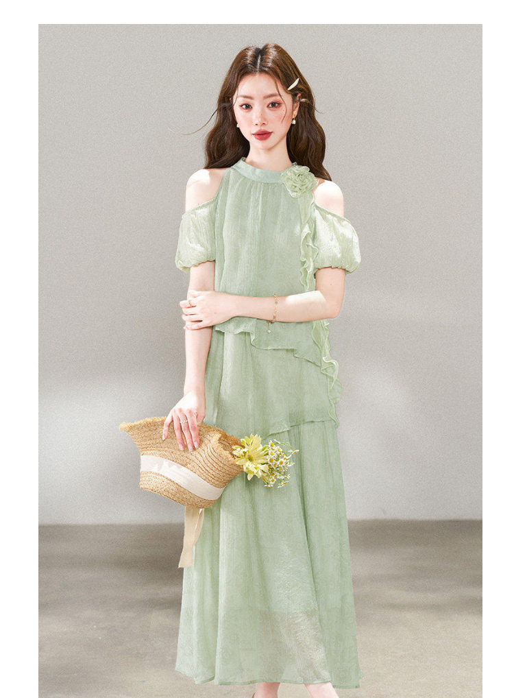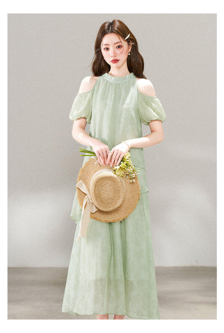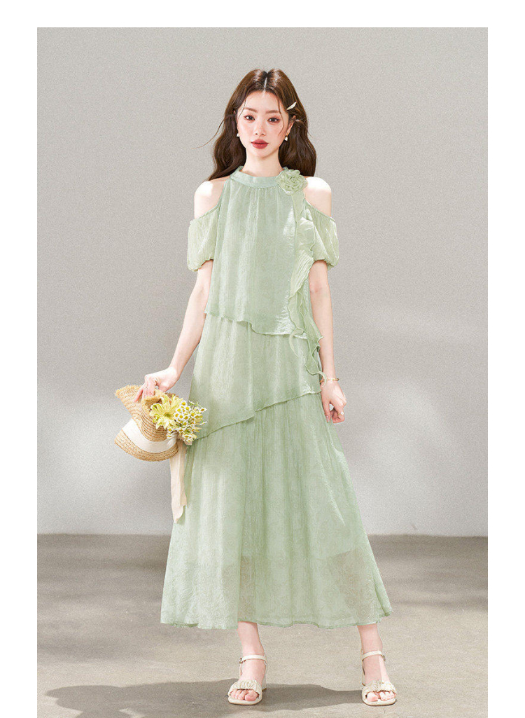 RY3815# 夏季新款法式度假风露肩挂脖绿色连衣裙海岛穿搭气质长裙