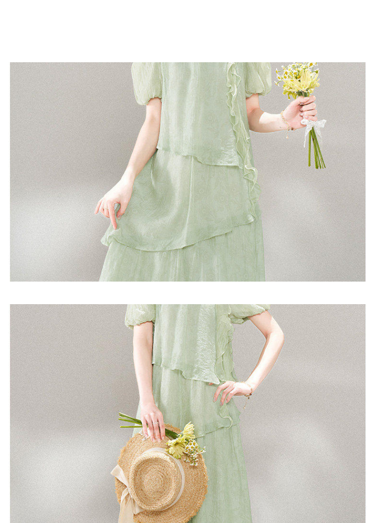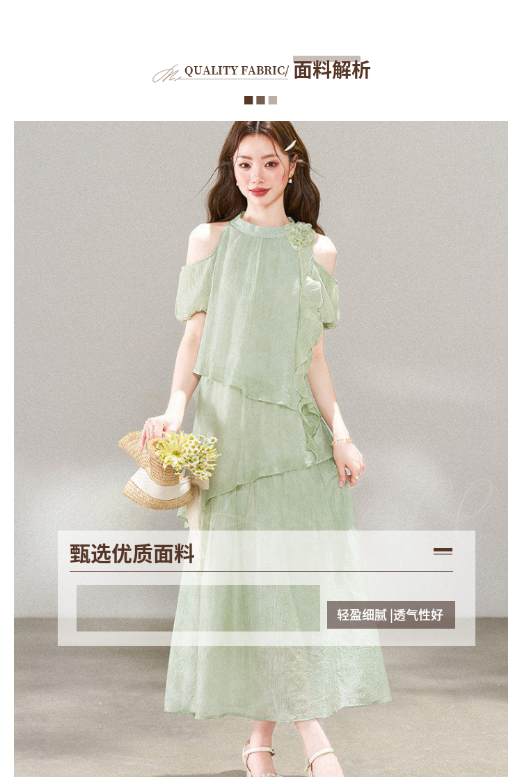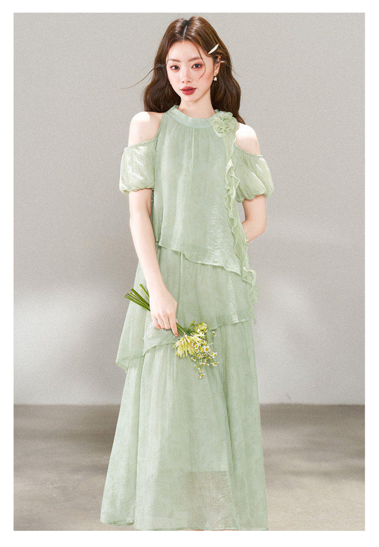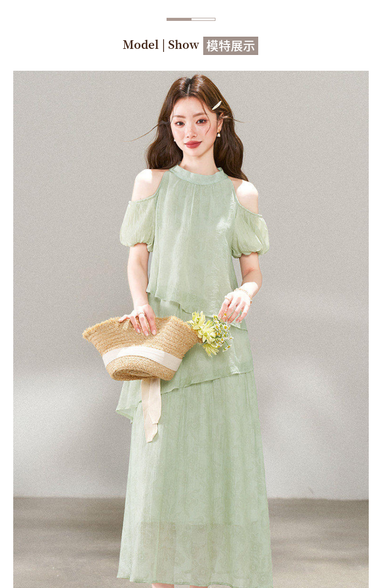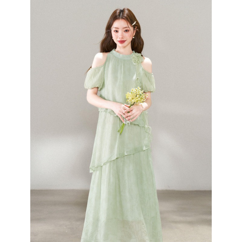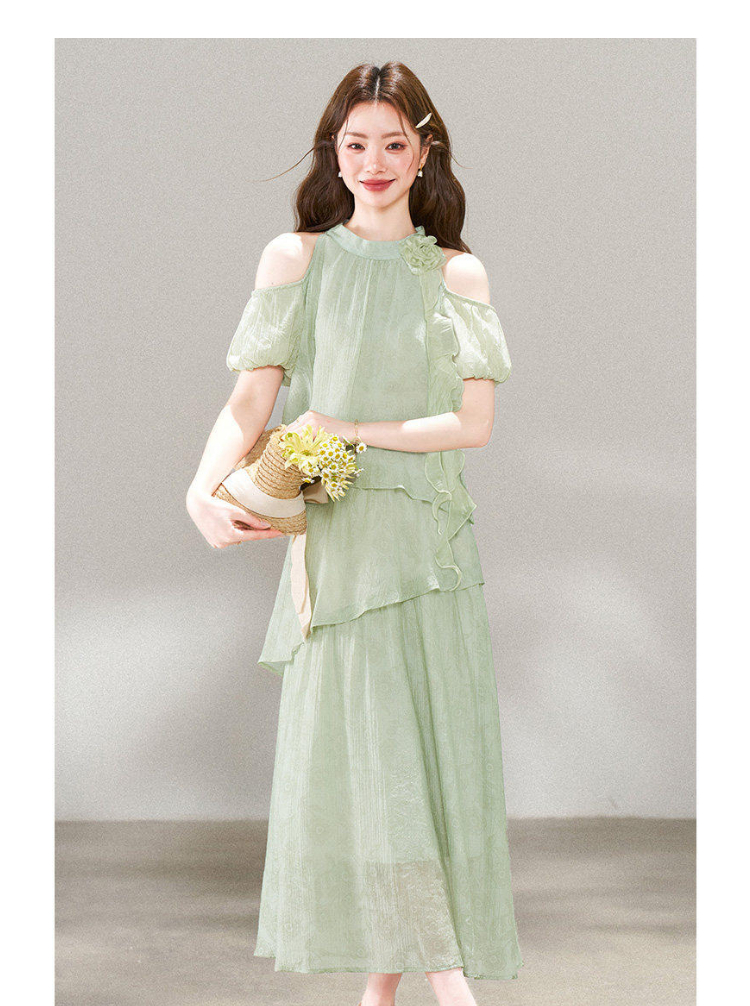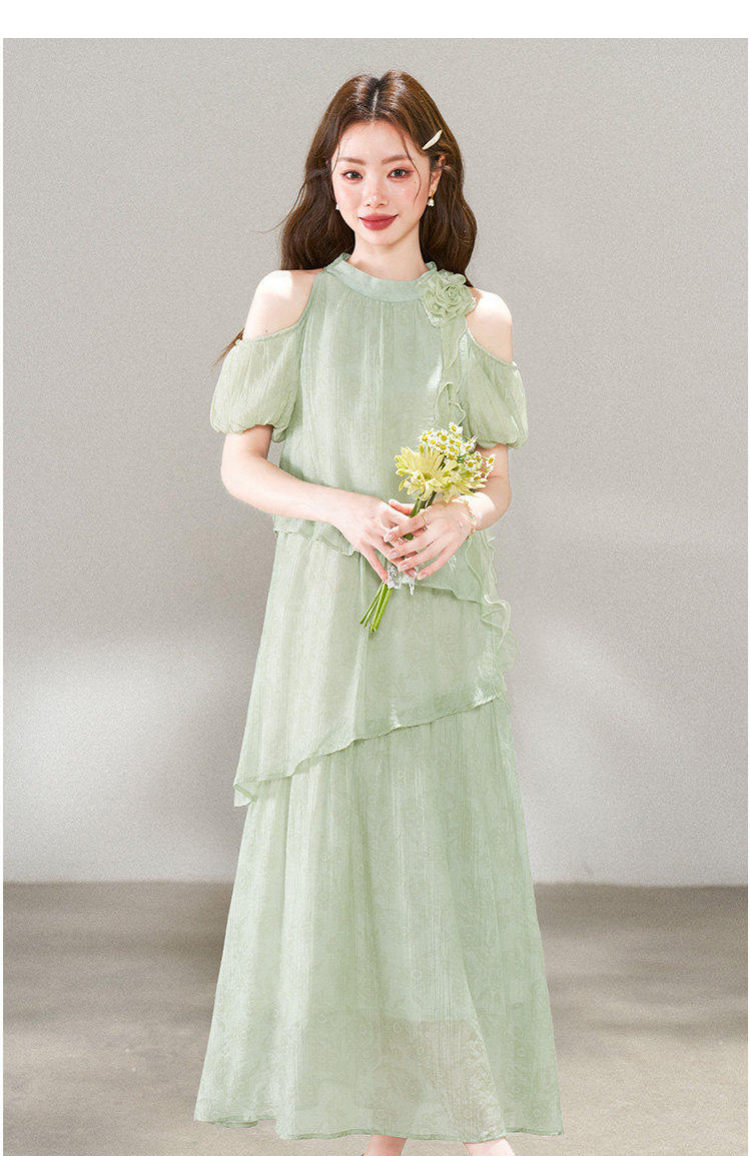 RY3815# 夏季新款法式度假风露肩挂脖绿色连衣裙海岛穿搭气质长裙