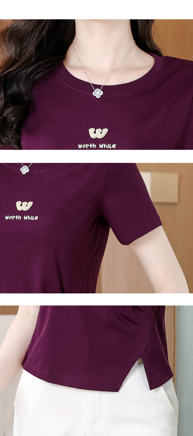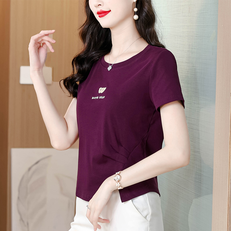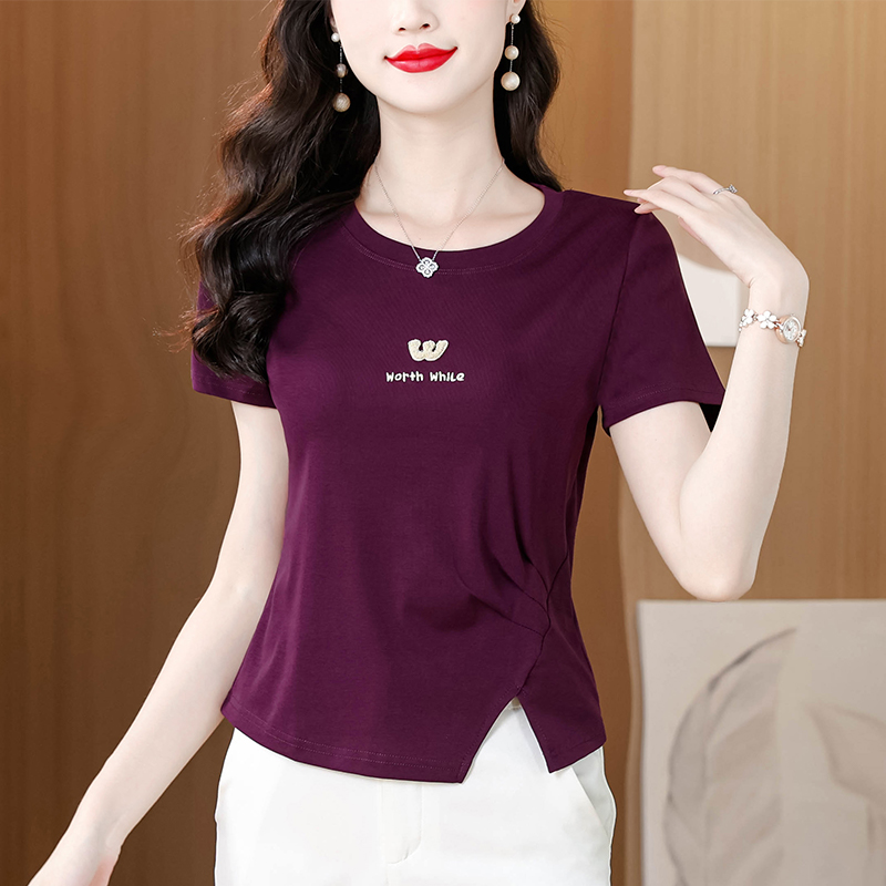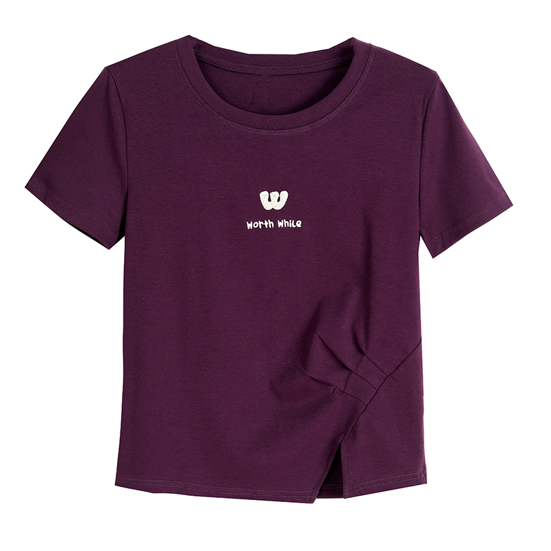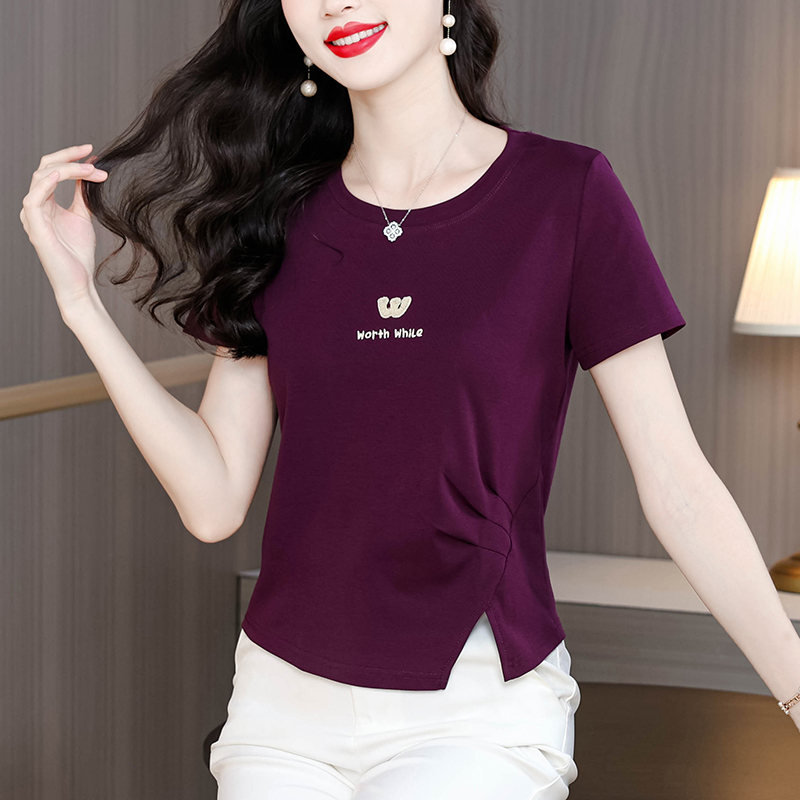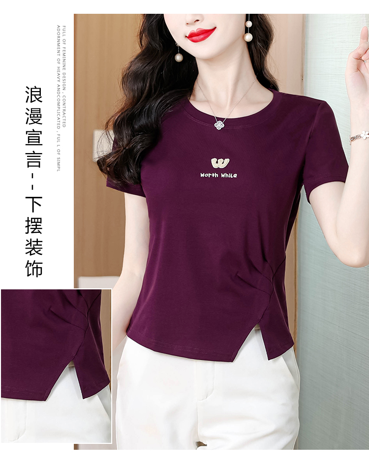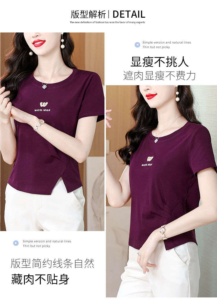 RY3852# 紫色圆领刺绣短袖T恤女2026夏装新款百搭显瘦别致洋气小个子上衣
