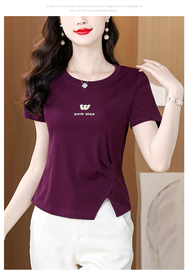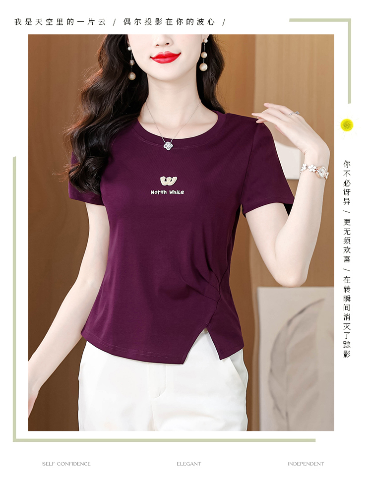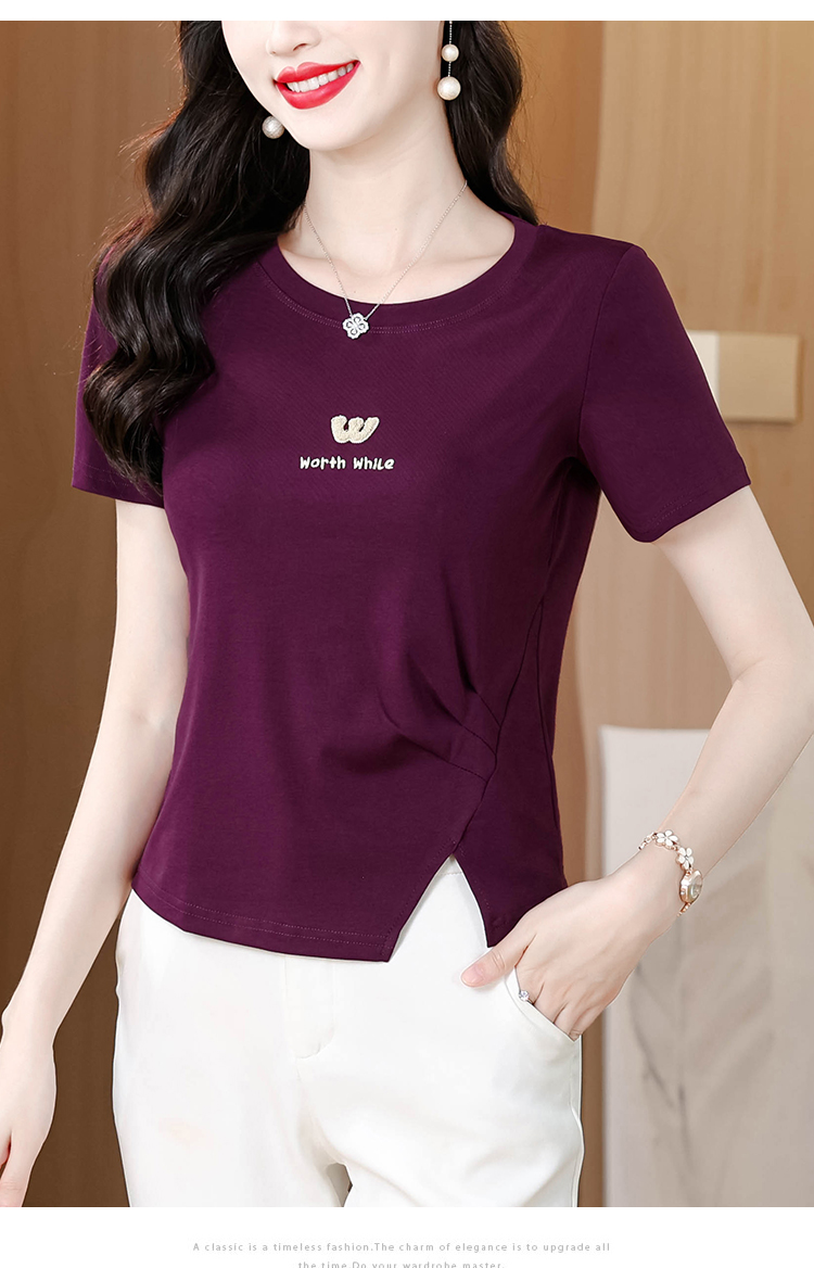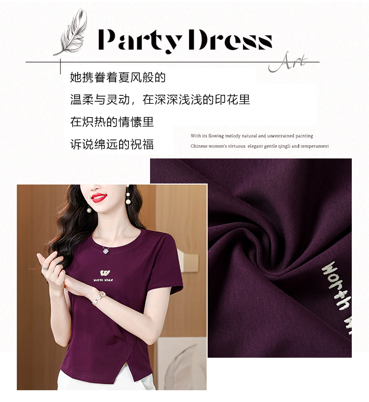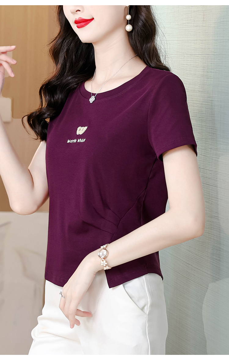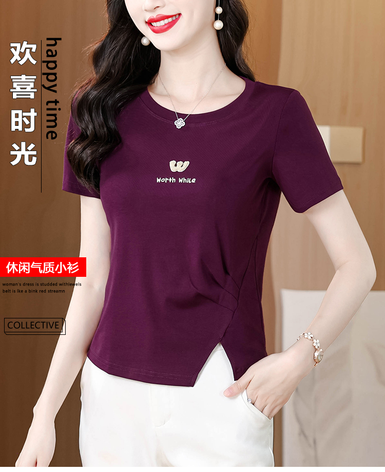 RY3852# 紫色圆领刺绣短袖T恤女2026夏装新款百搭显瘦别致洋气小个子上衣