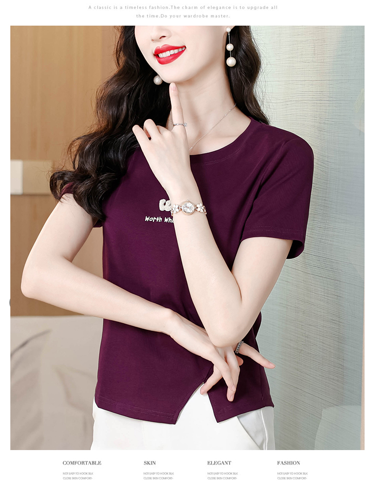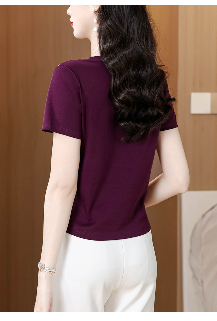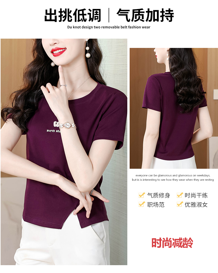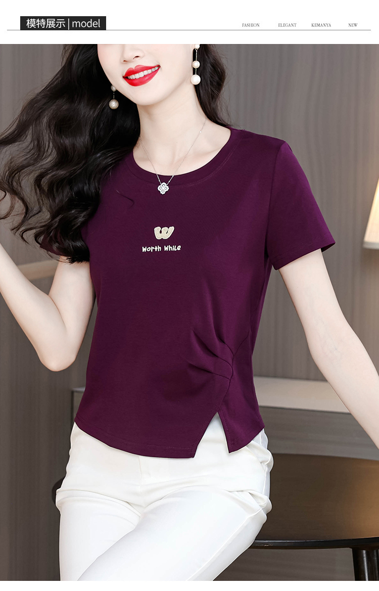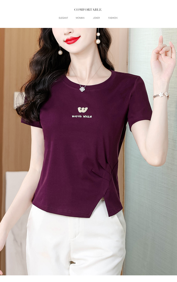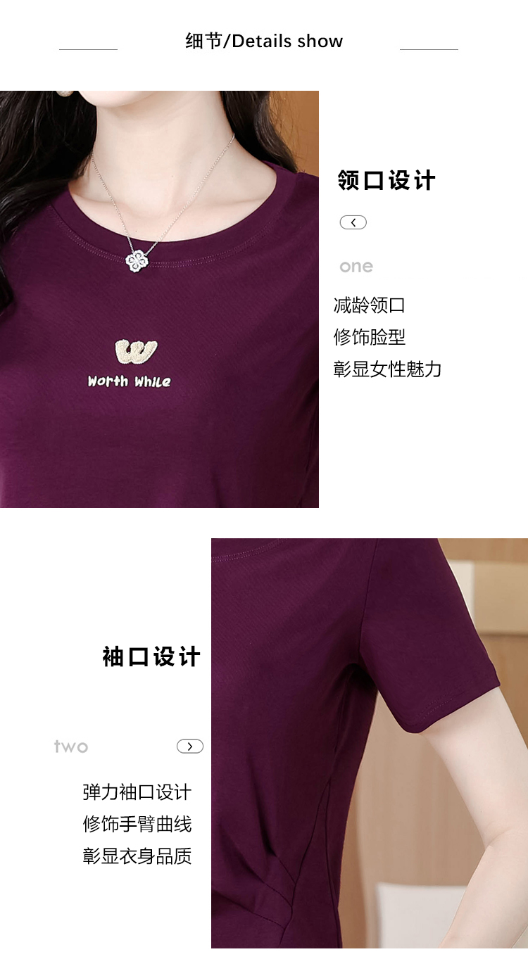 RY3852# 紫色圆领刺绣短袖T恤女2026夏装新款百搭显瘦别致洋气小个子上衣