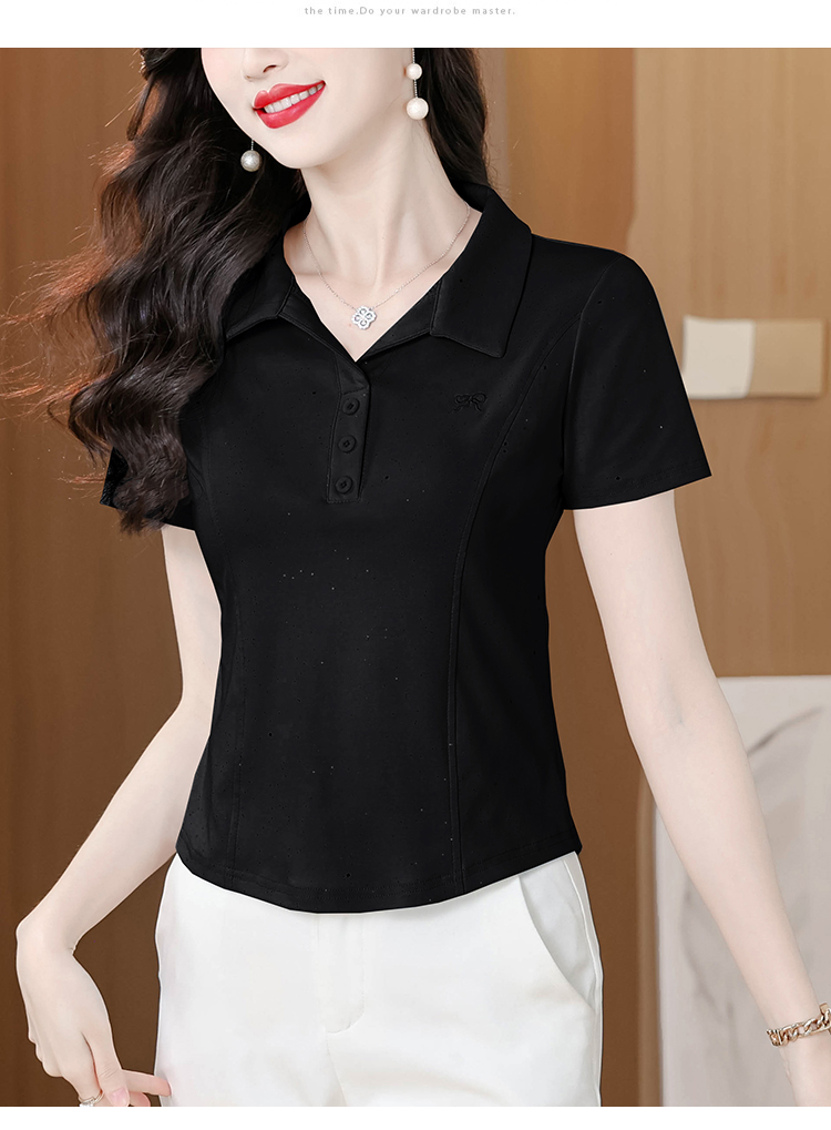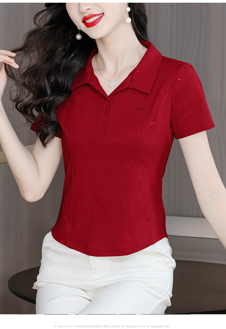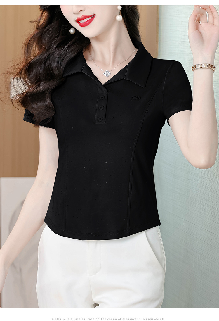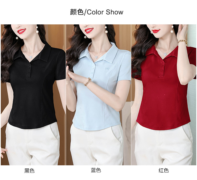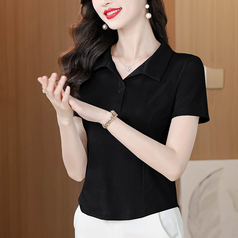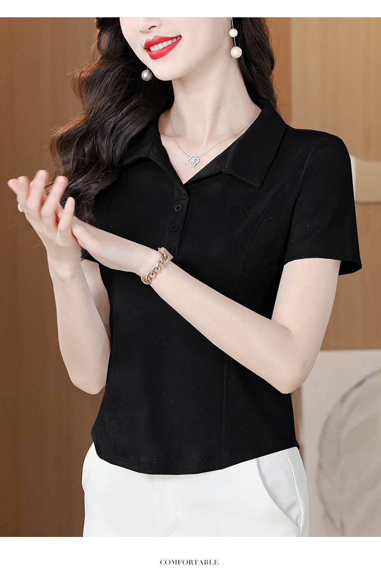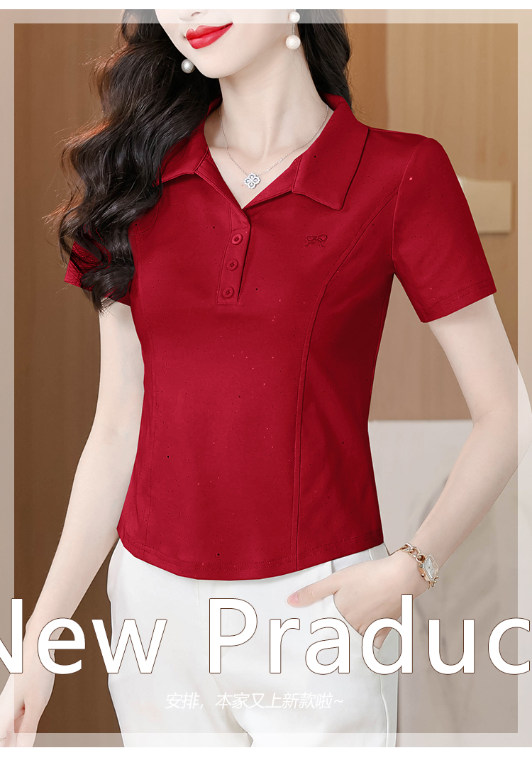 RY3853# 2026夏季新款翻领短袖T恤女绣花时尚纯色气质修身显瘦纯棉上衣