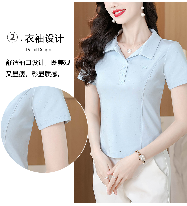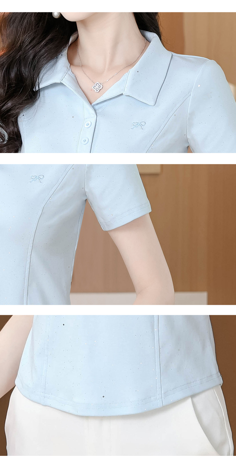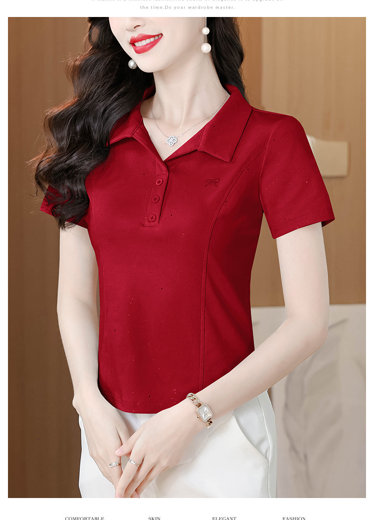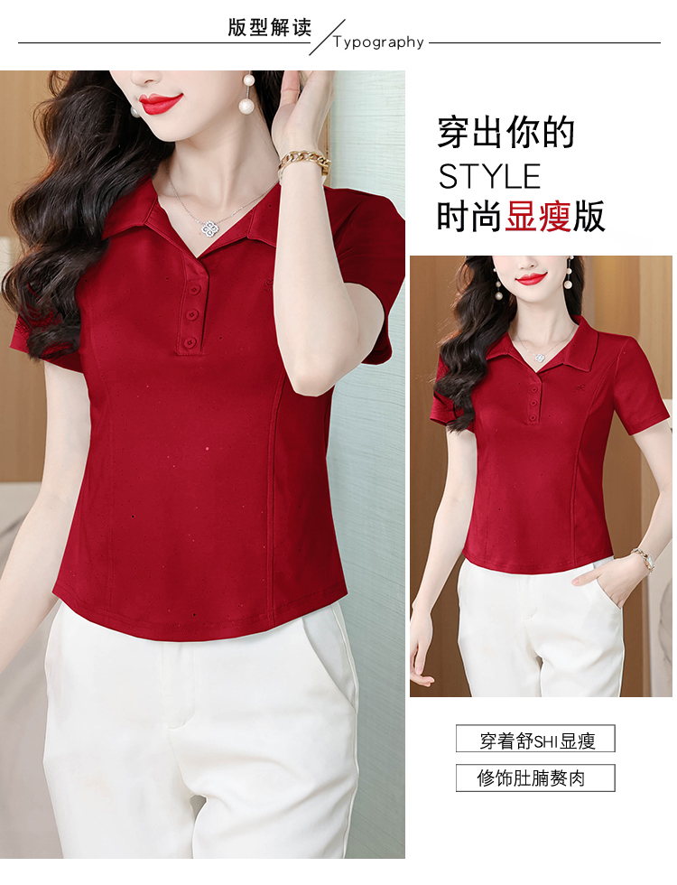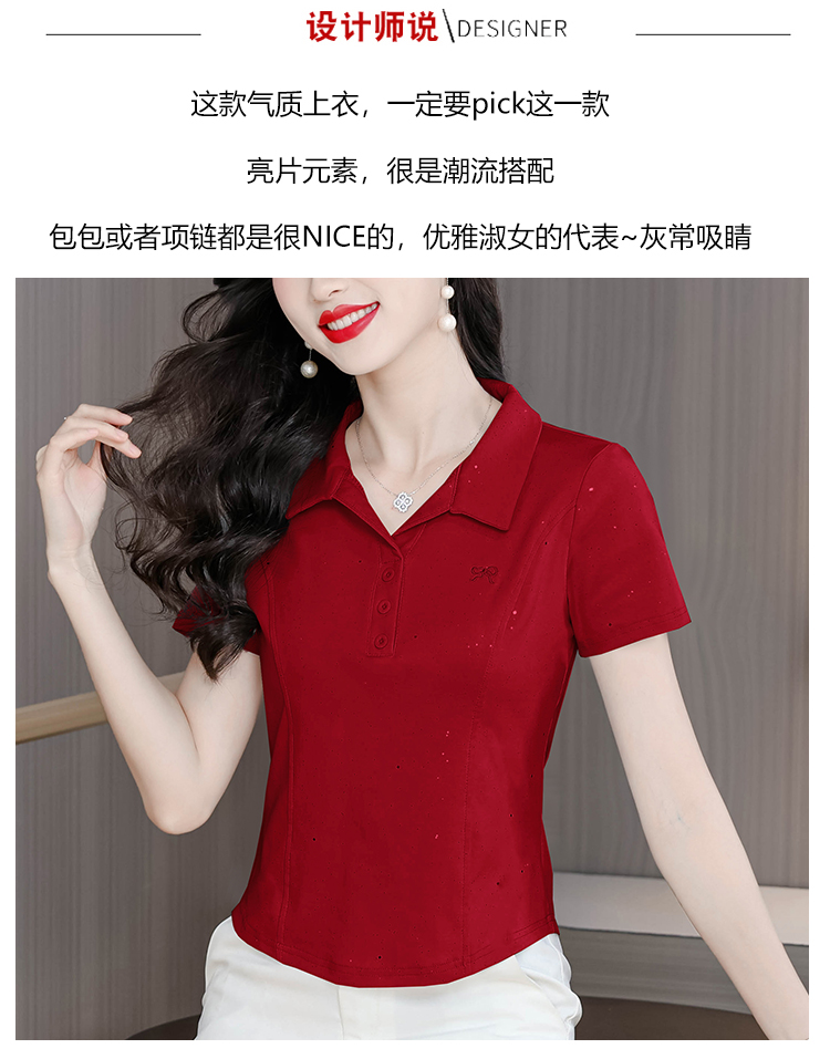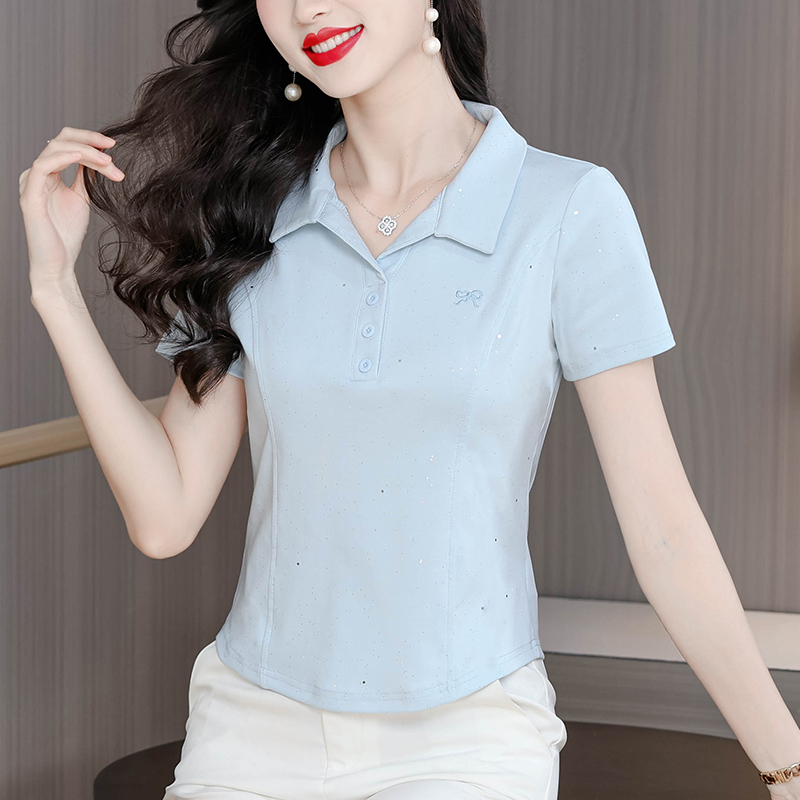 RY3853# 2026夏季新款翻领短袖T恤女绣花时尚纯色气质修身显瘦纯棉上衣