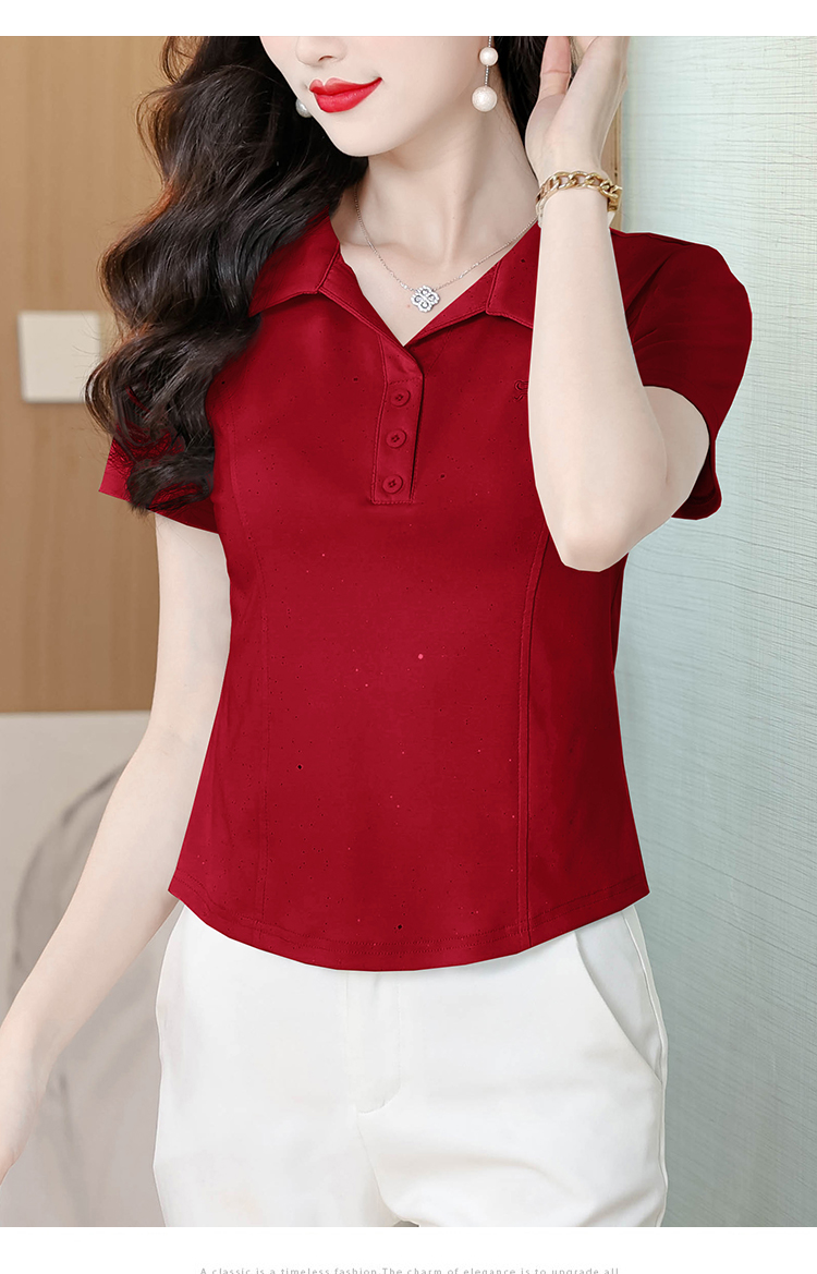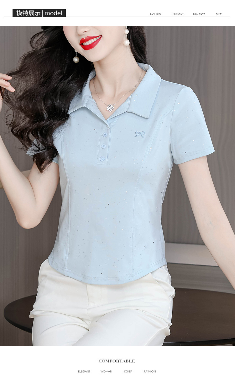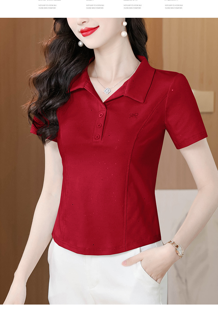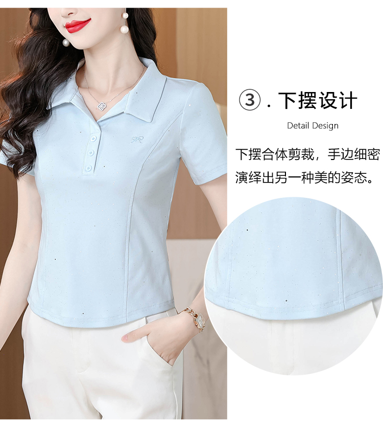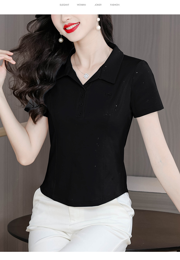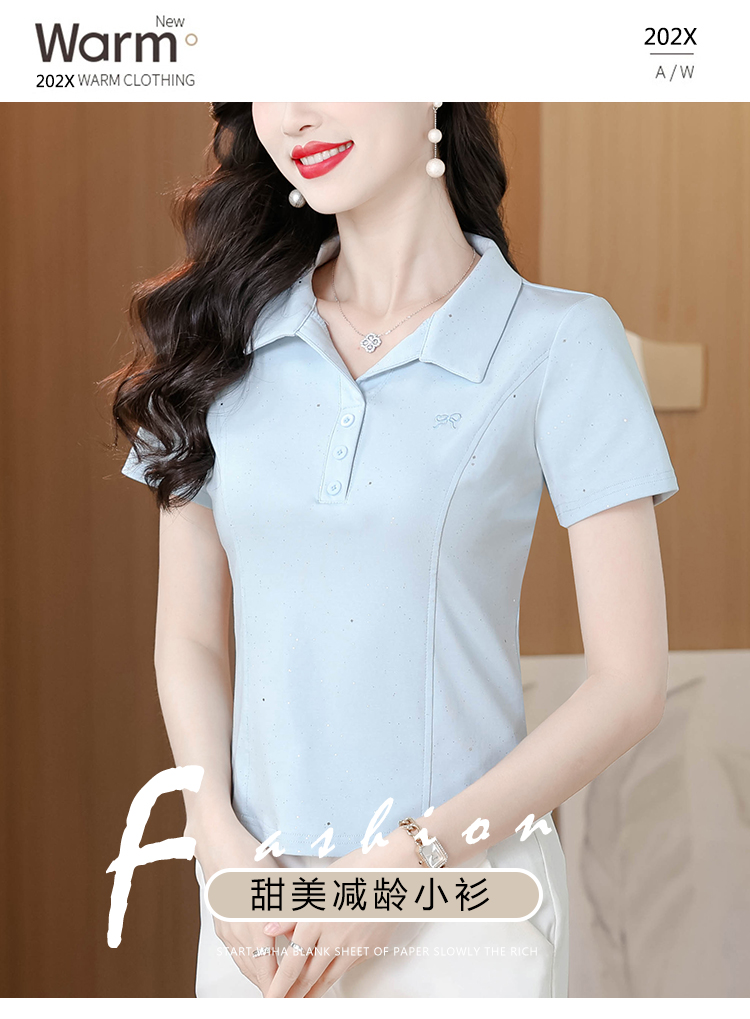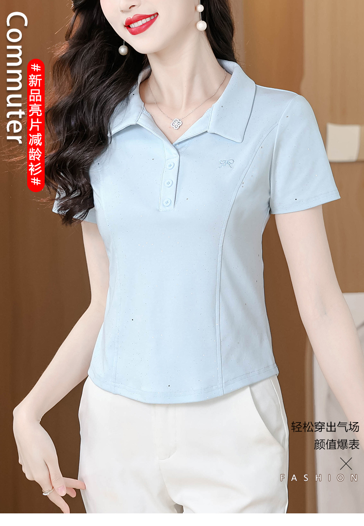 RY3853# 2026夏季新款翻领短袖T恤女绣花时尚纯色气质修身显瘦纯棉上衣