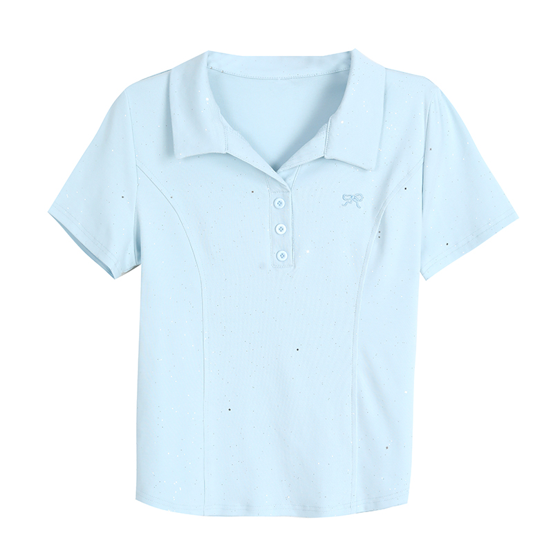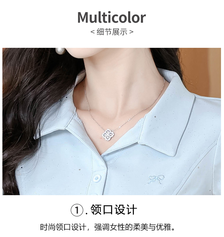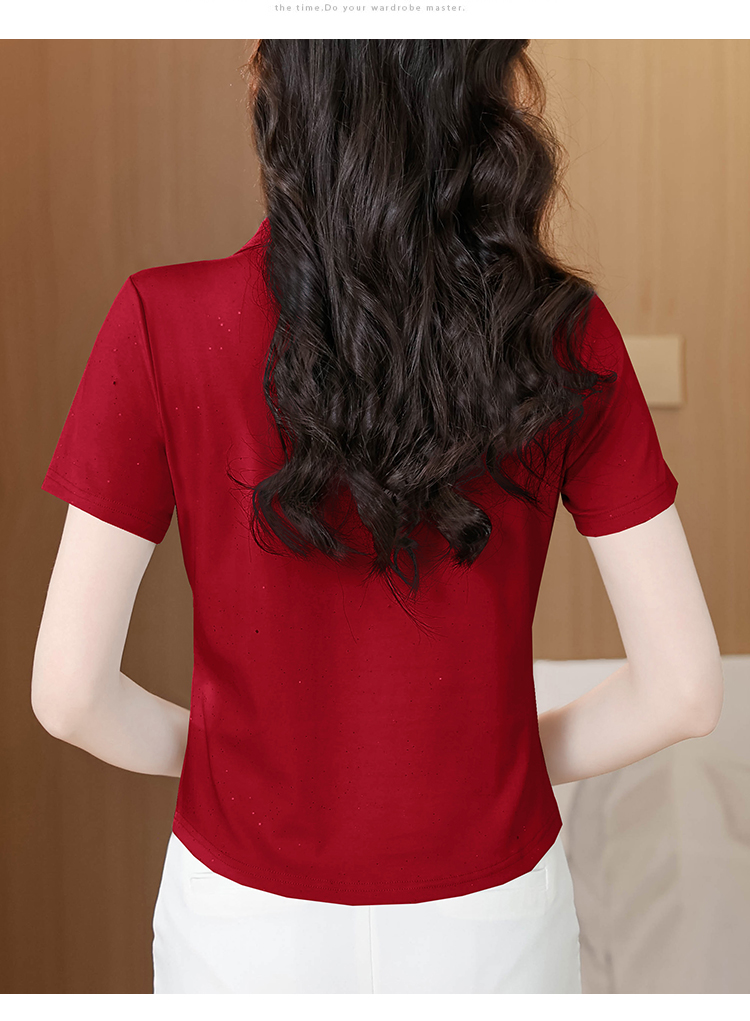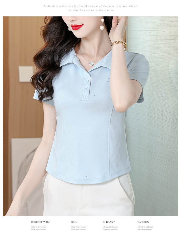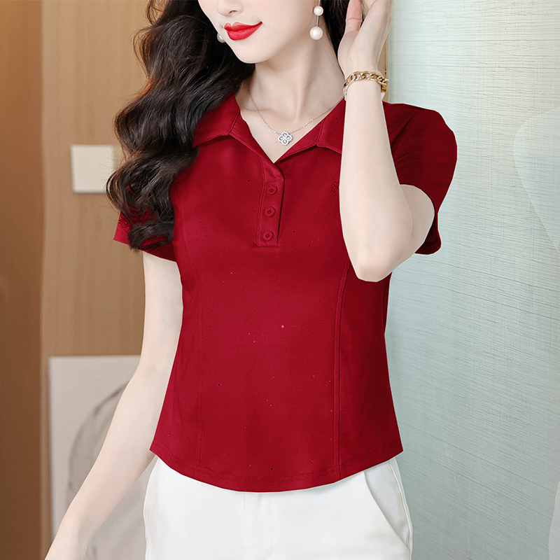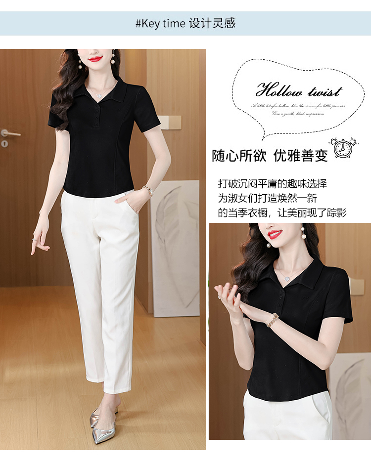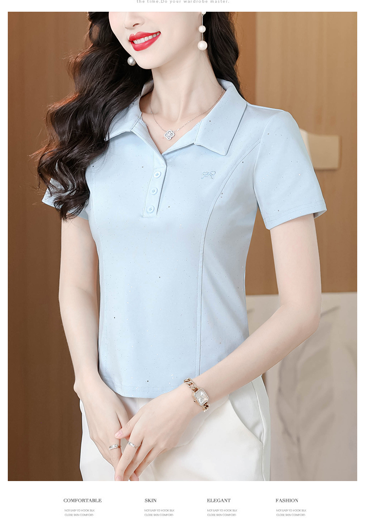 RY3853# 2026夏季新款翻领短袖T恤女绣花时尚纯色气质修身显瘦纯棉上衣