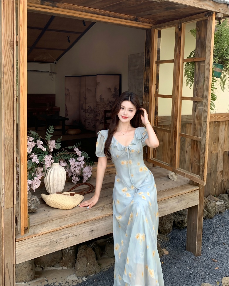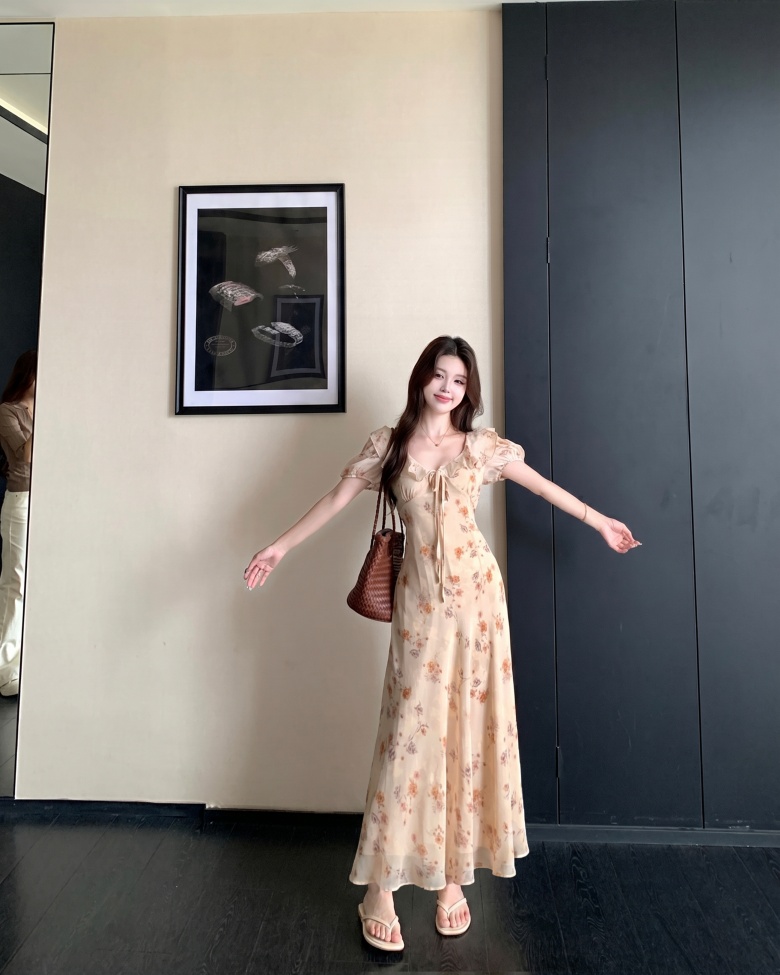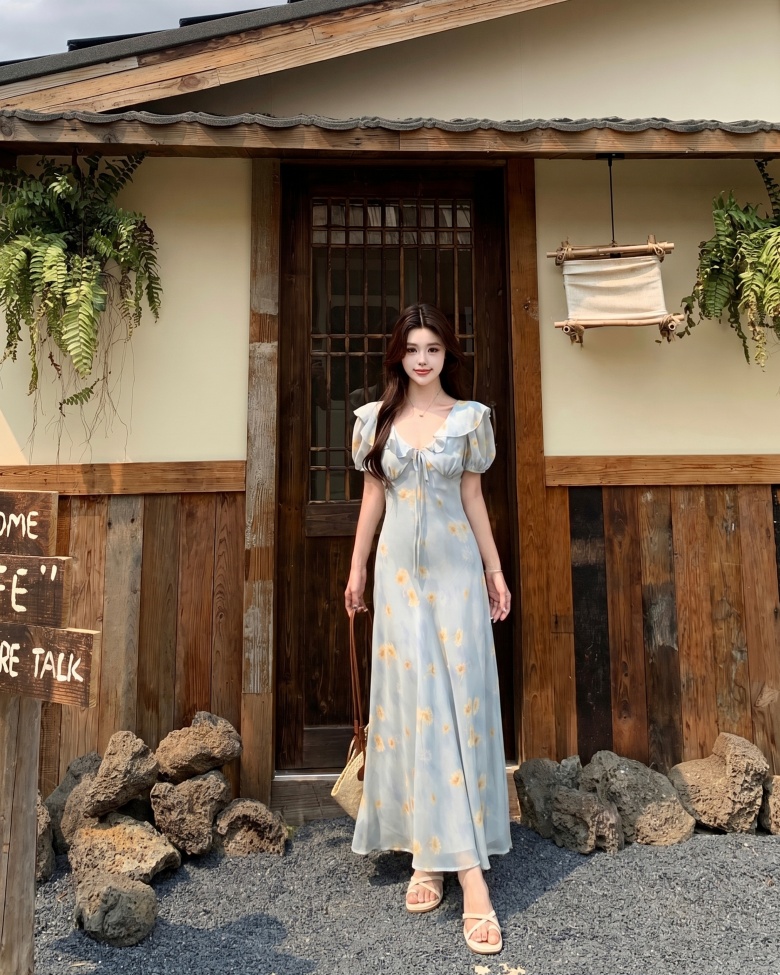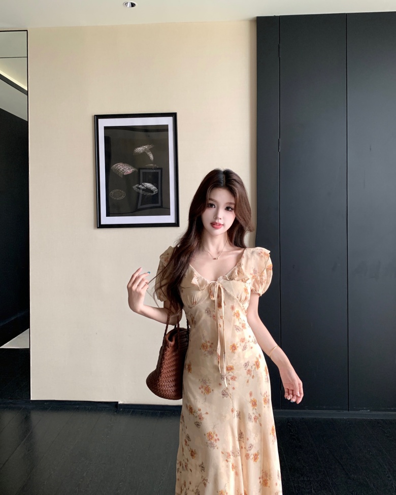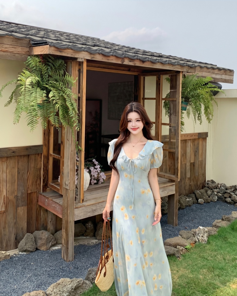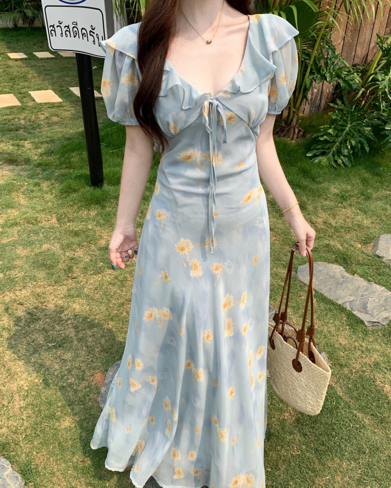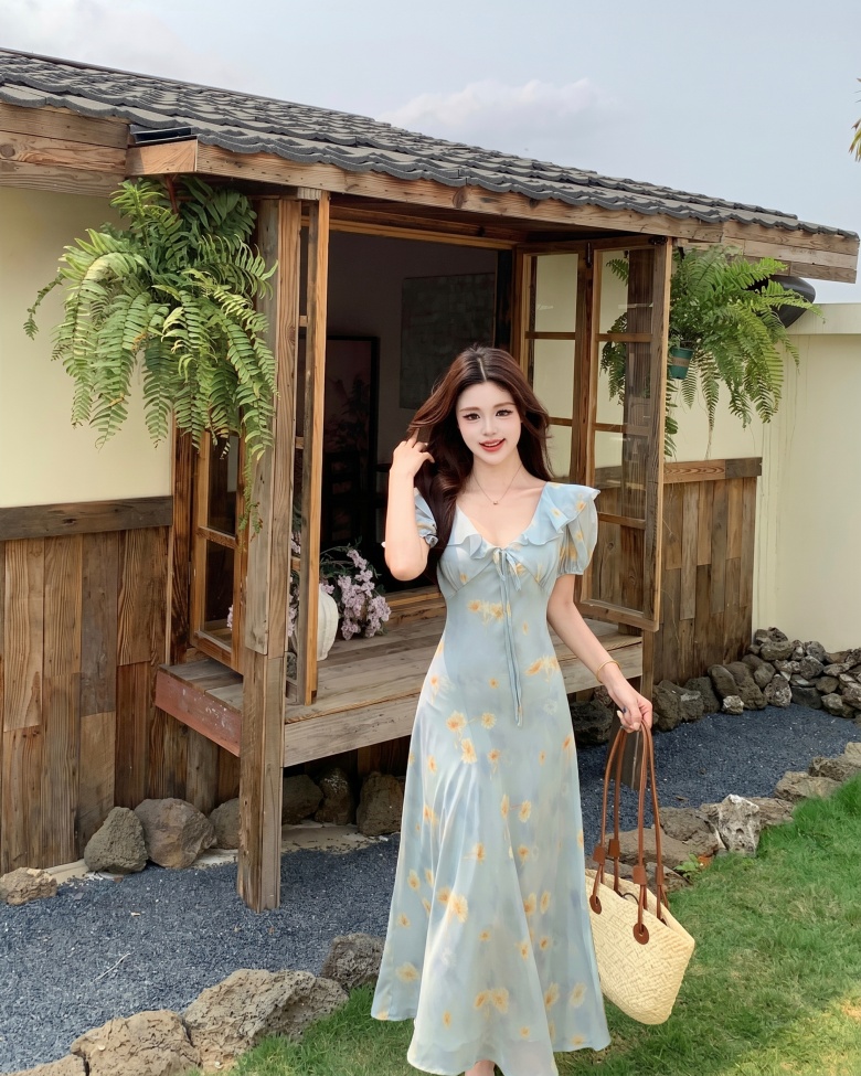 RY3865# 实拍 大码胖mm法式碎花荷叶领短袖连衣裙高腰遮肉显瘦气质长裙