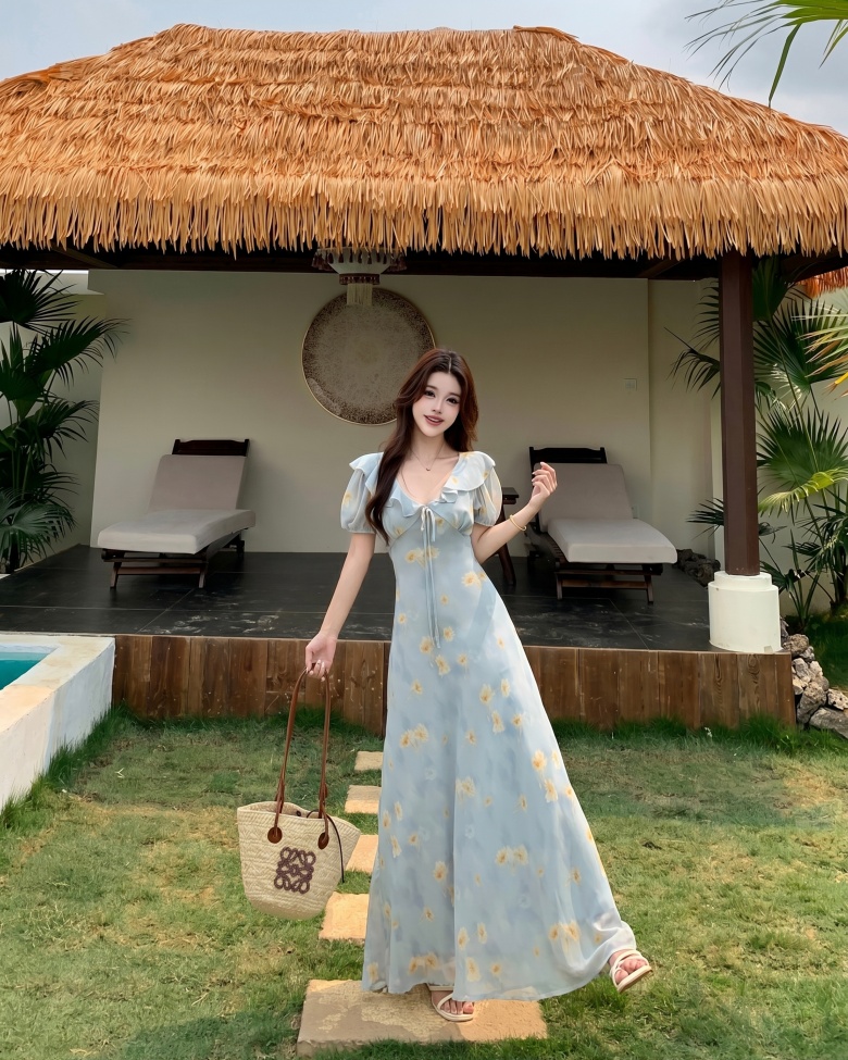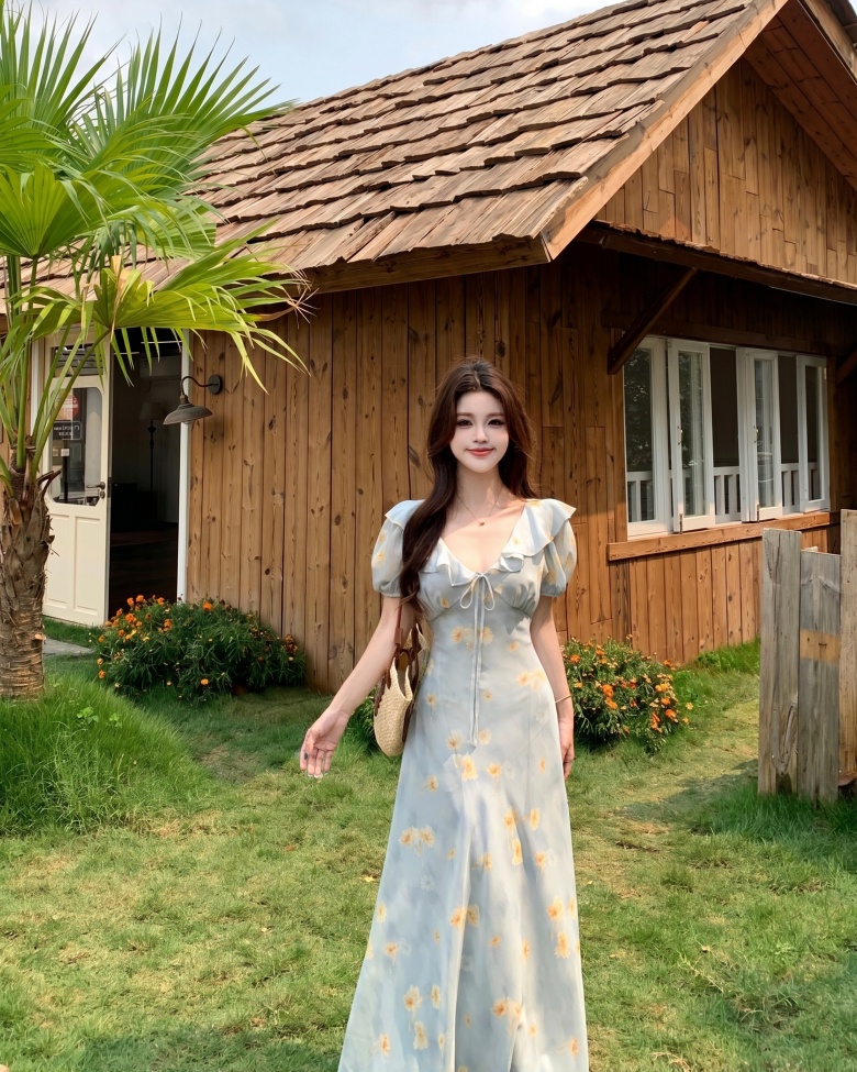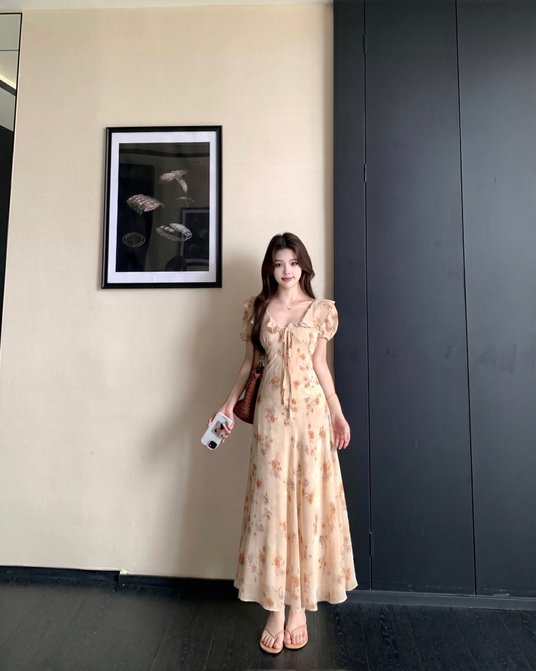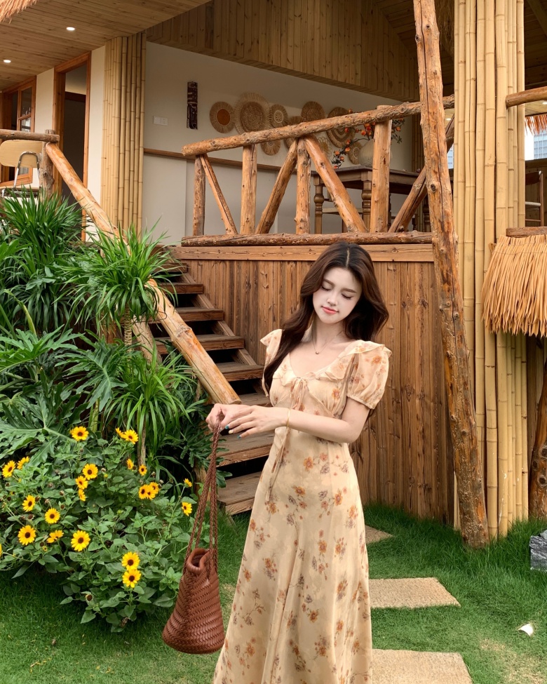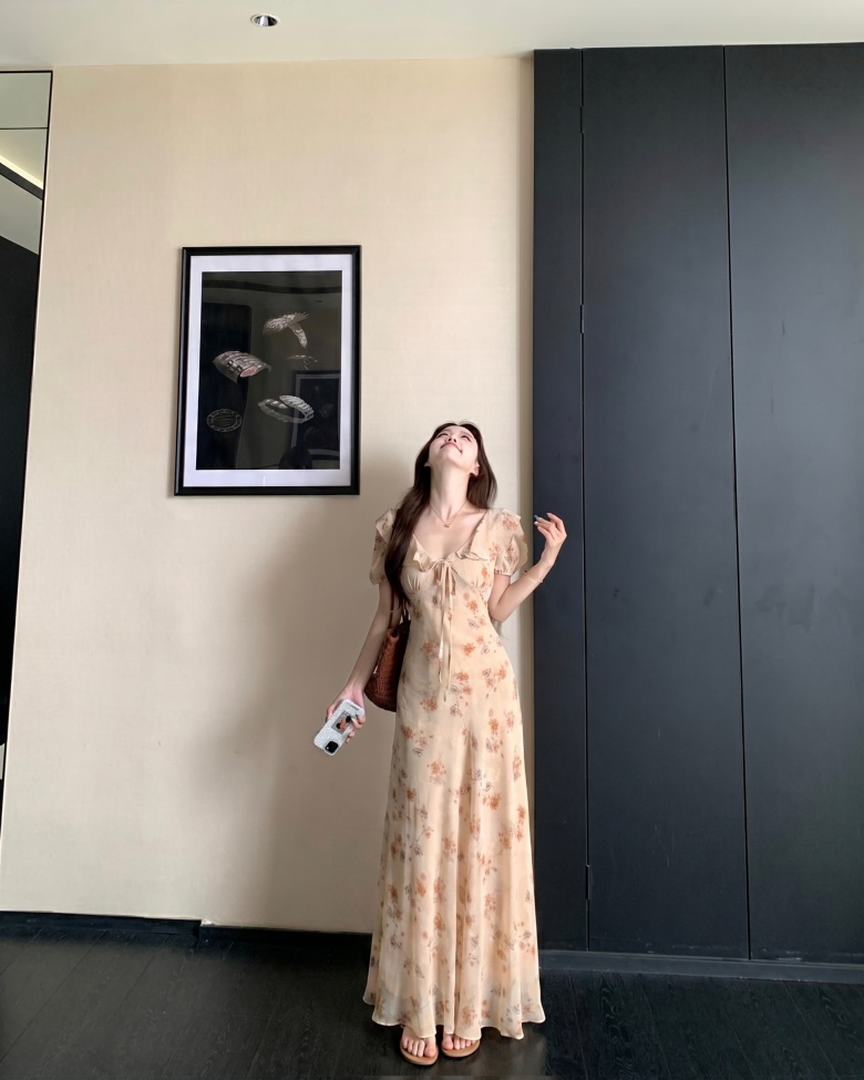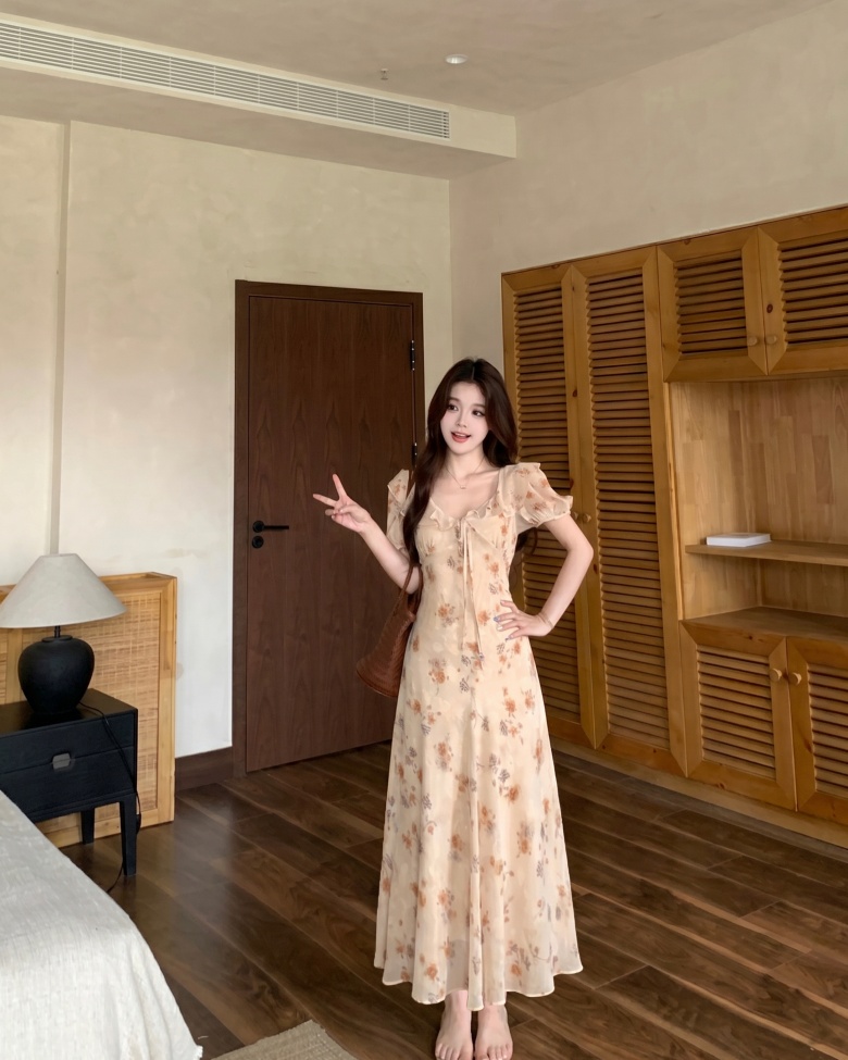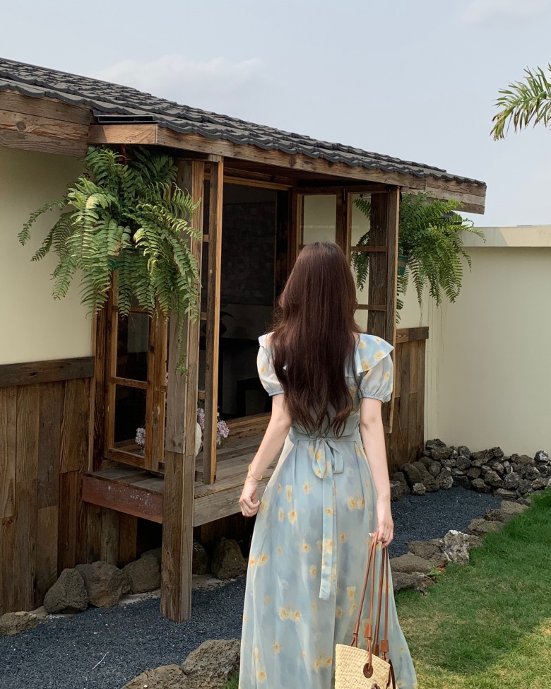 RY3865# 实拍 大码胖mm法式碎花荷叶领短袖连衣裙高腰遮肉显瘦气质长裙