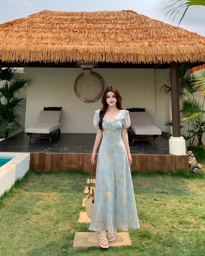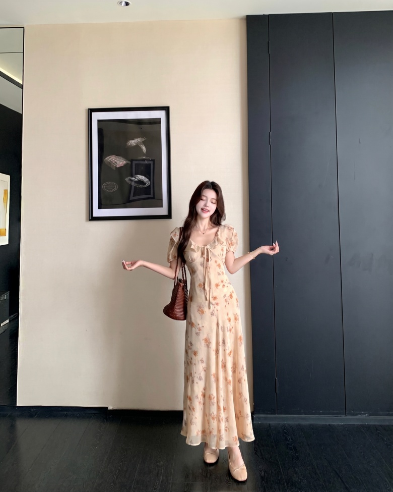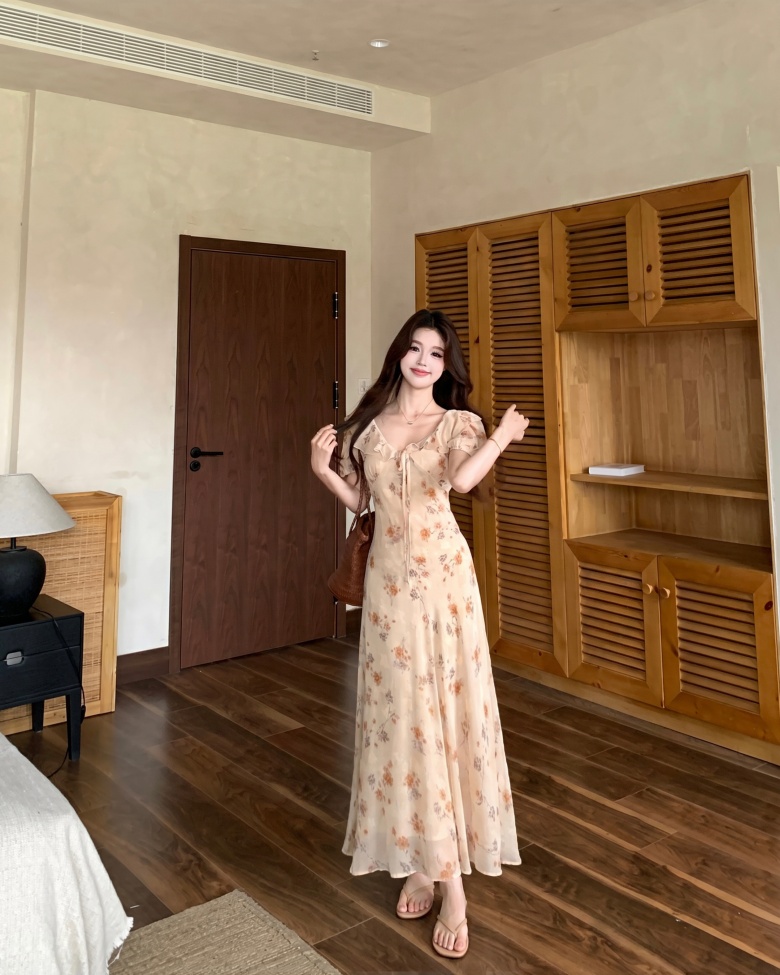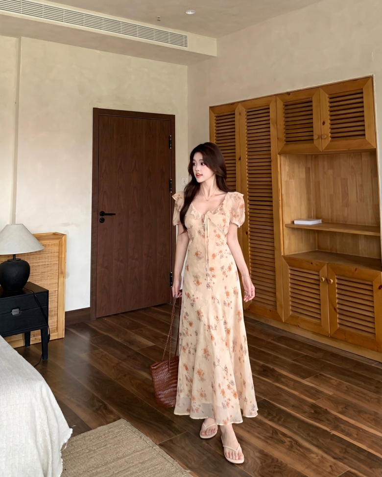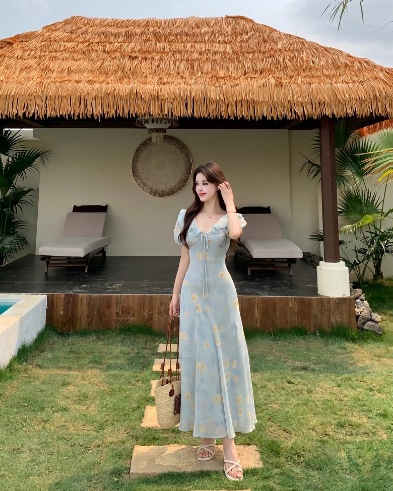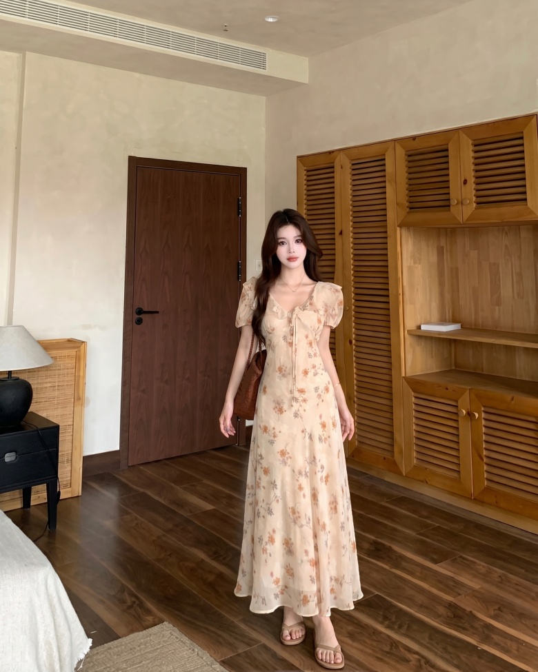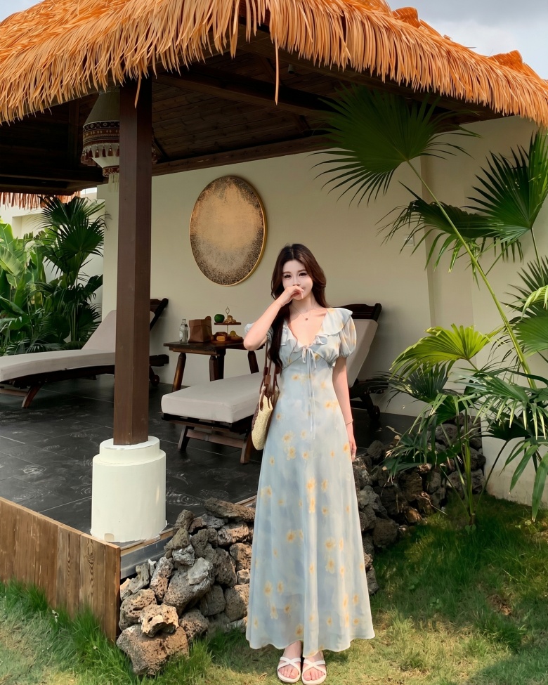 RY3865# 实拍 大码胖mm法式碎花荷叶领短袖连衣裙高腰遮肉显瘦气质长裙