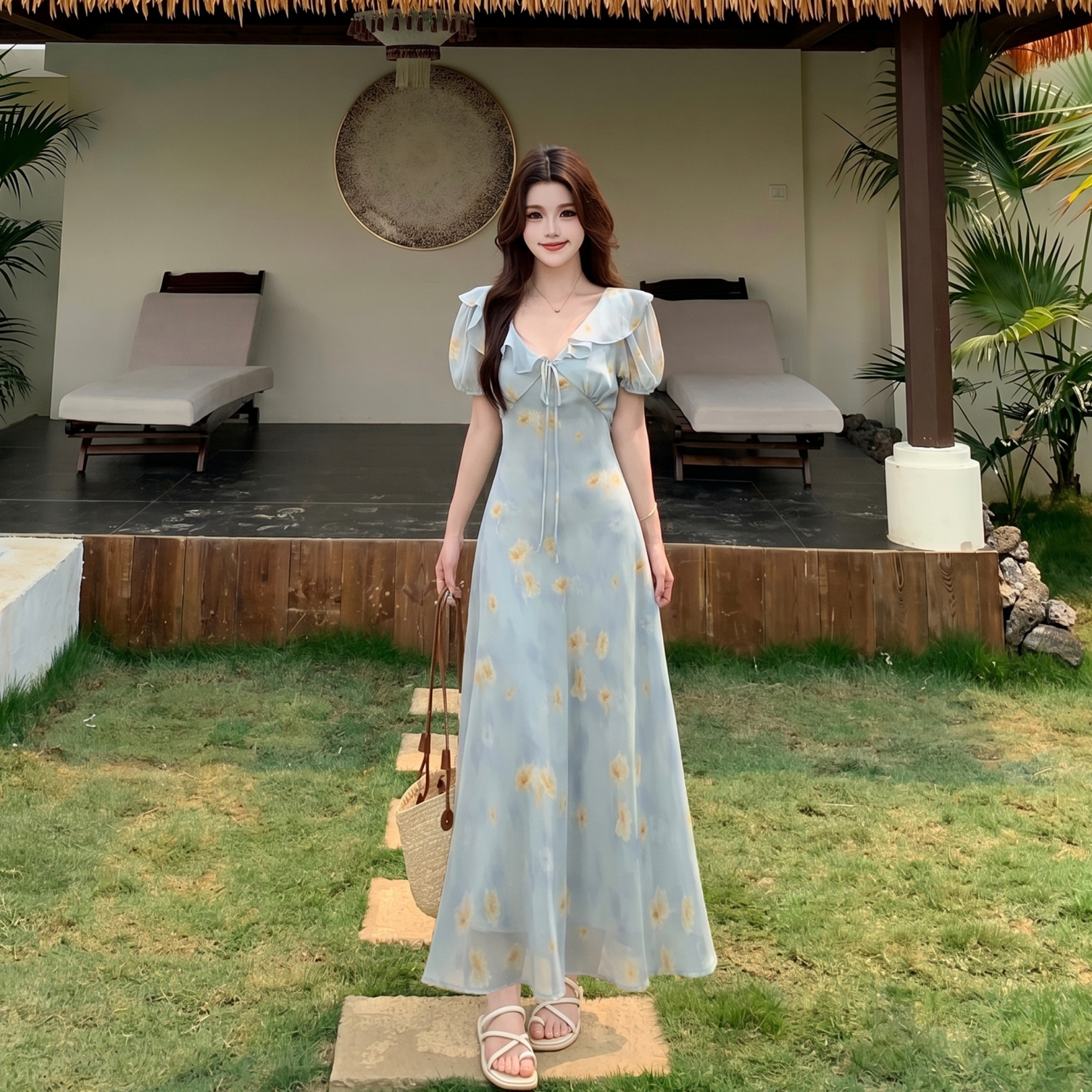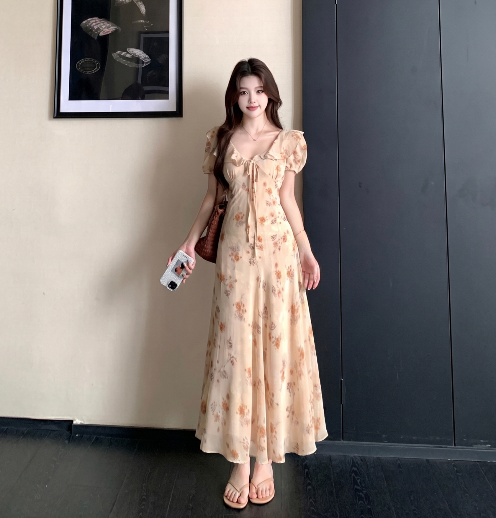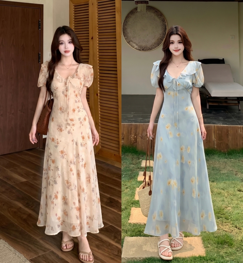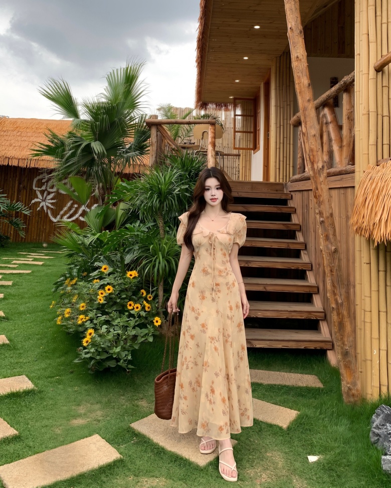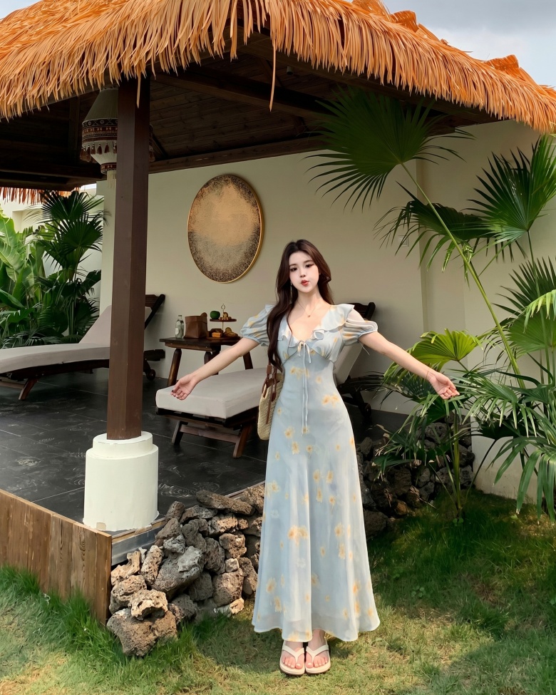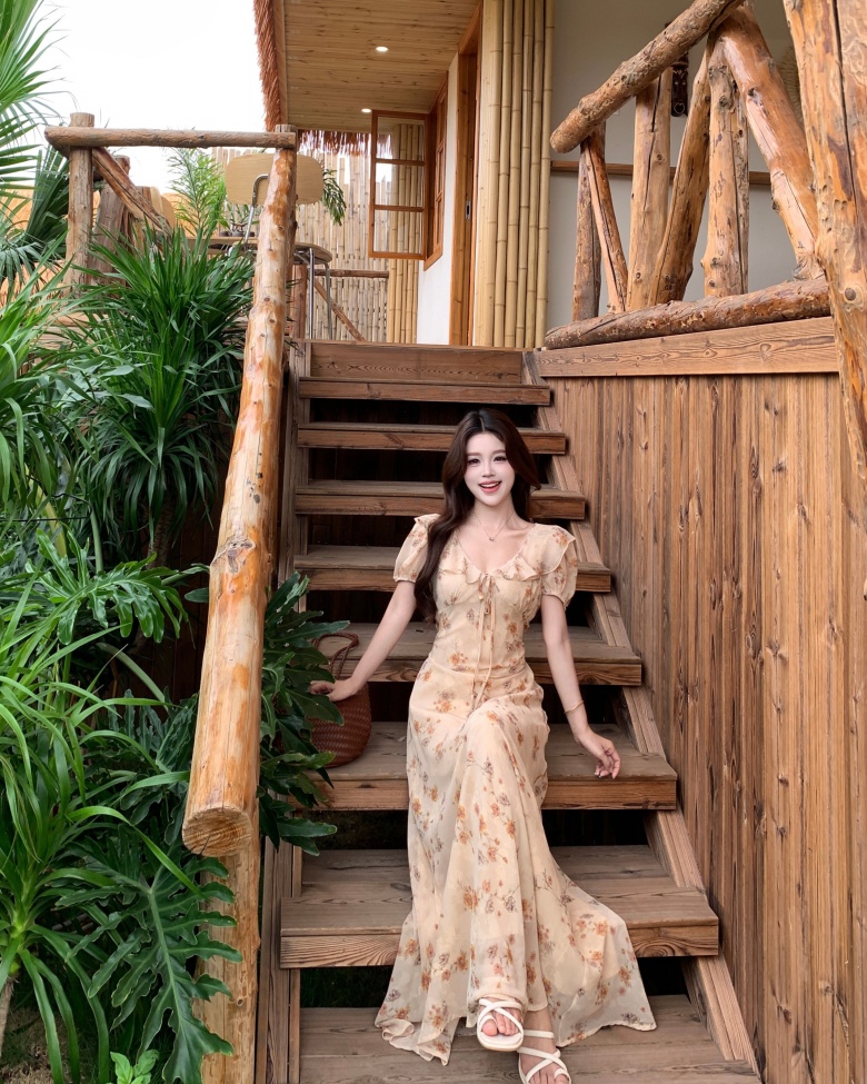RY3865# 实拍 大码胖mm法式碎花荷叶领短袖连衣裙高腰遮肉显瘦气质长裙