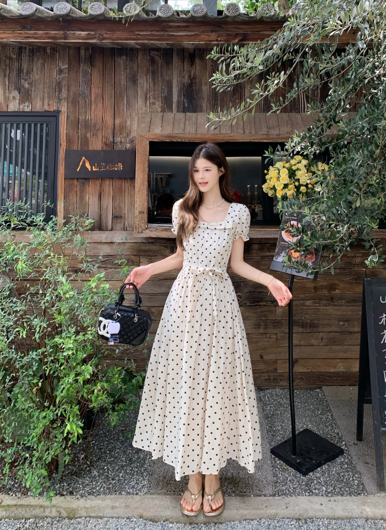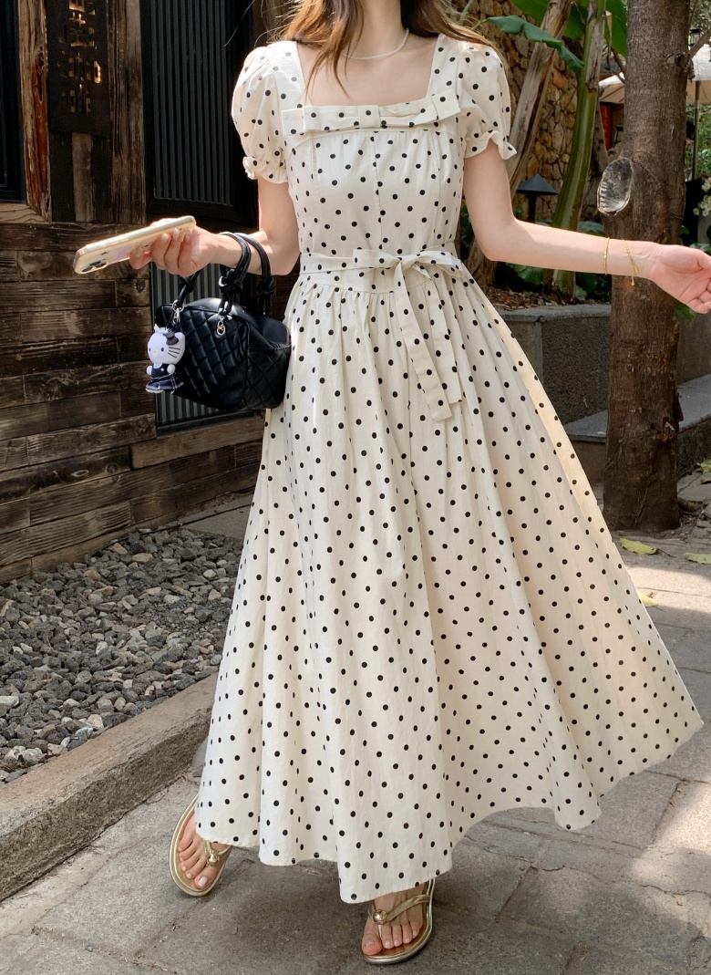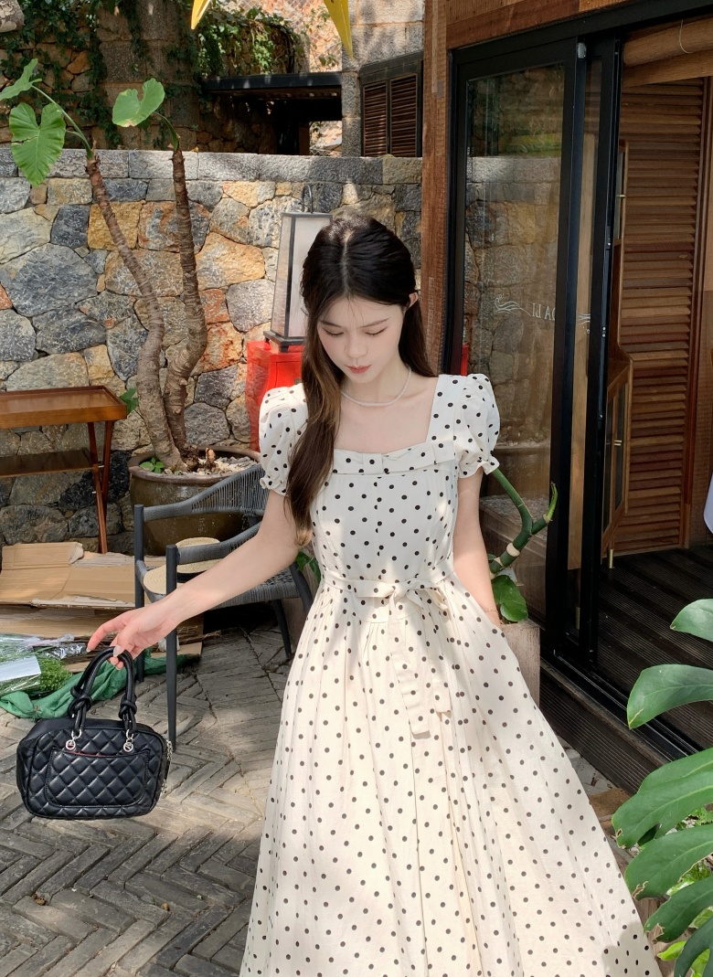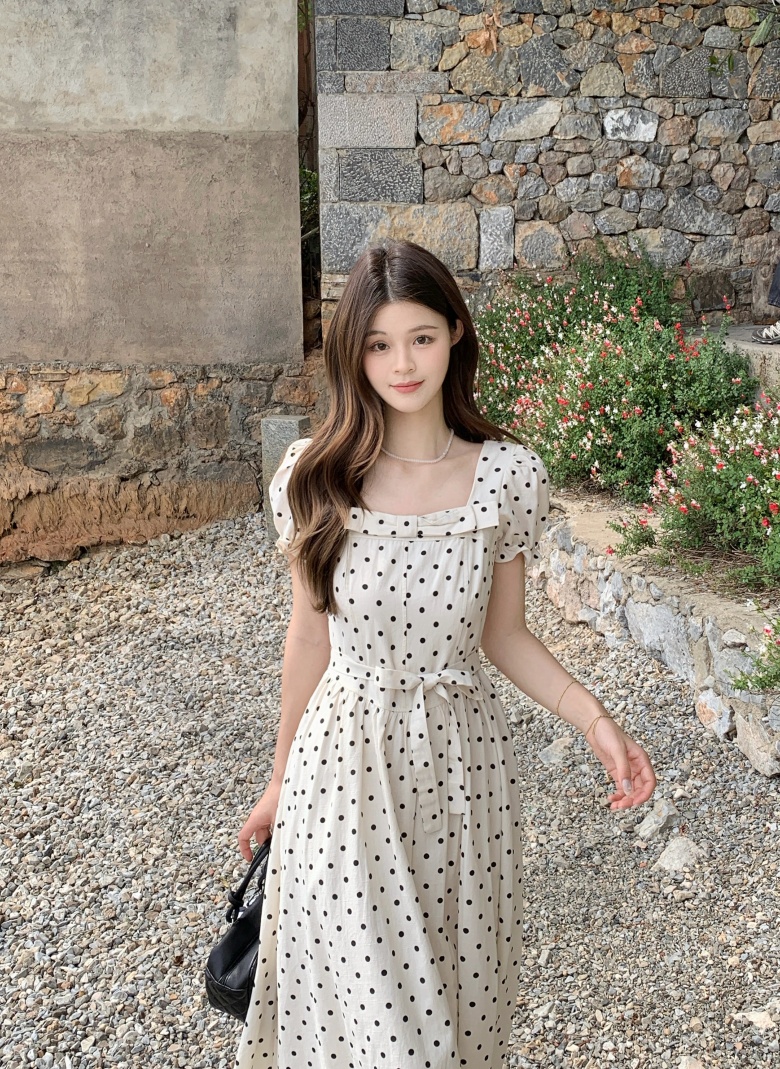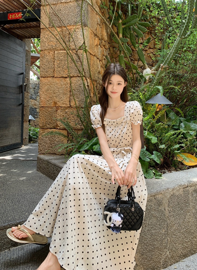 RY3867# 实拍 大码胖mm高级感气质波点方领短袖连衣裙高腰遮肉显瘦长裙
