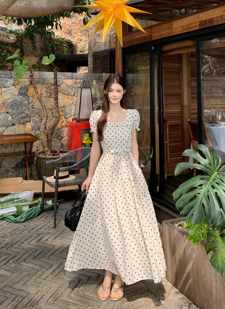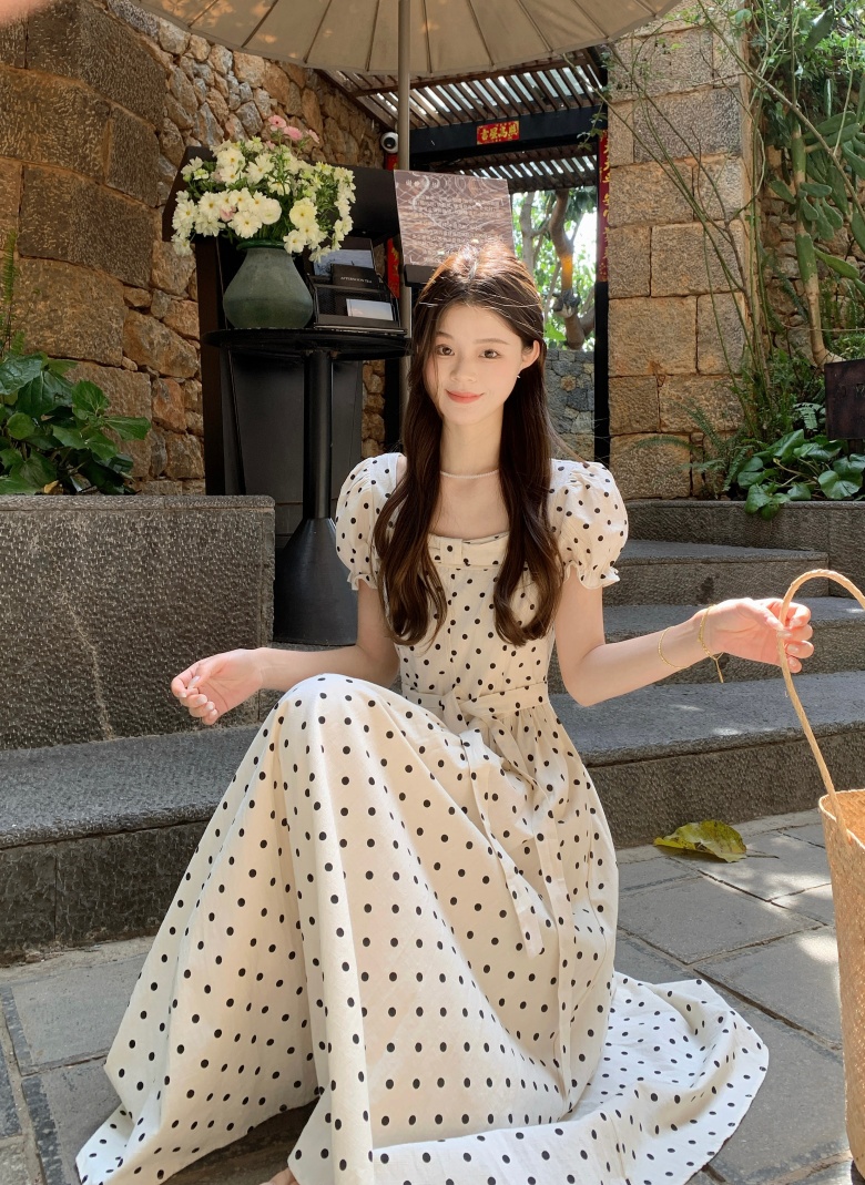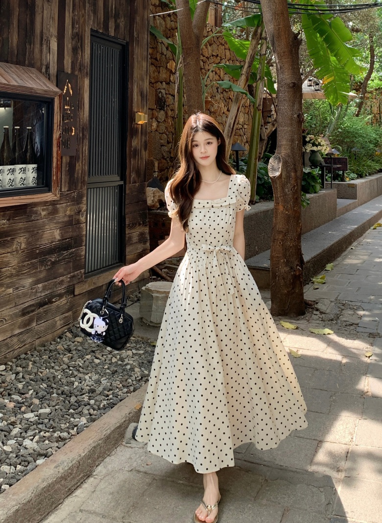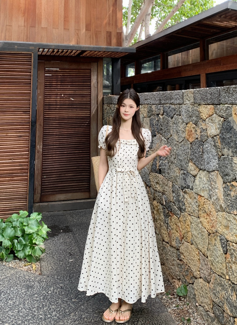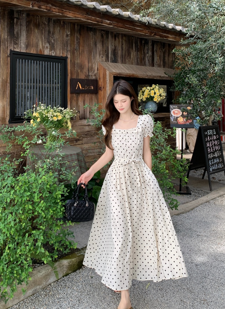 RY3867# 实拍 大码胖mm高级感气质波点方领短袖连衣裙高腰遮肉显瘦长裙