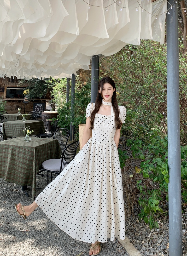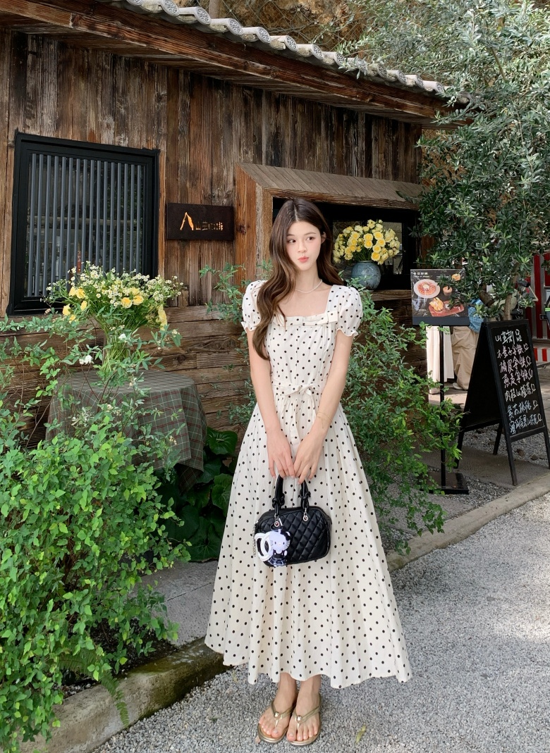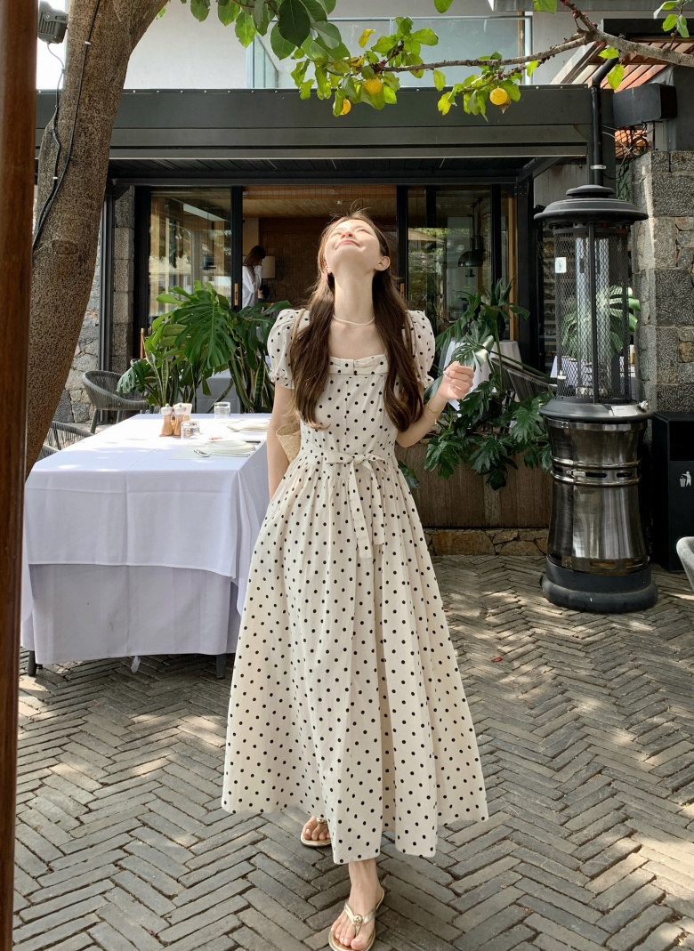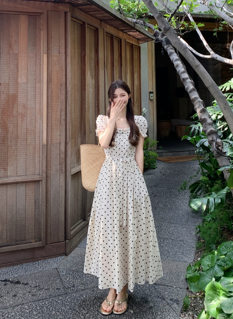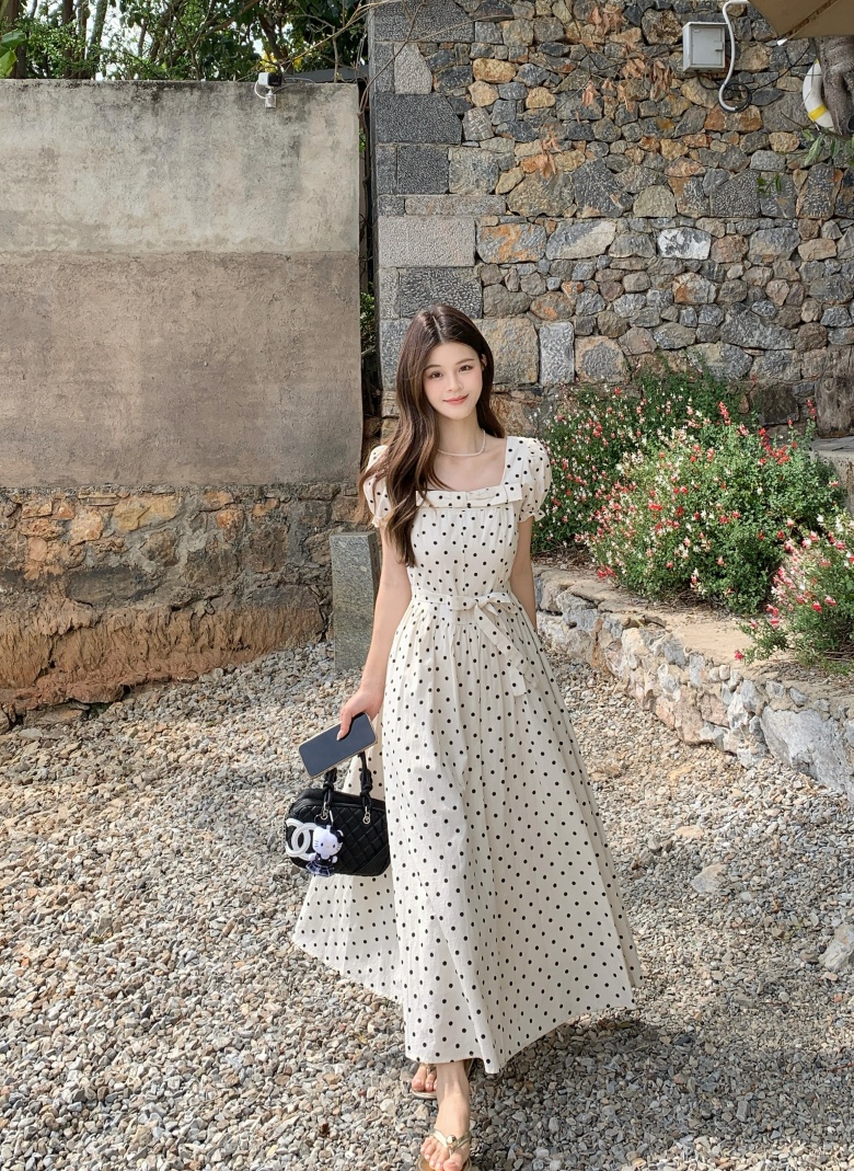 RY3867# 实拍 大码胖mm高级感气质波点方领短袖连衣裙高腰遮肉显瘦长裙
