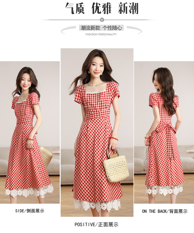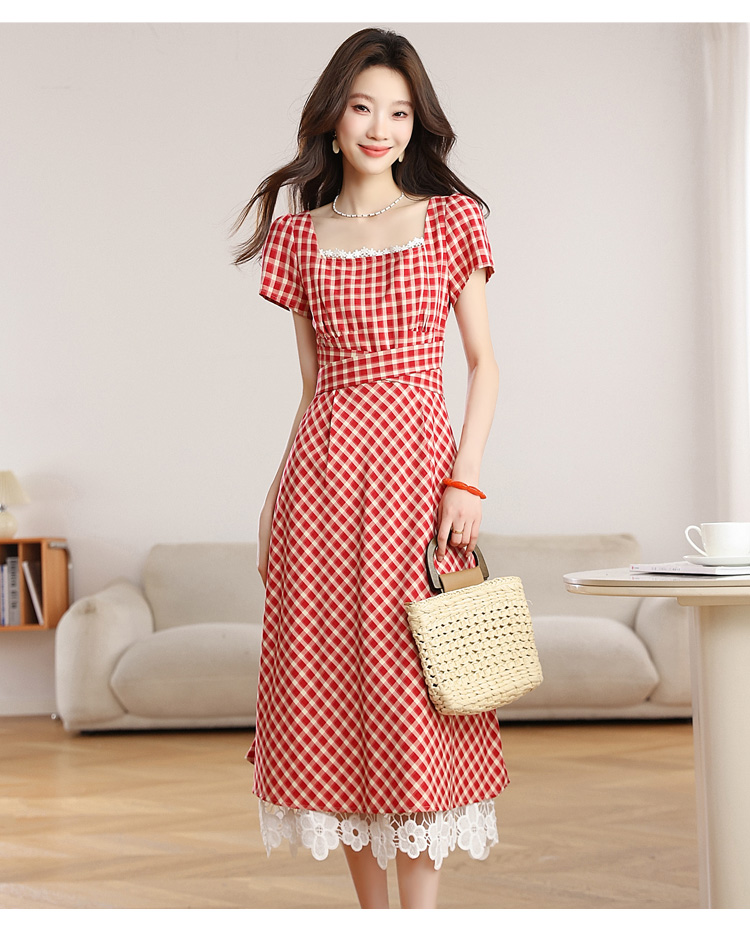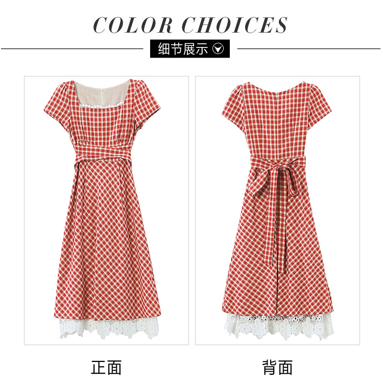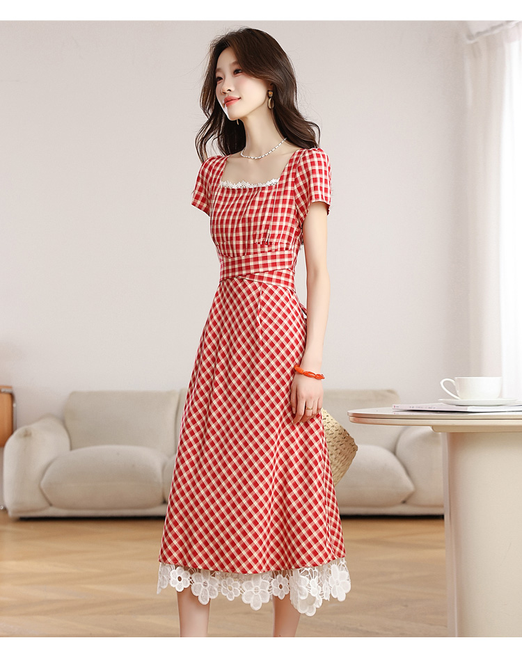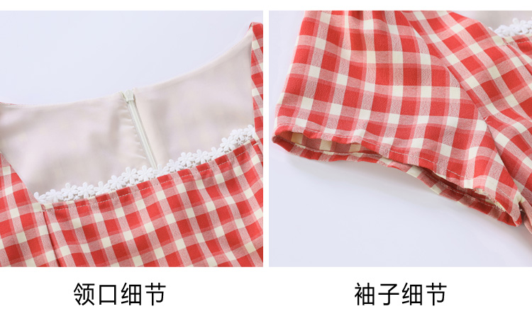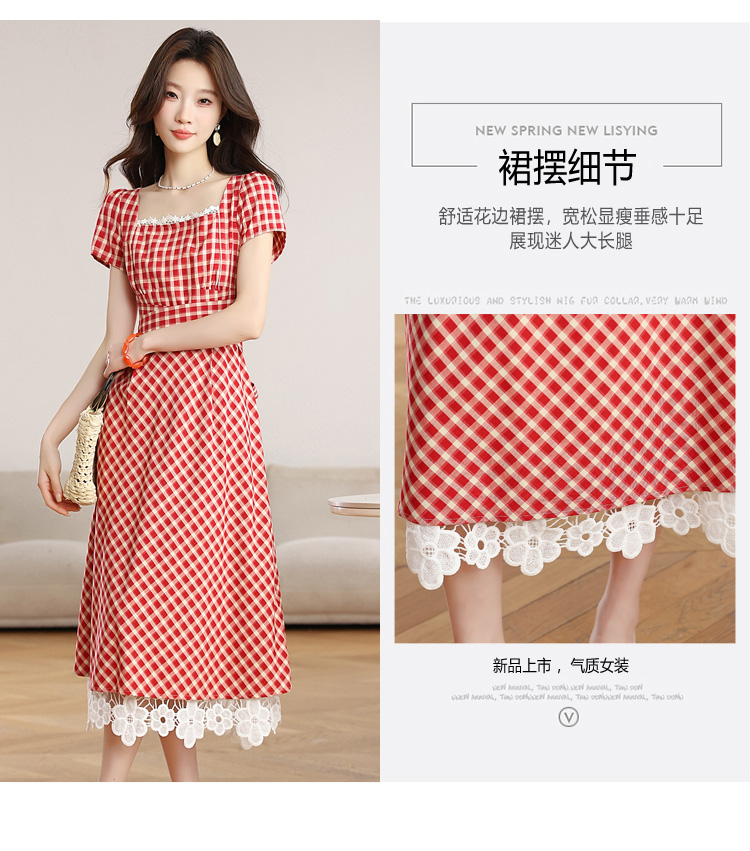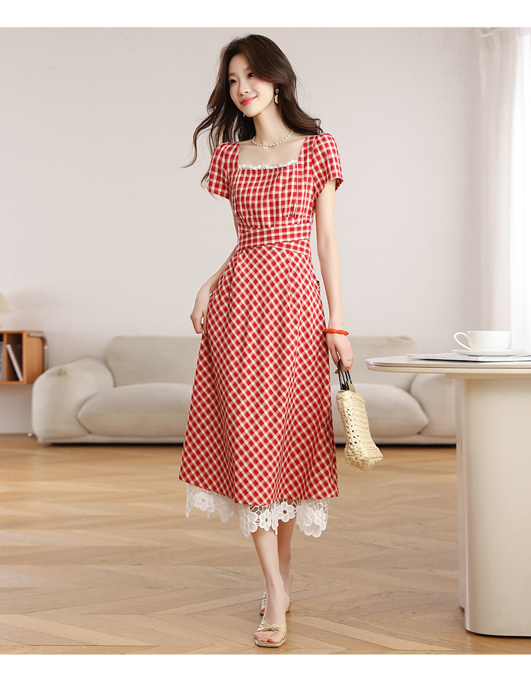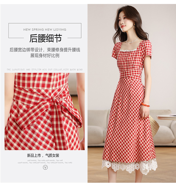 RY3870# 实拍 红格绮梦法式方领红色格子连衣裙女夏季小个子复古长裙