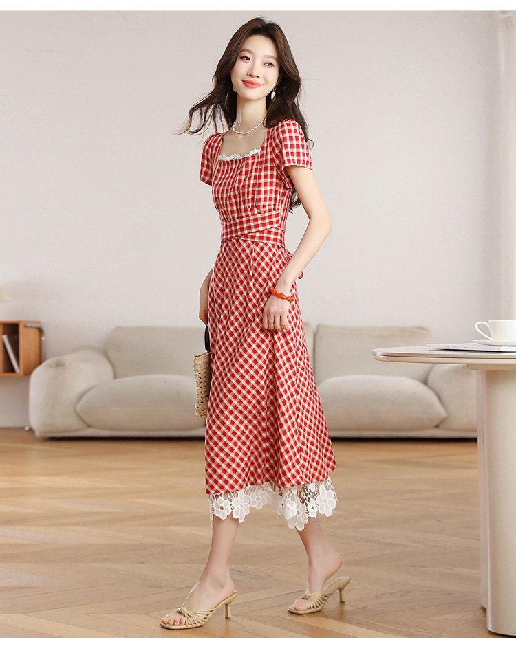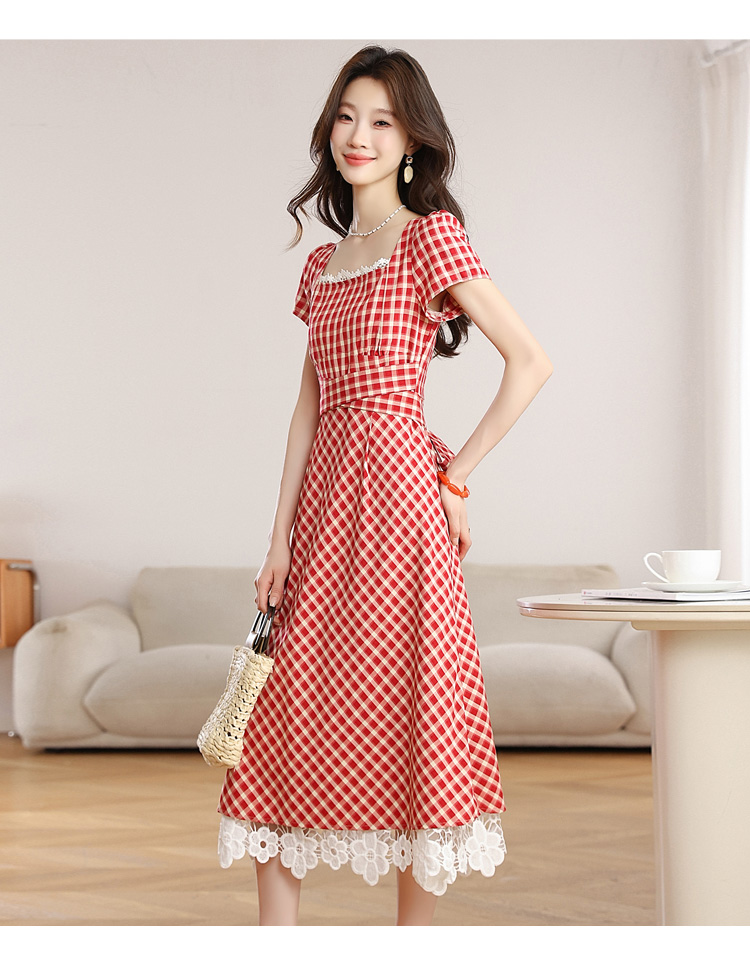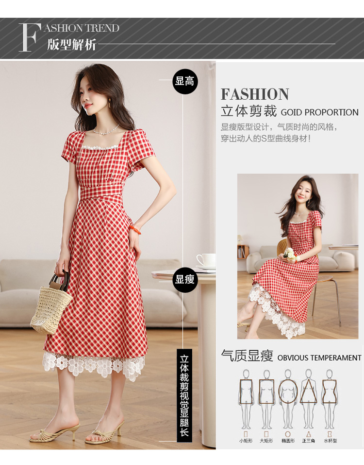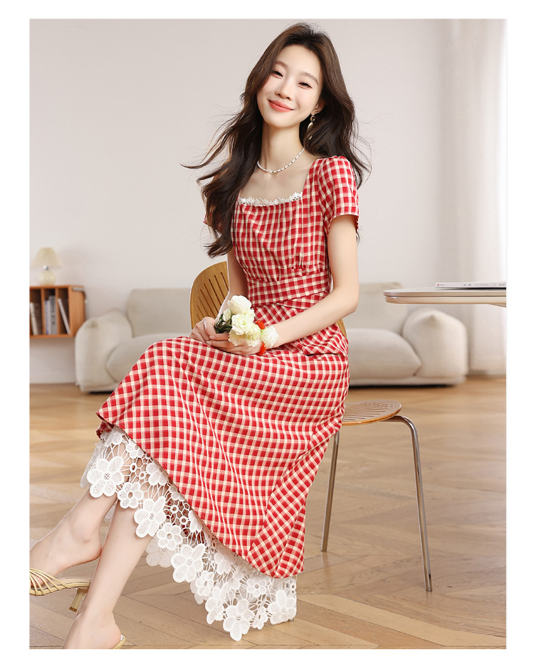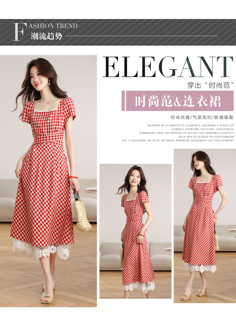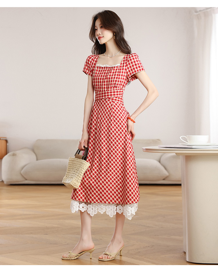 RY3870# 实拍 红格绮梦法式方领红色格子连衣裙女夏季小个子复古长裙