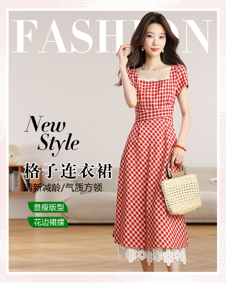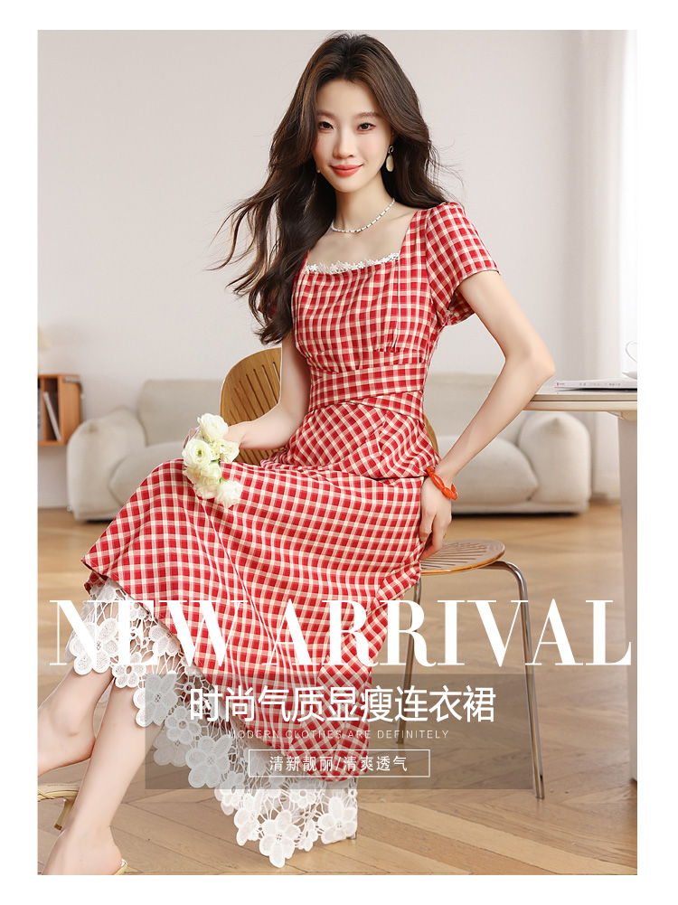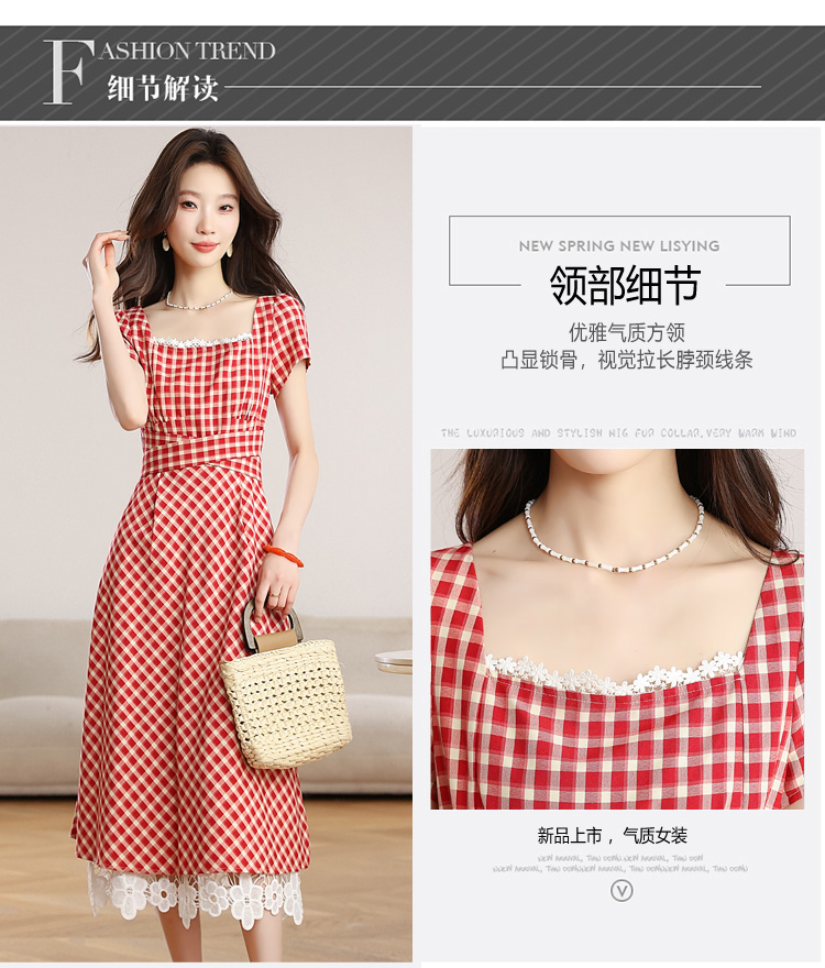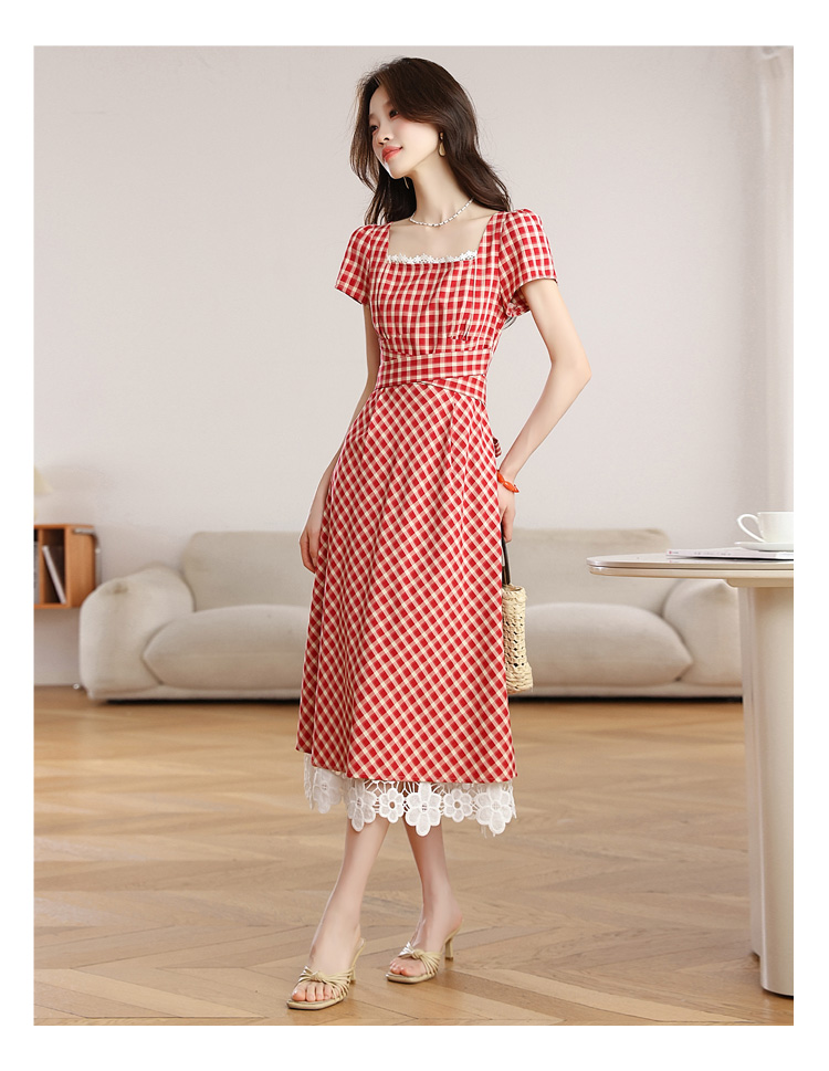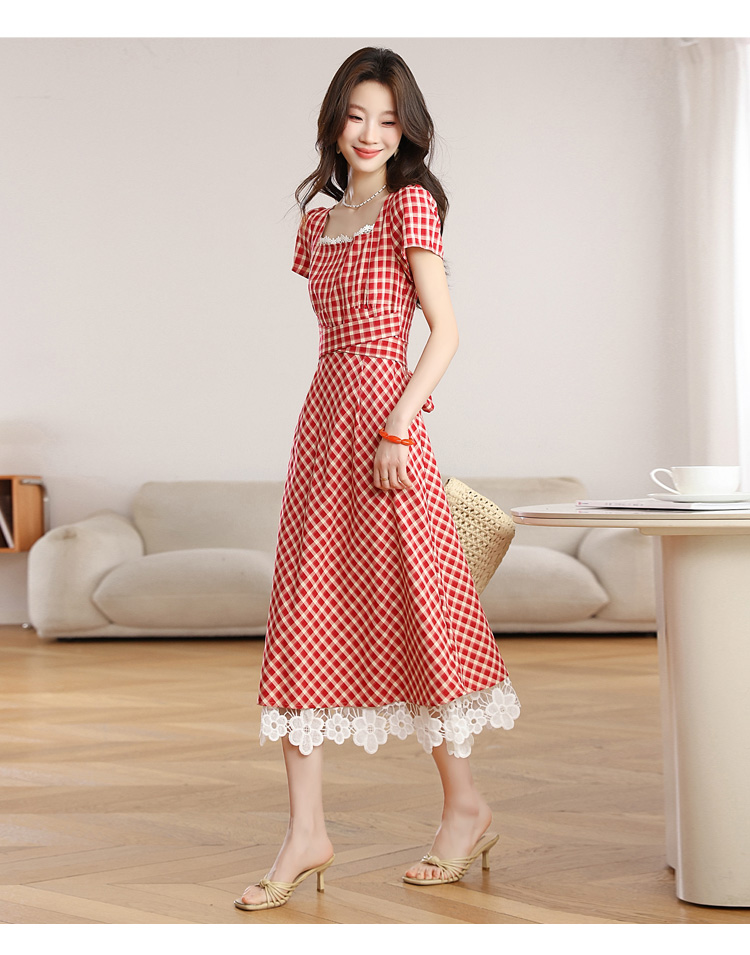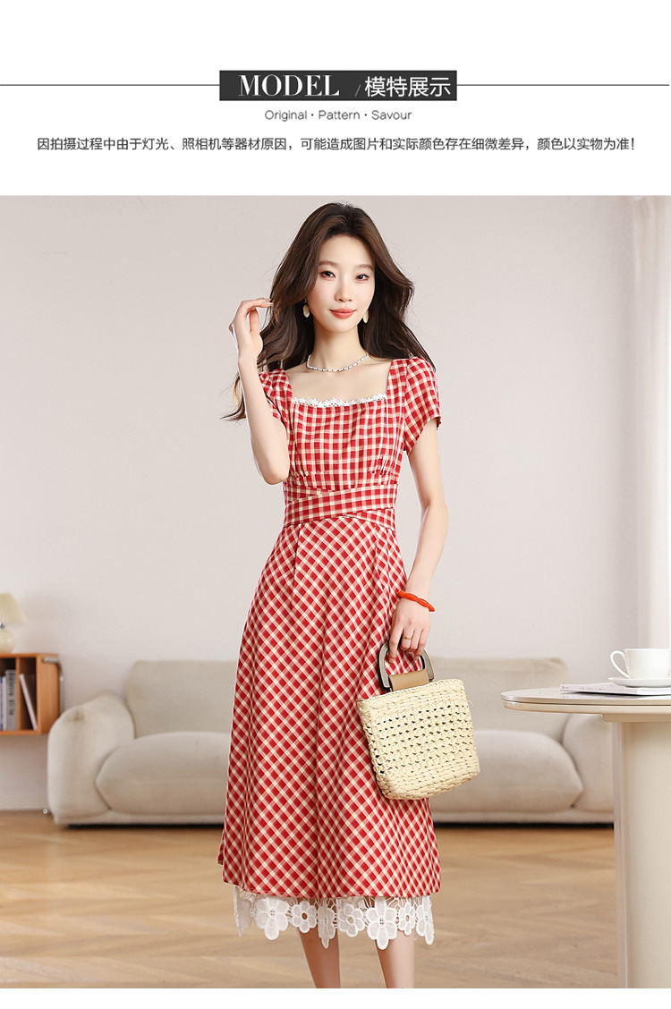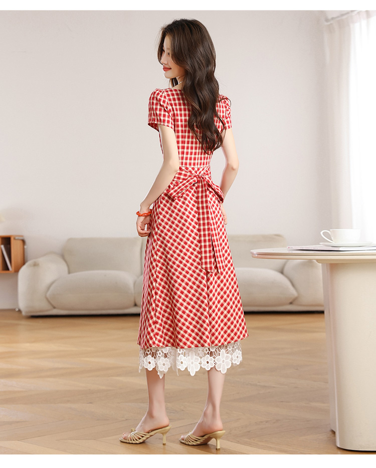 RY3870# 实拍 红格绮梦法式方领红色格子连衣裙女夏季小个子复古长裙