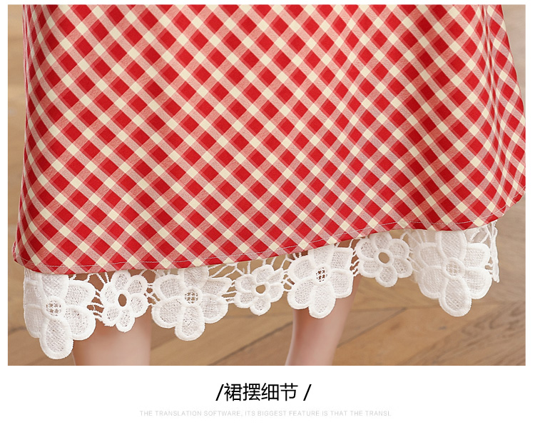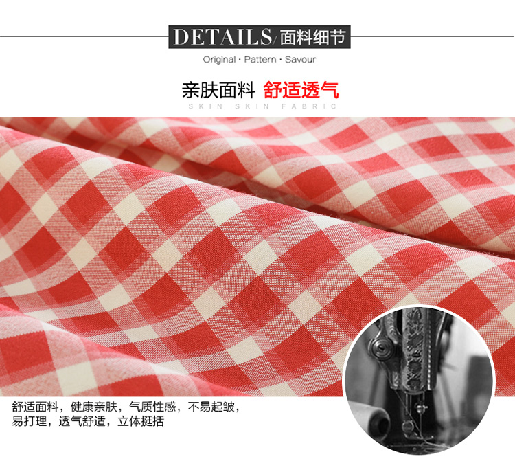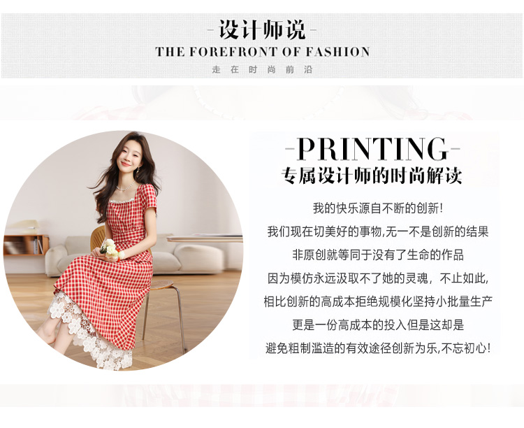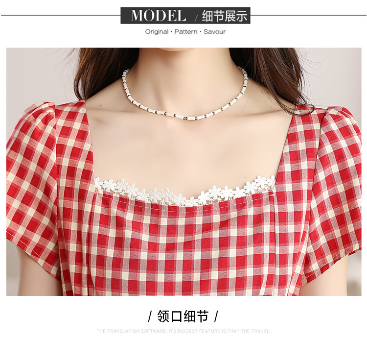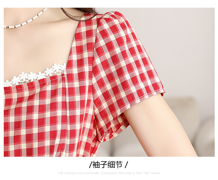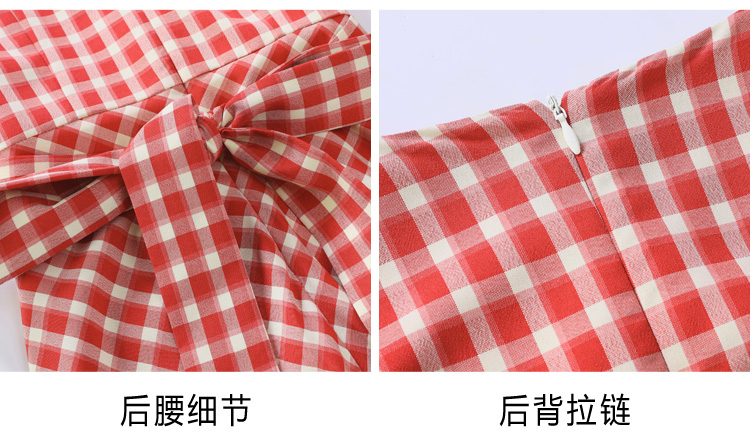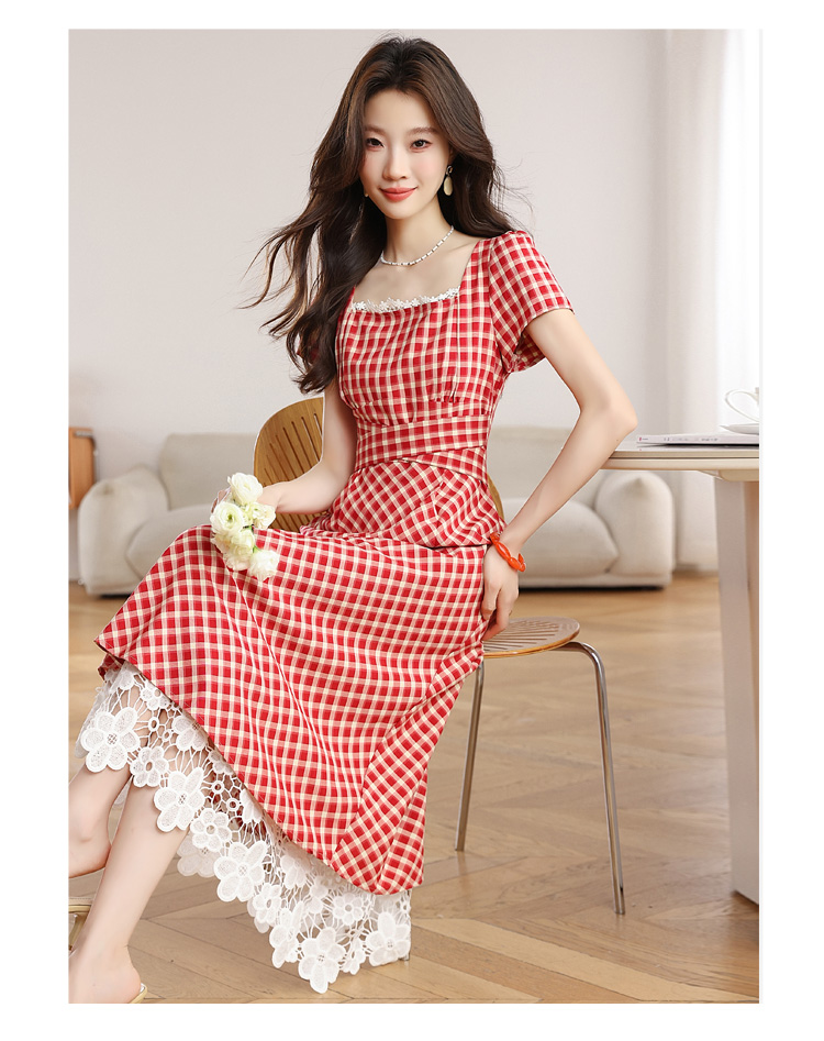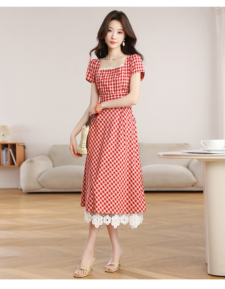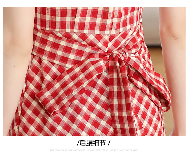 RY3870# 实拍 红格绮梦法式方领红色格子连衣裙女夏季小个子复古长裙