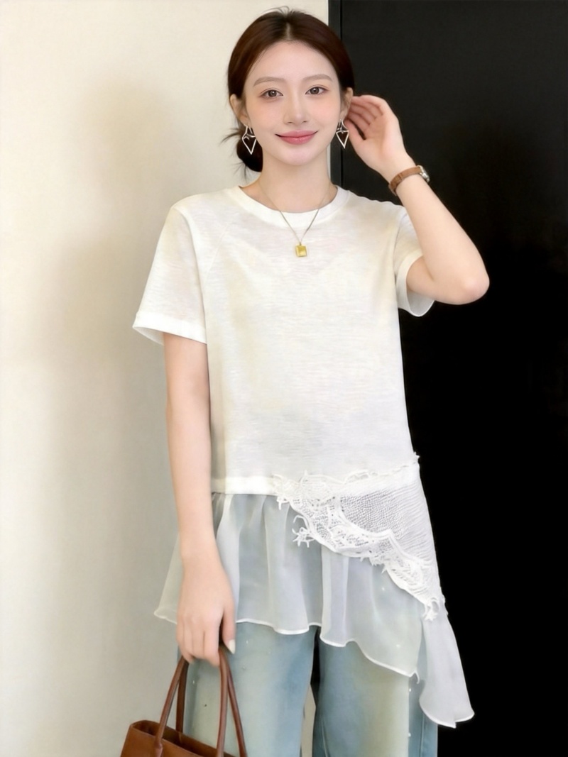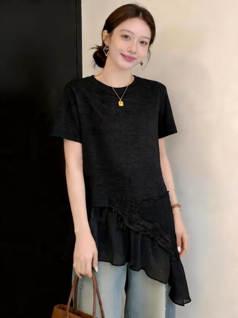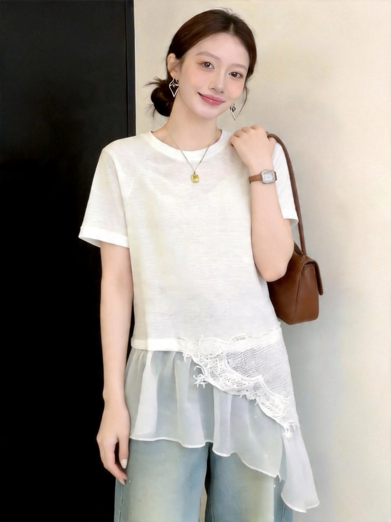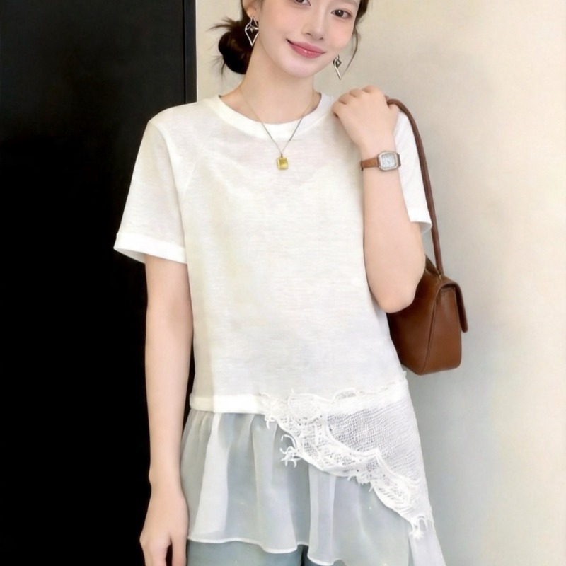 RY3882# 大码微胖妹妹时尚圆领拼接蕾丝网纱不规则设计感短袖女上衣