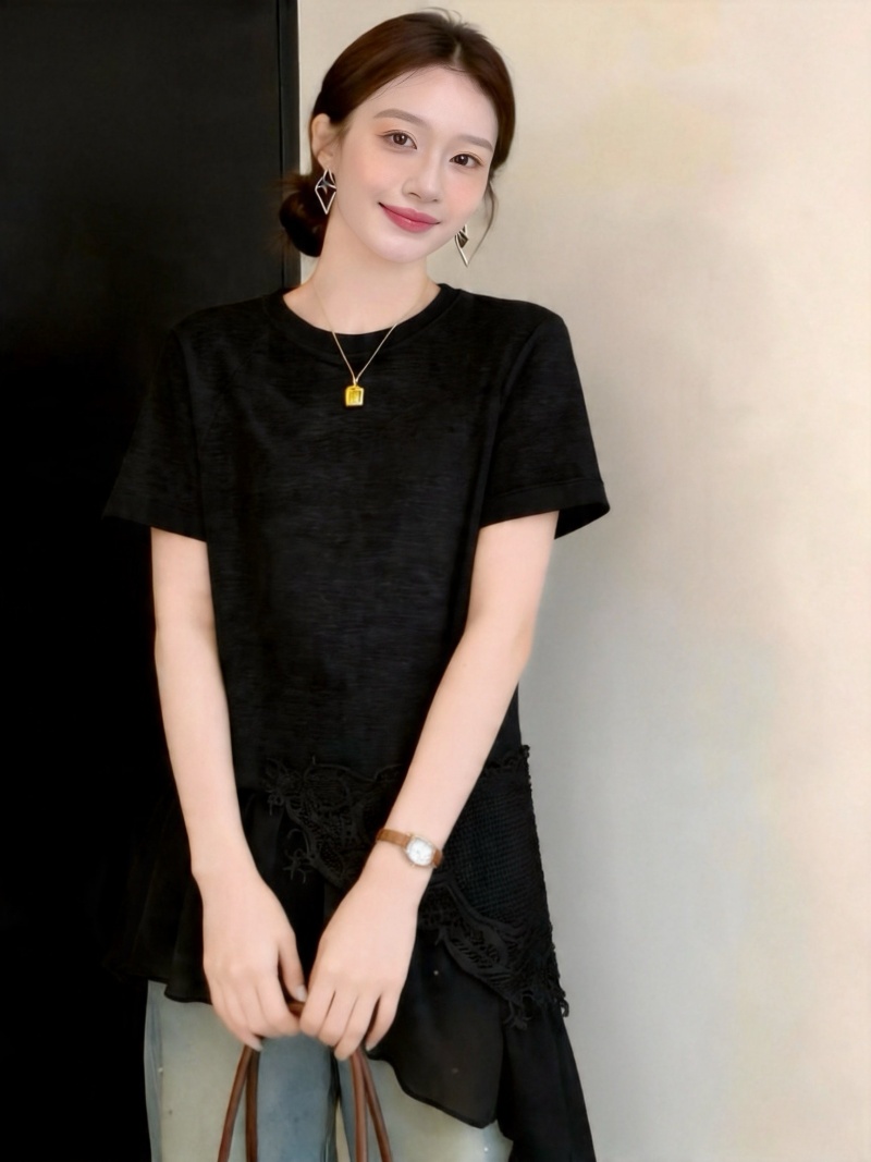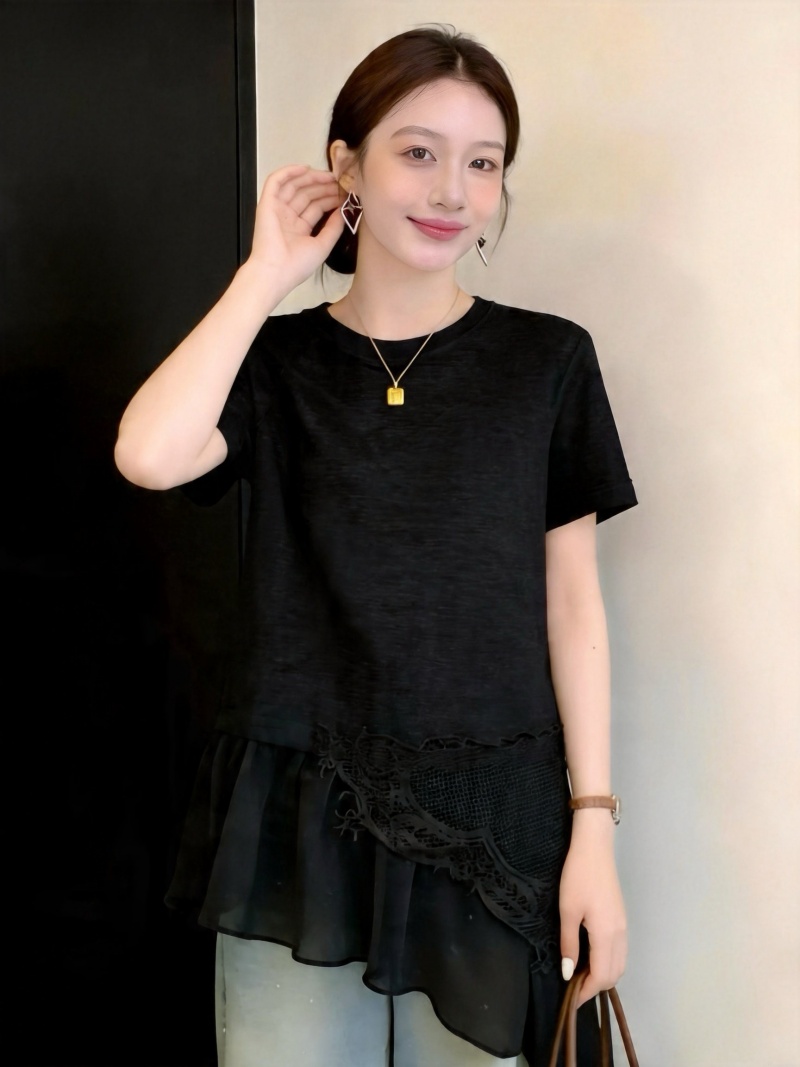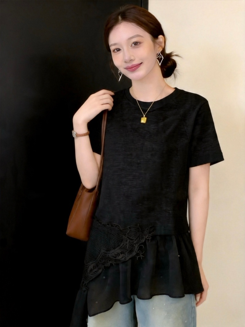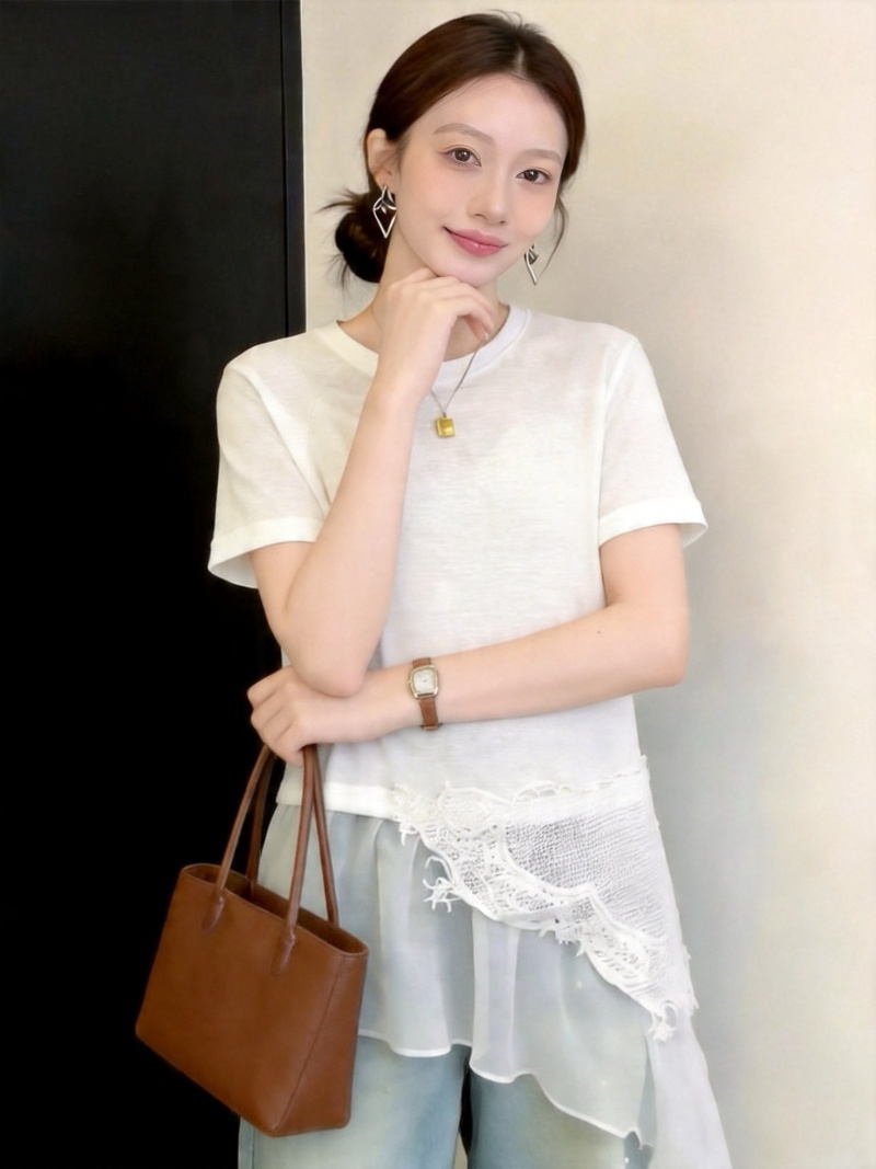 RY3882# 大码微胖妹妹时尚圆领拼接蕾丝网纱不规则设计感短袖女上衣