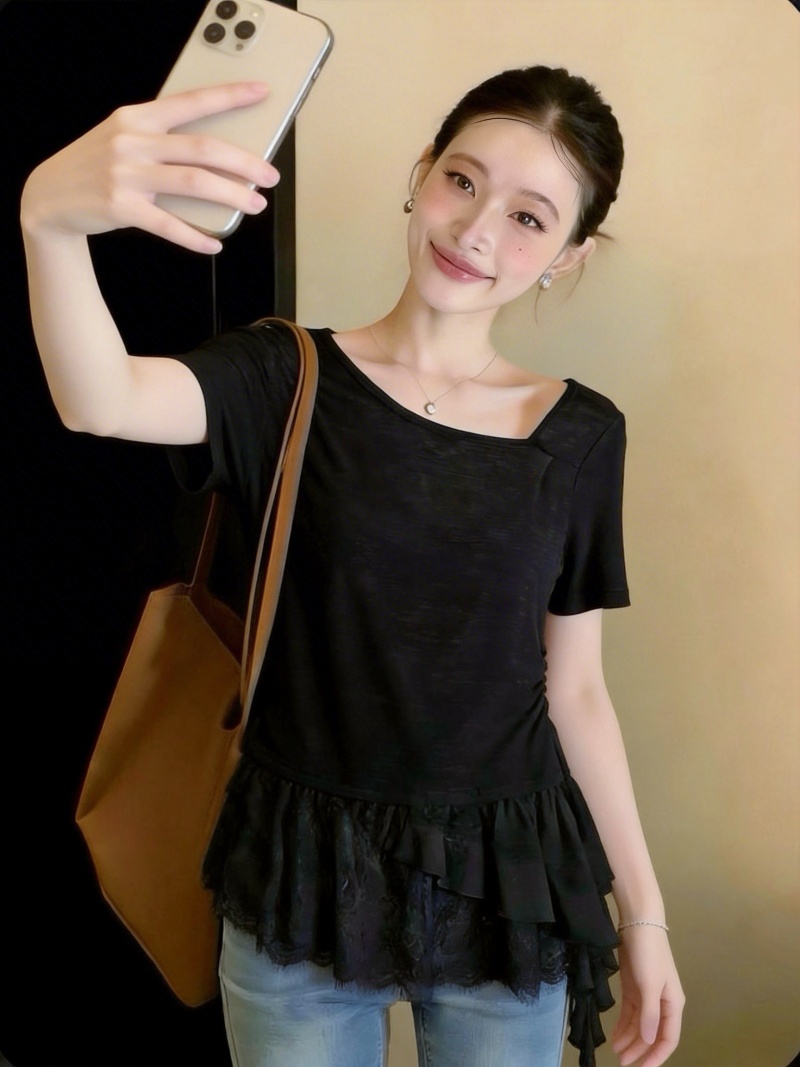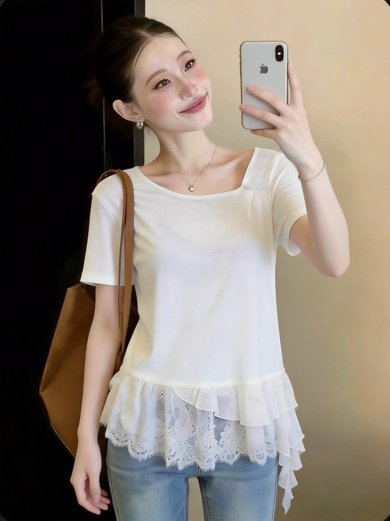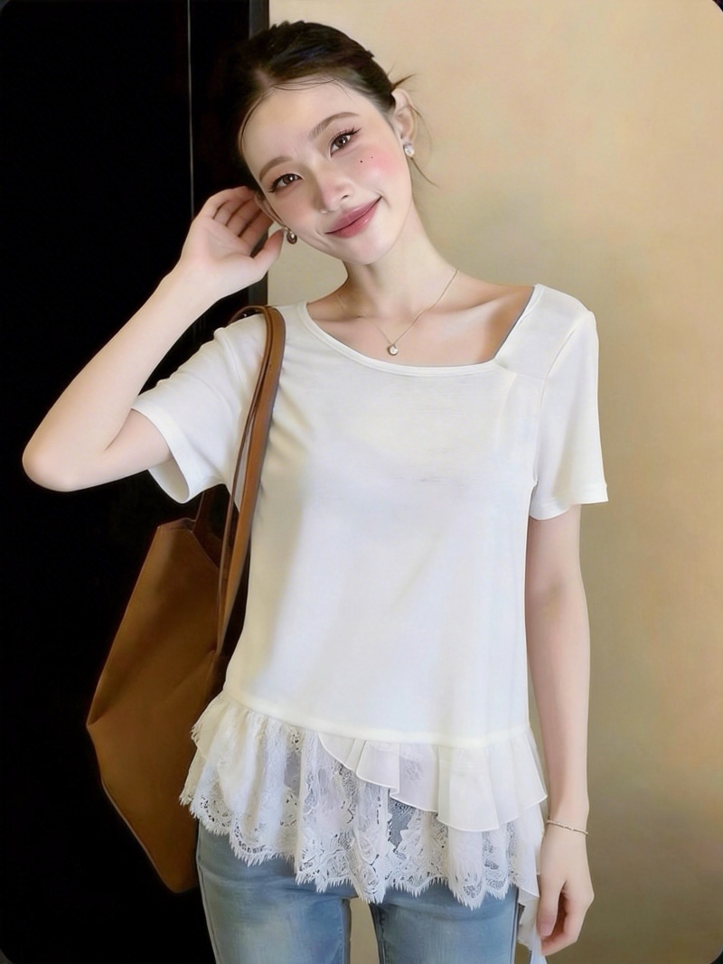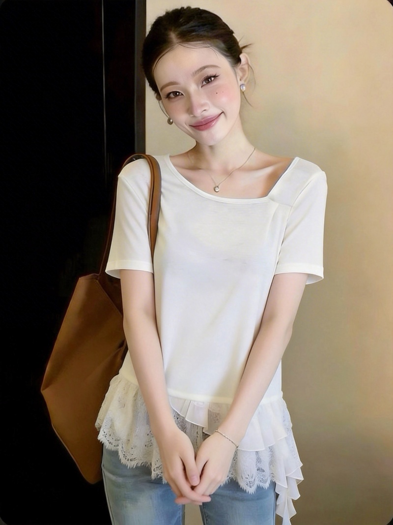 RY3889# 大码微胖妹妹韩味气质短袖t恤女不规则蕾丝拼接设计露肩上衣