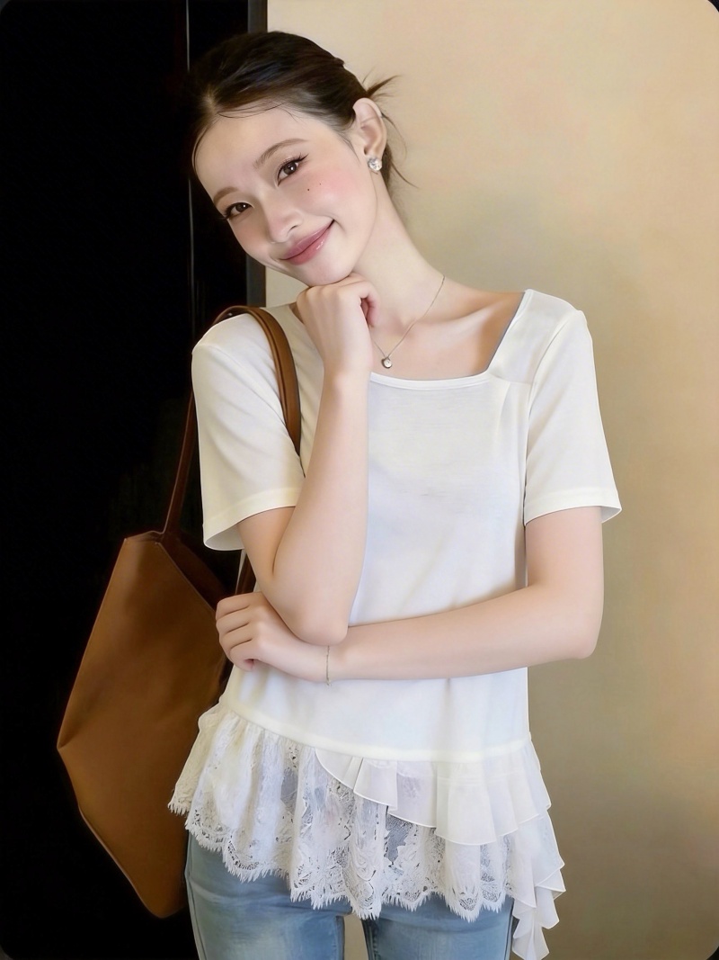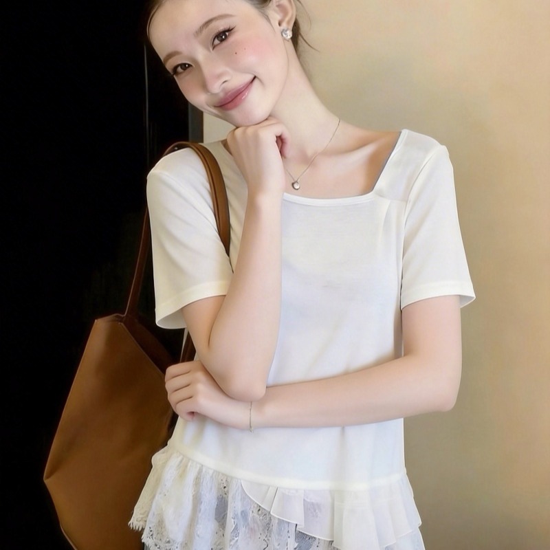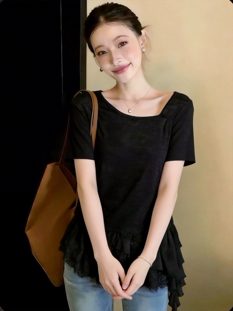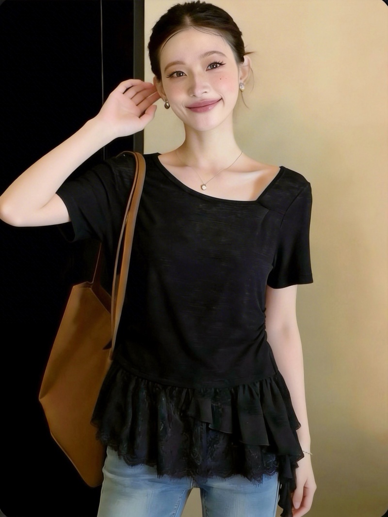 RY3889# 大码微胖妹妹韩味气质短袖t恤女不规则蕾丝拼接设计露肩上衣