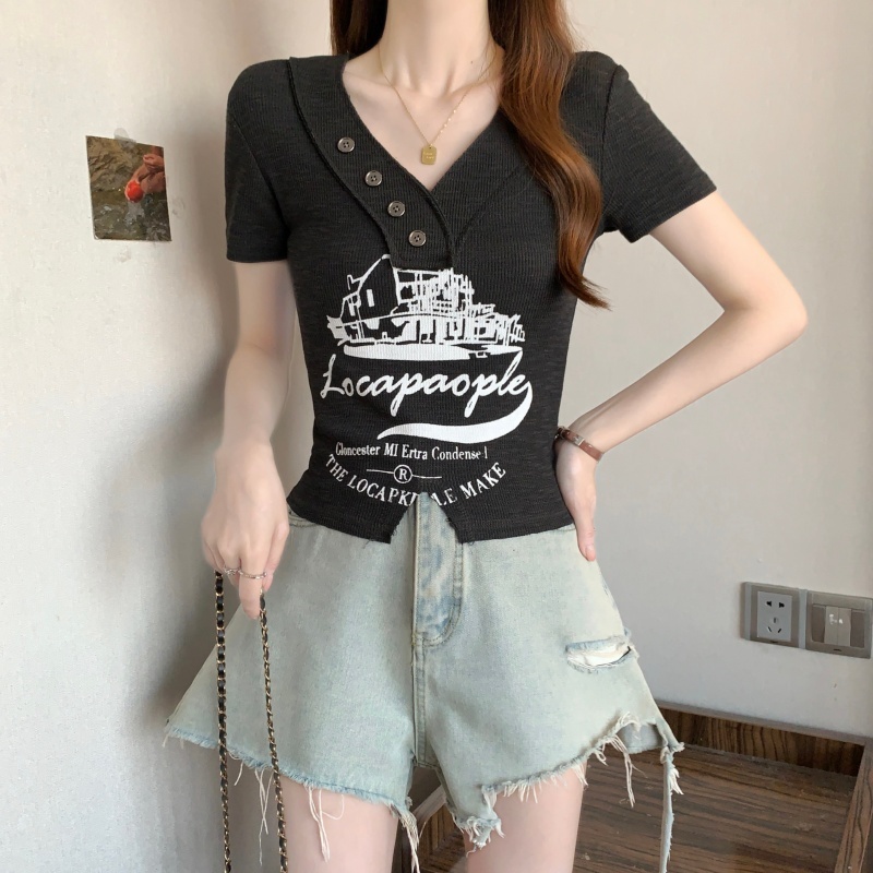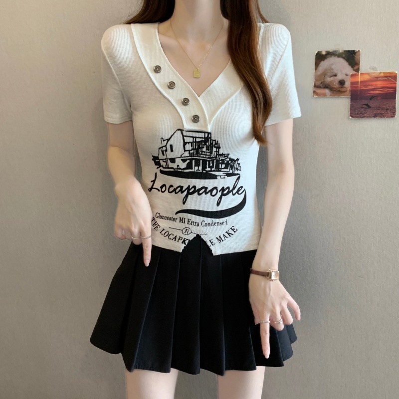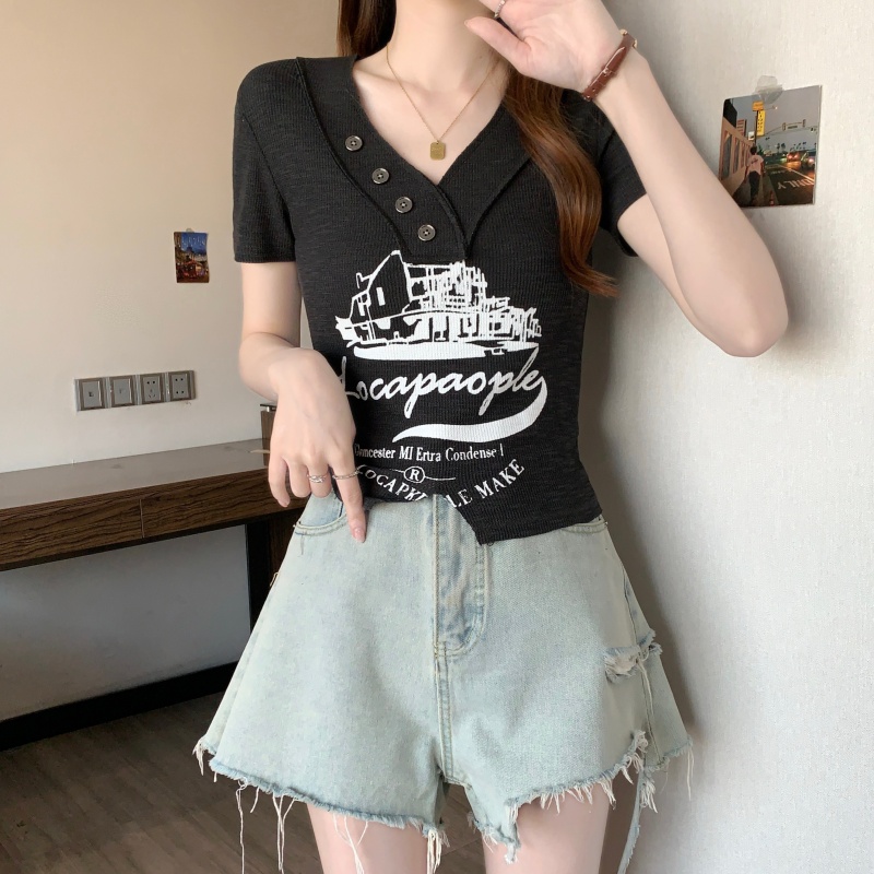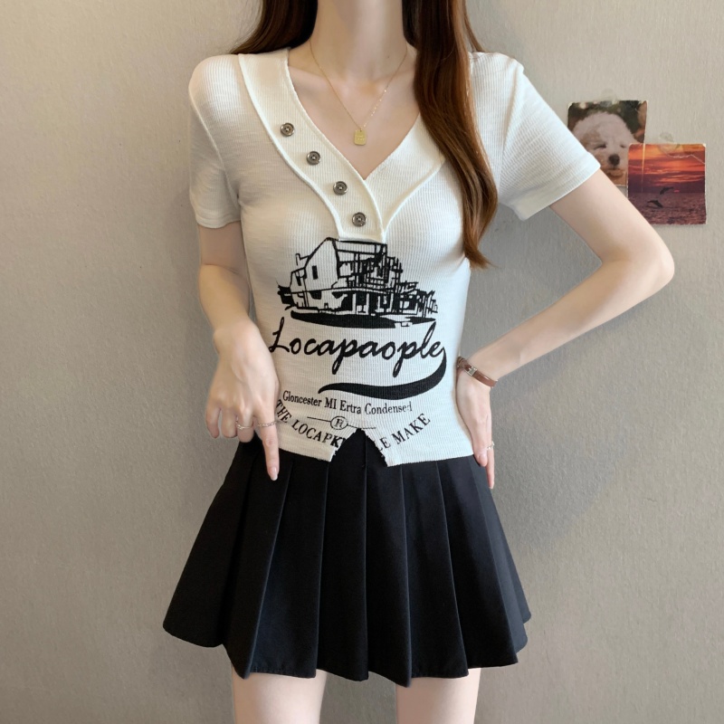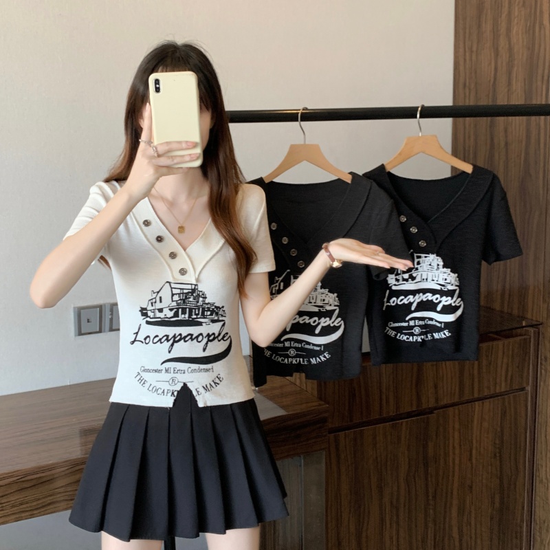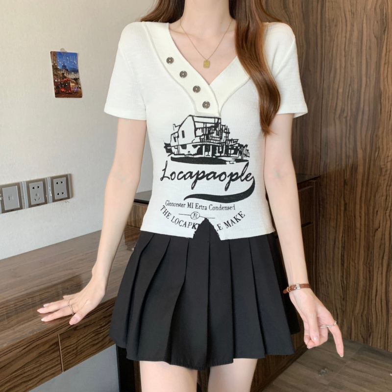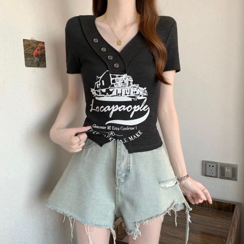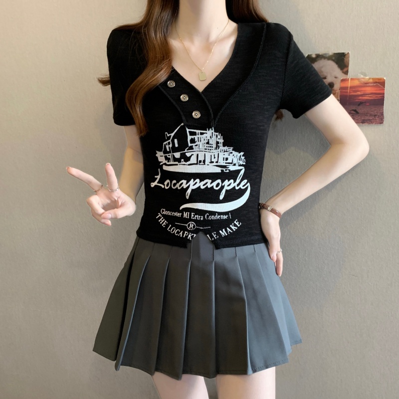 RY3892# 实拍胖MM大码女装2026夏季新款设计感V领印花短袖T恤纯欲辣妹上衣