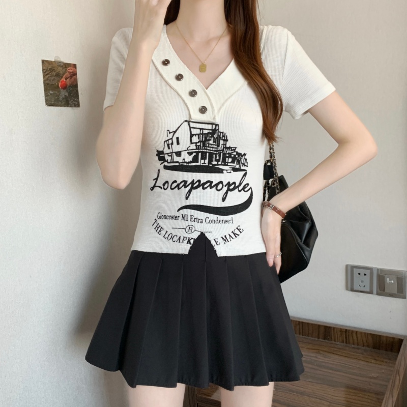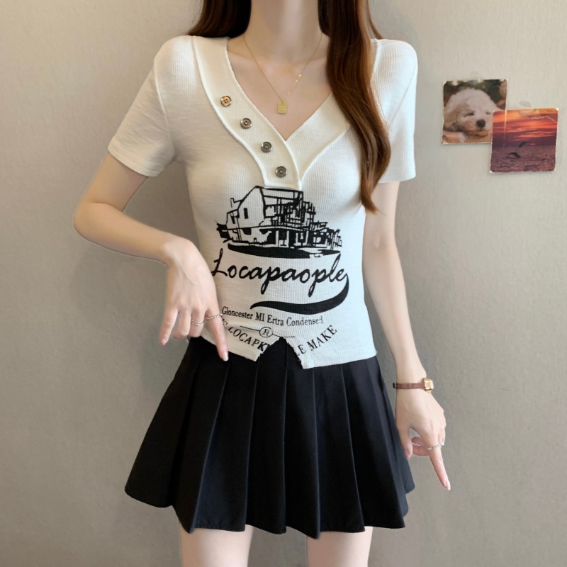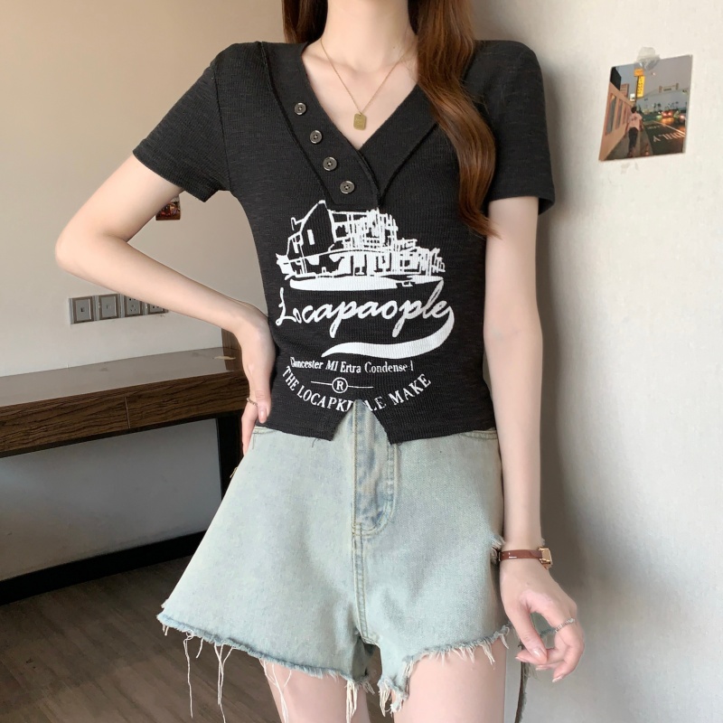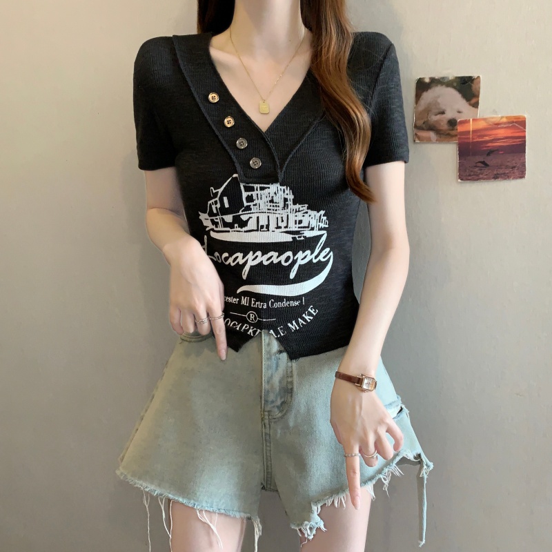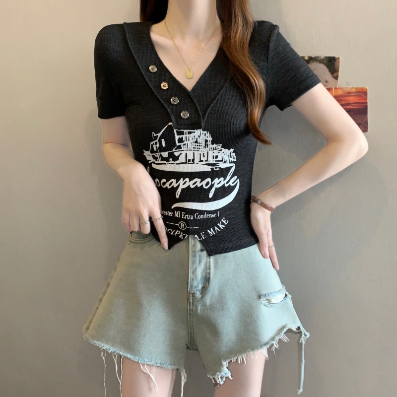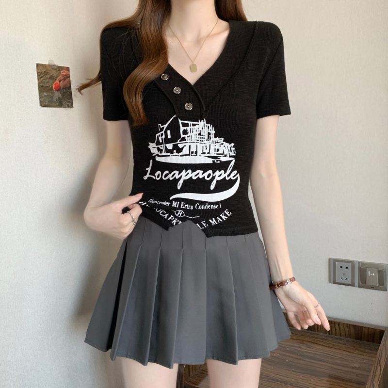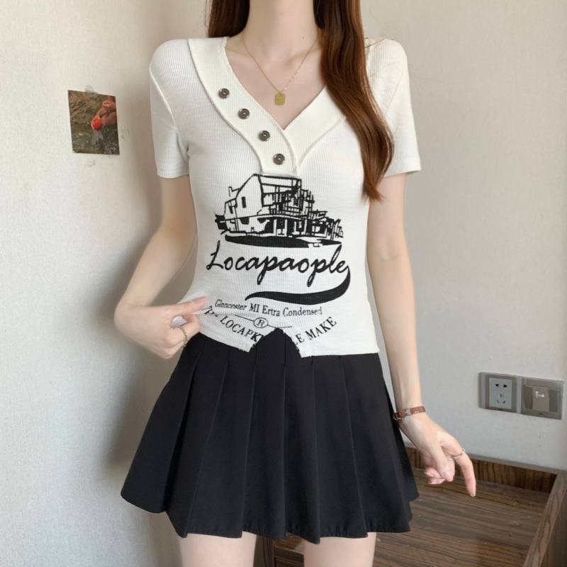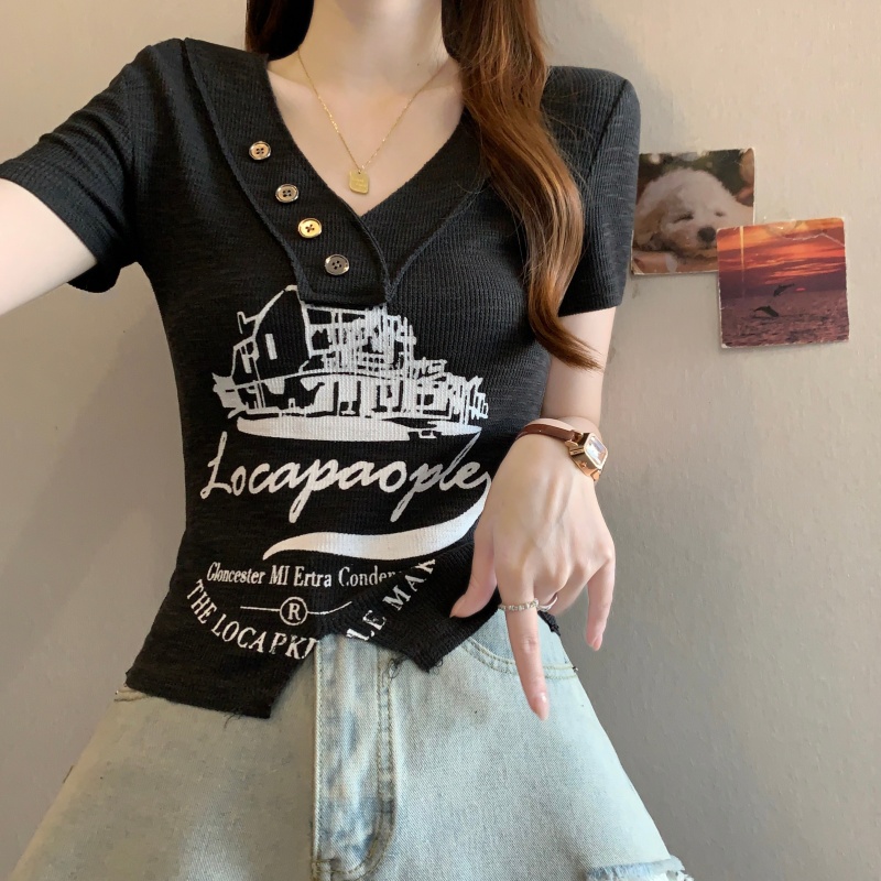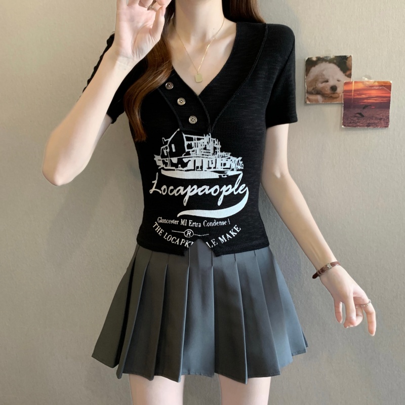 RY3892# 实拍胖MM大码女装2026夏季新款设计感V领印花短袖T恤纯欲辣妹上衣