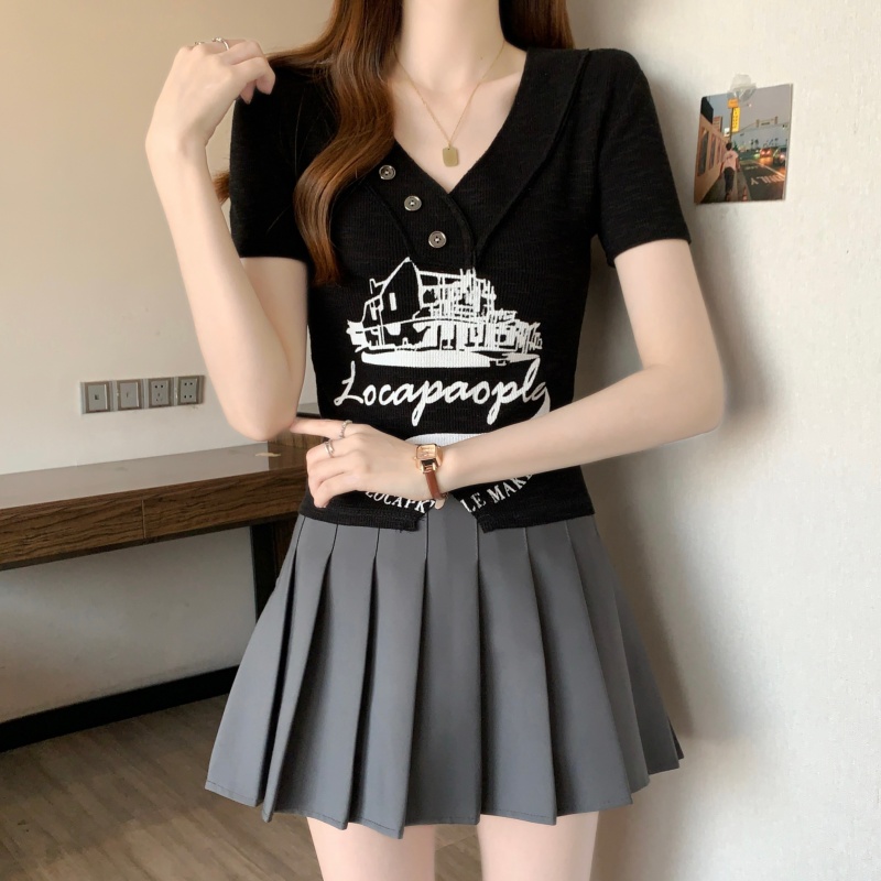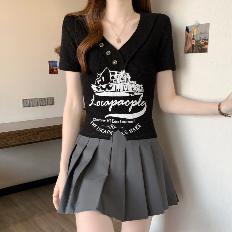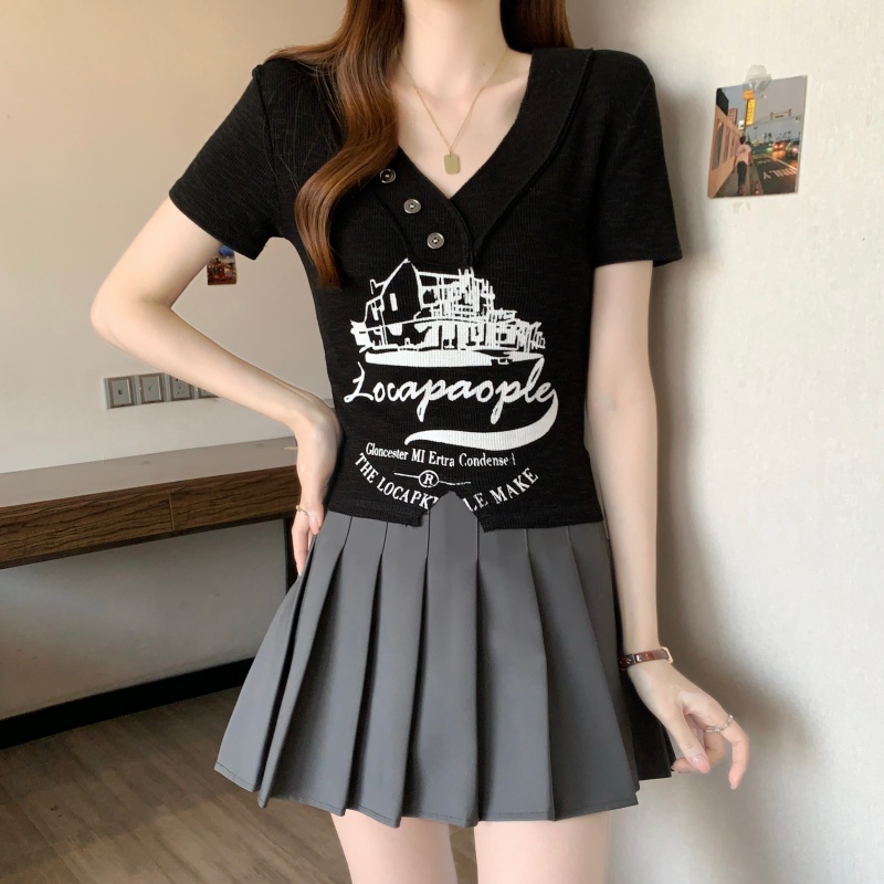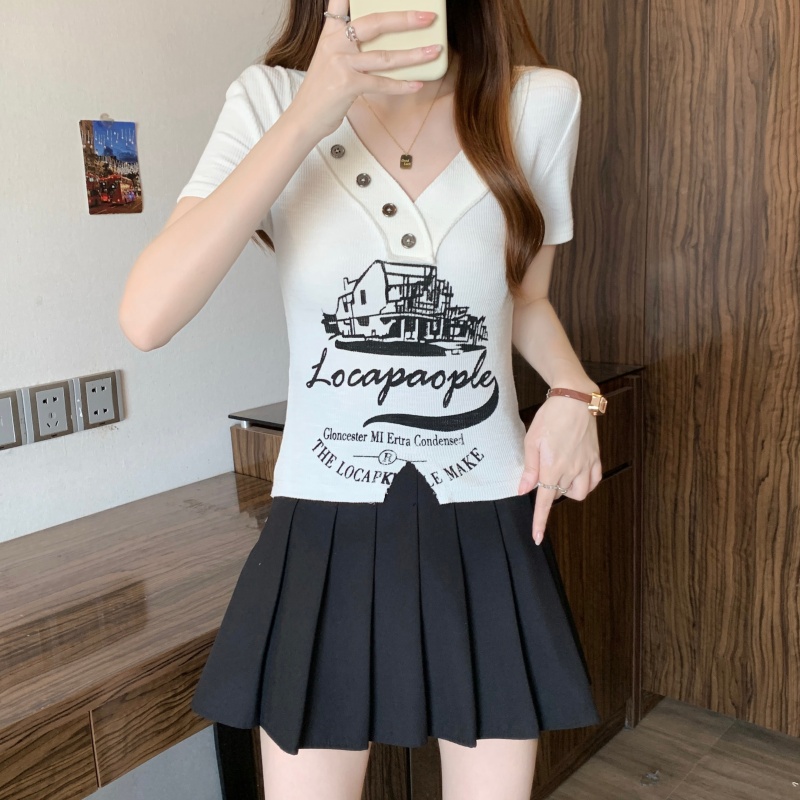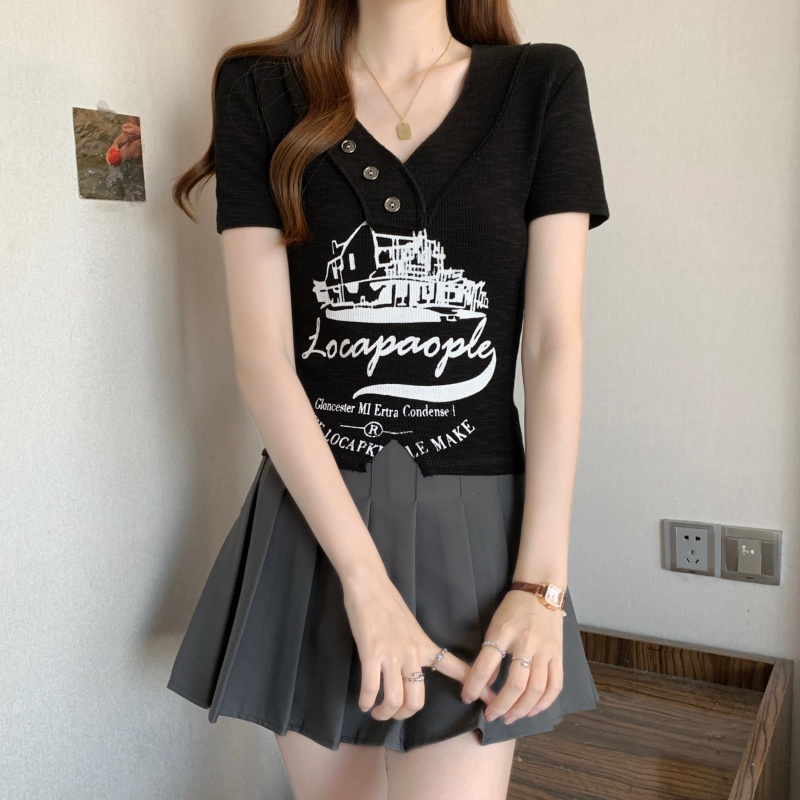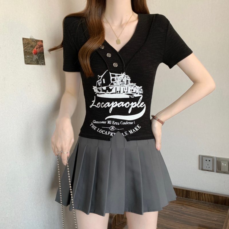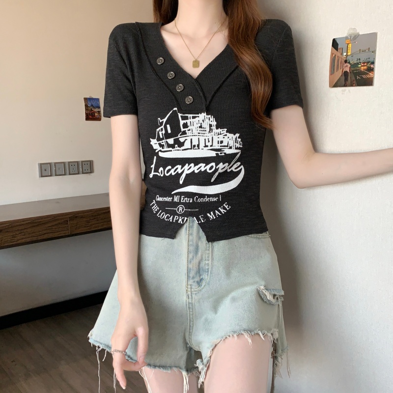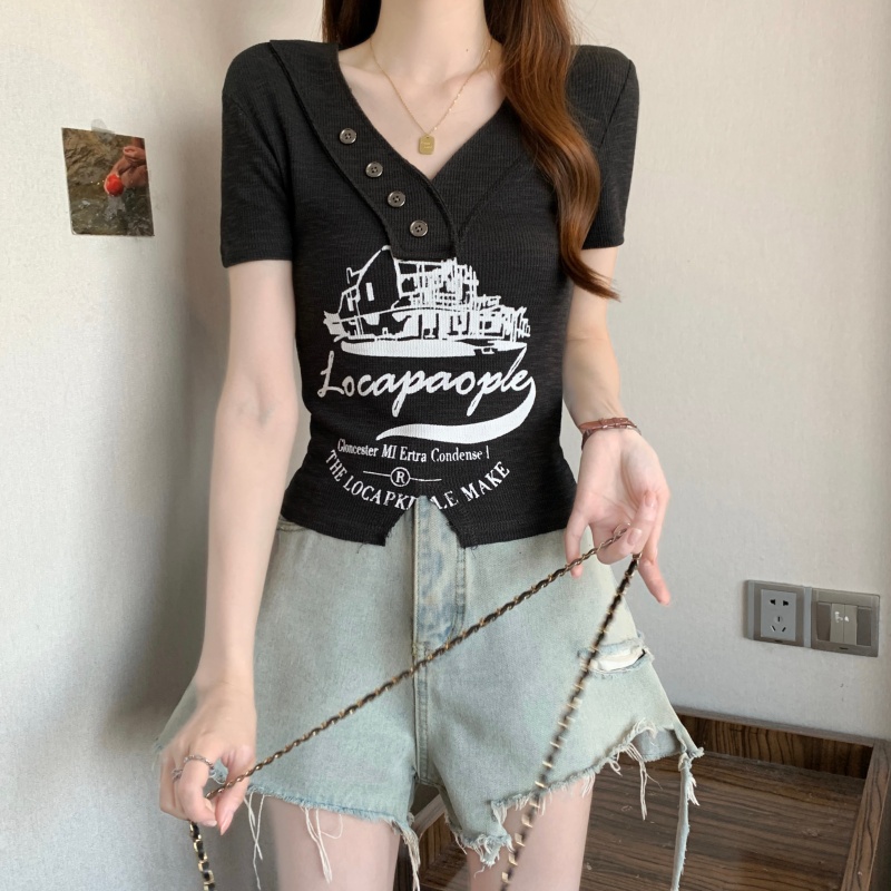 RY3892# 实拍胖MM大码女装2026夏季新款设计感V领印花短袖T恤纯欲辣妹上衣