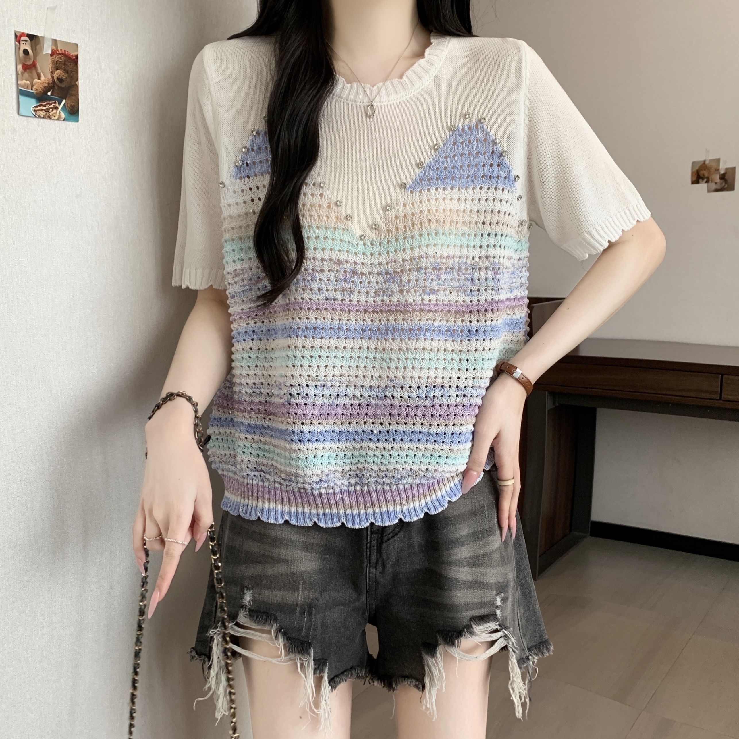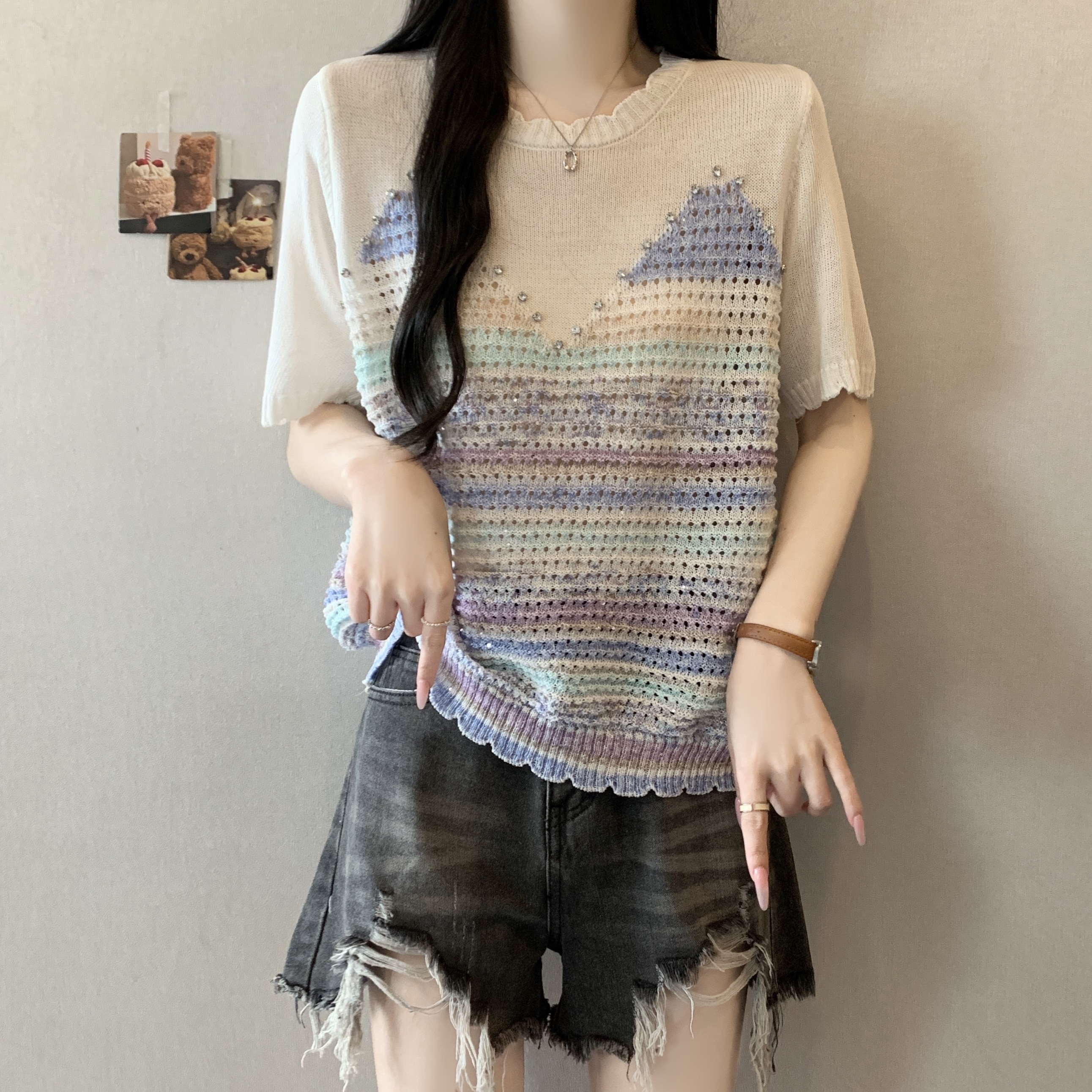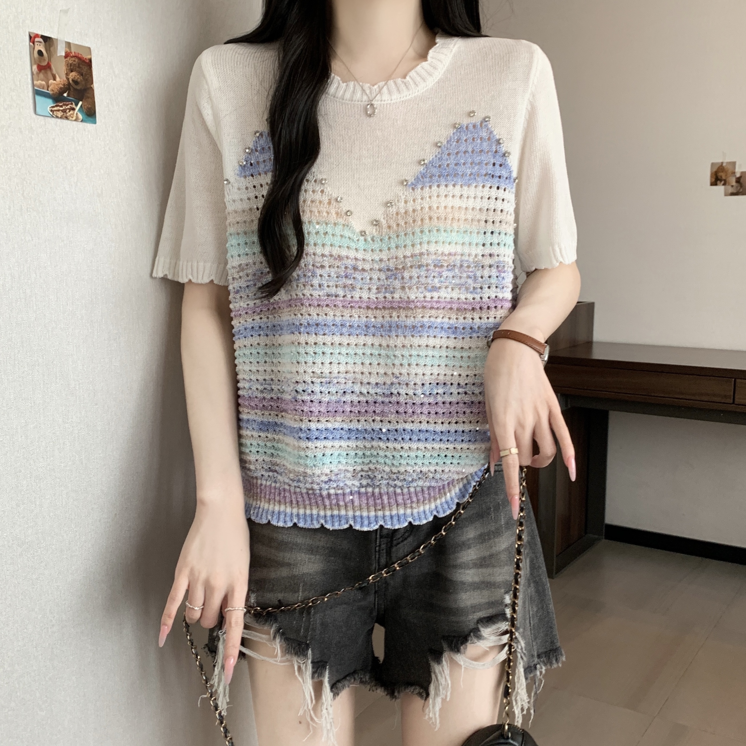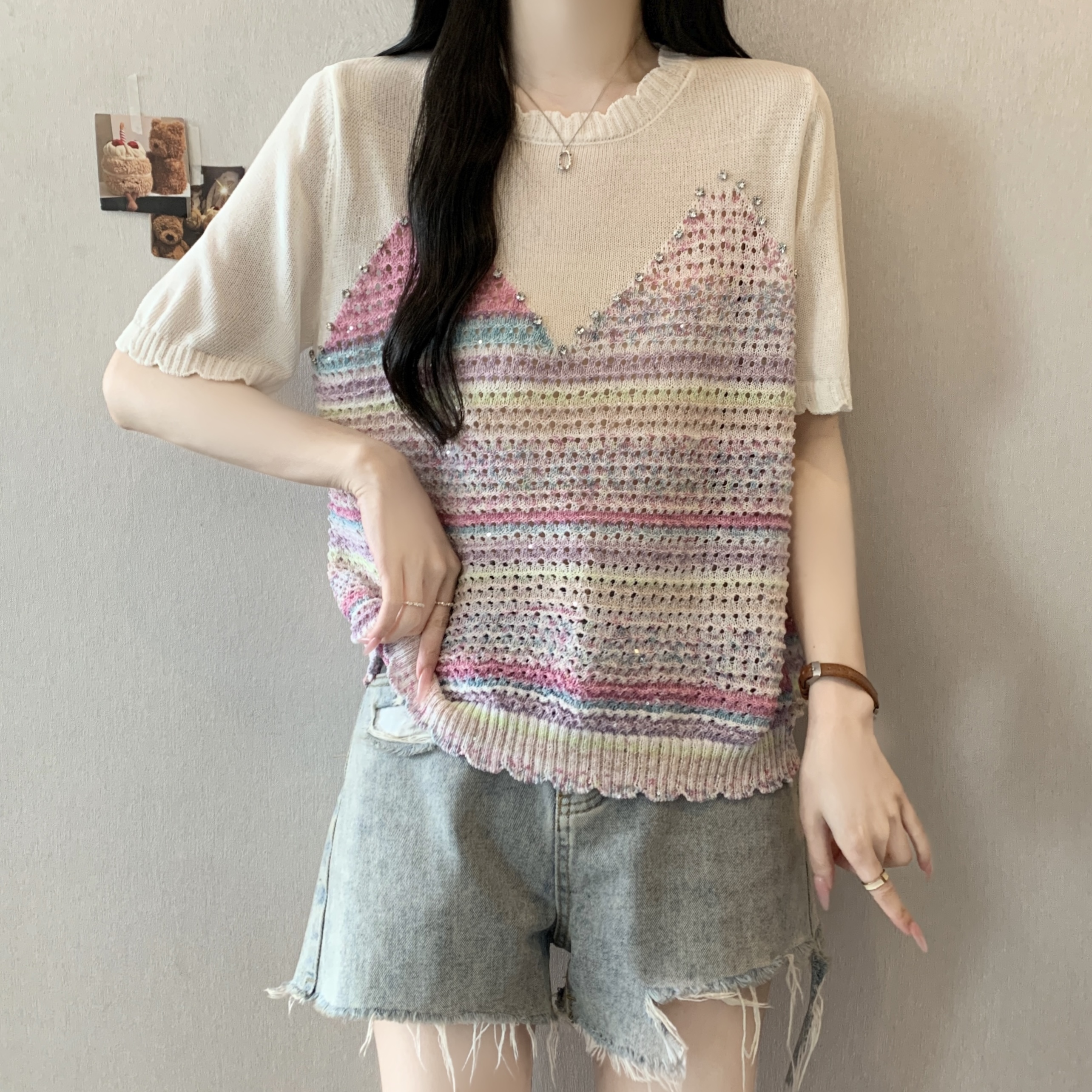 RY3896# 实拍 大码女装钉珠镂空彩色条纹针织衫宽松减龄短袖上衣