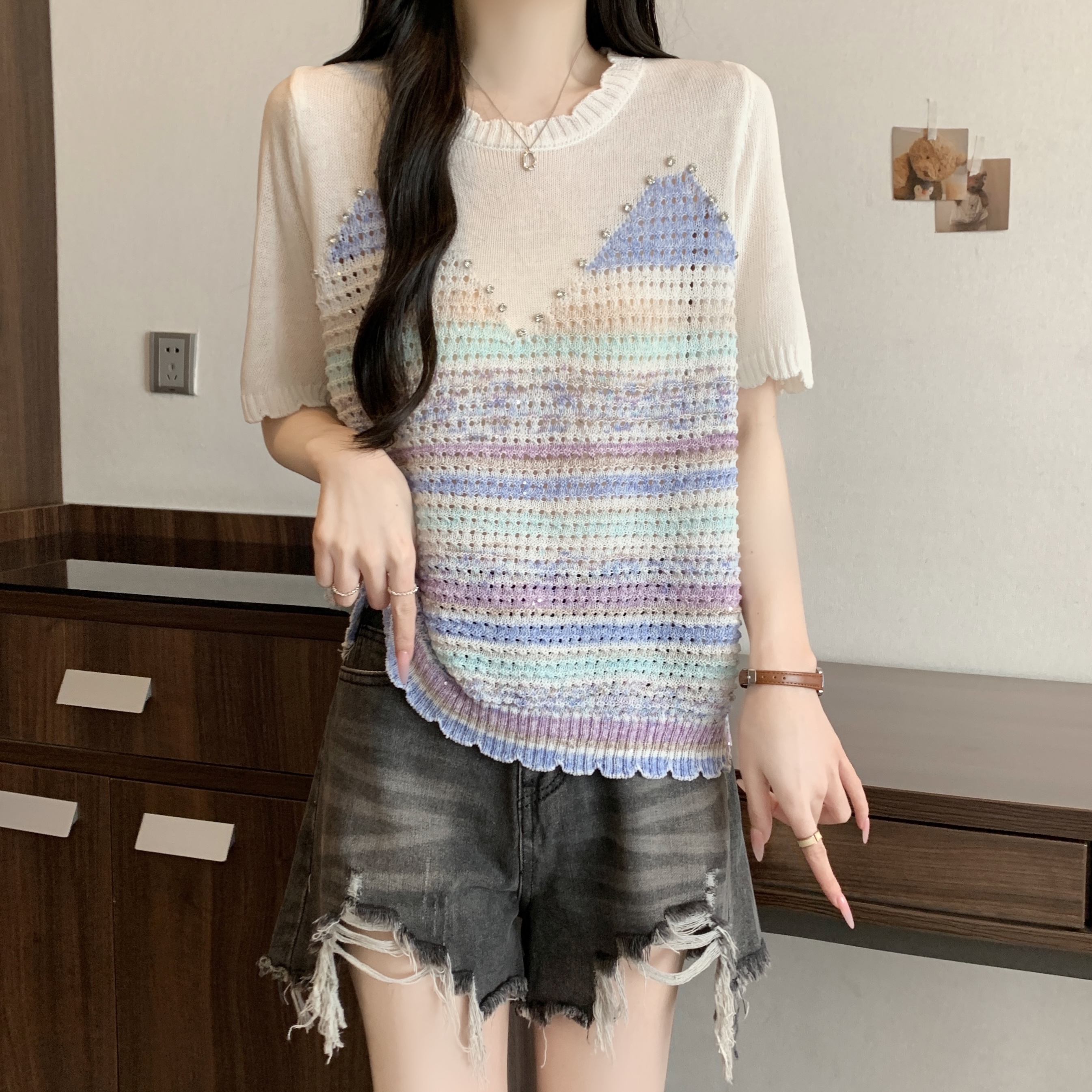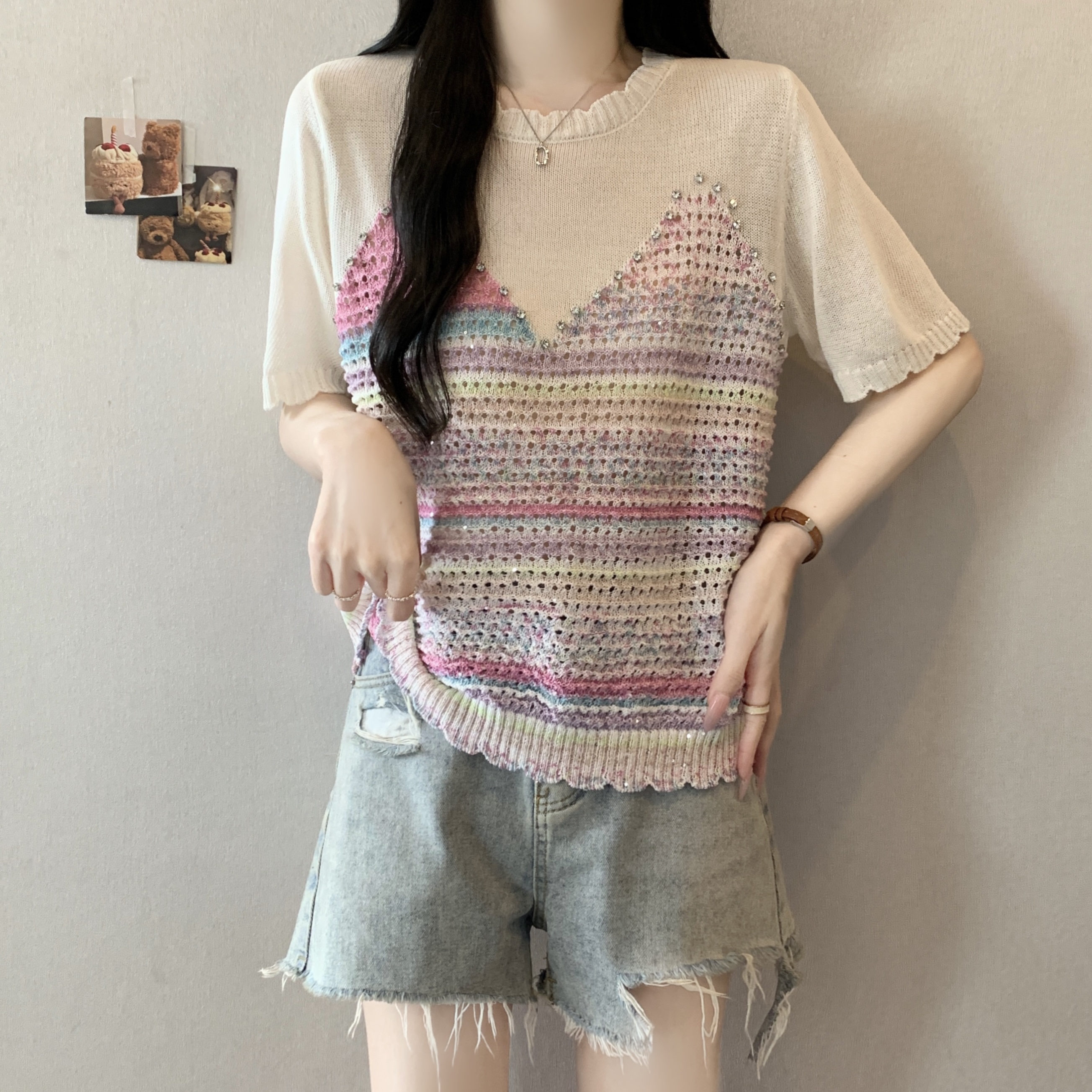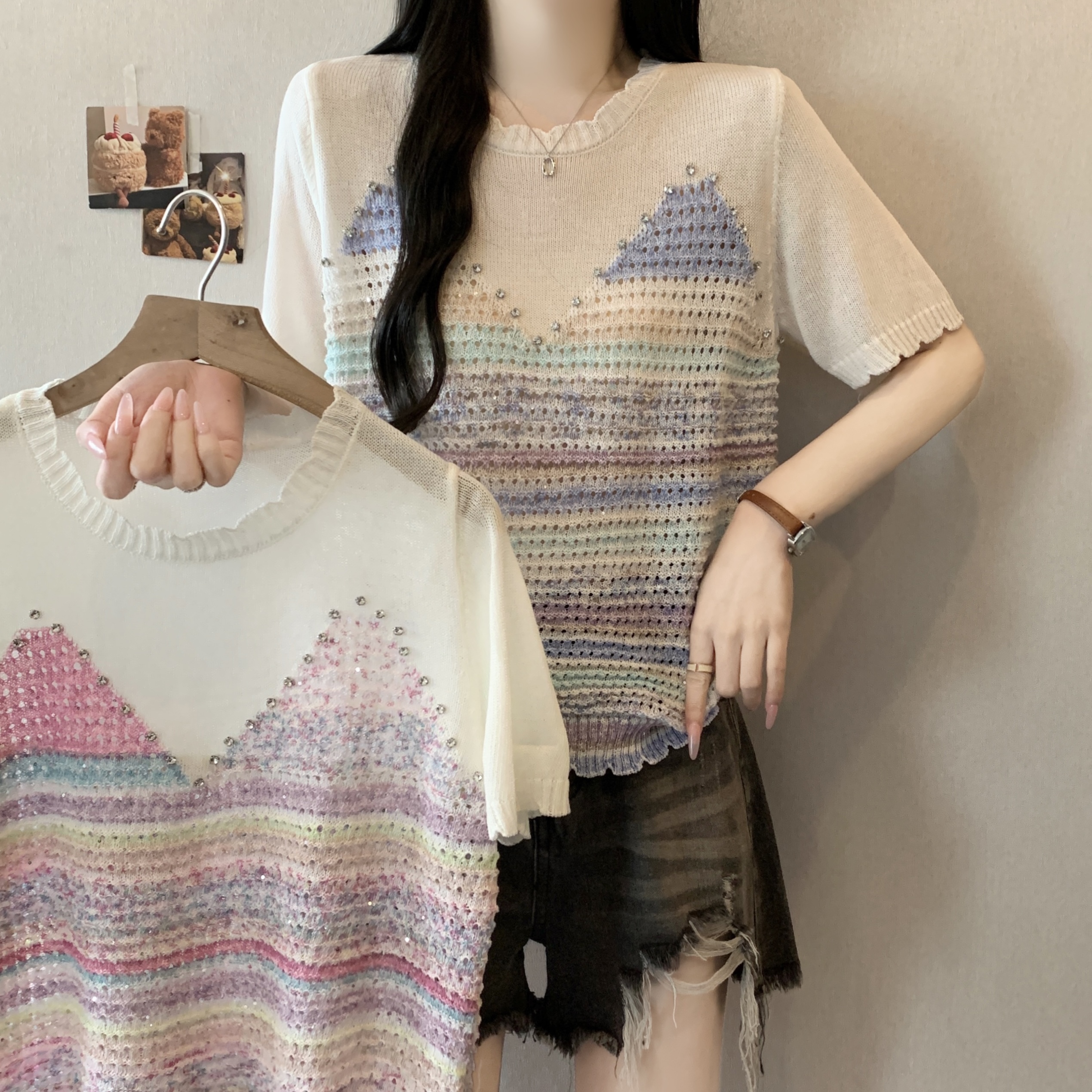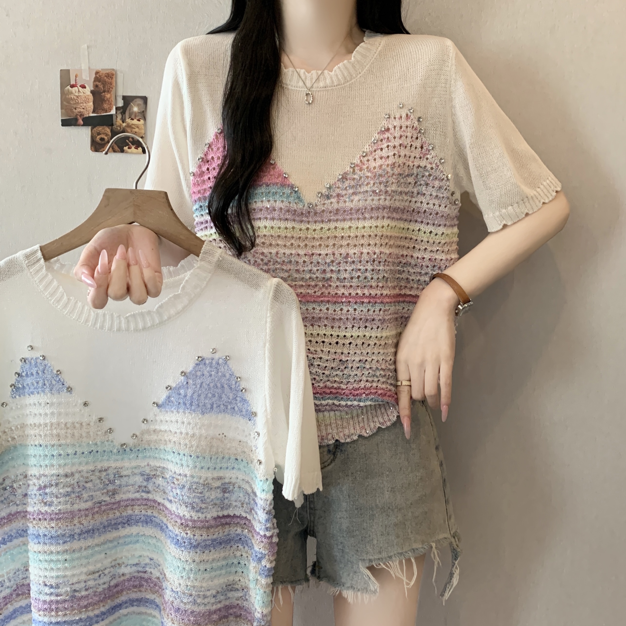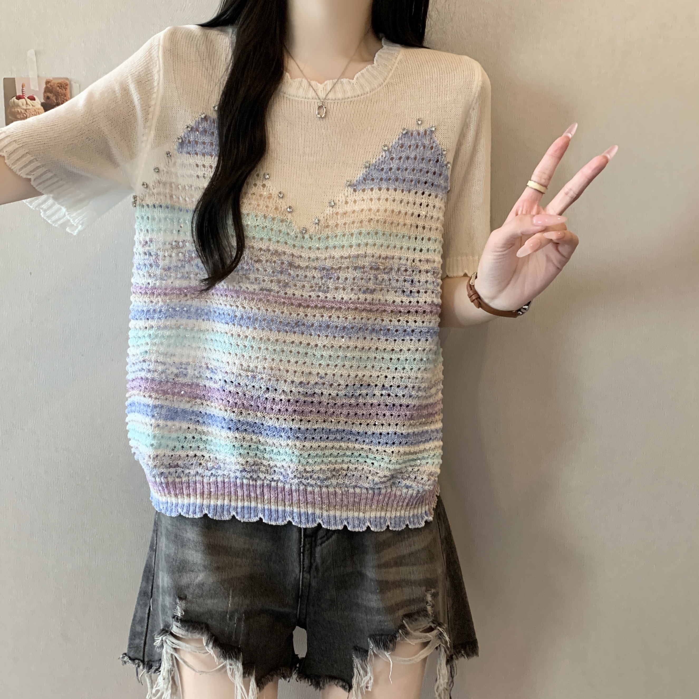 RY3896# 实拍 大码女装钉珠镂空彩色条纹针织衫宽松减龄短袖上衣