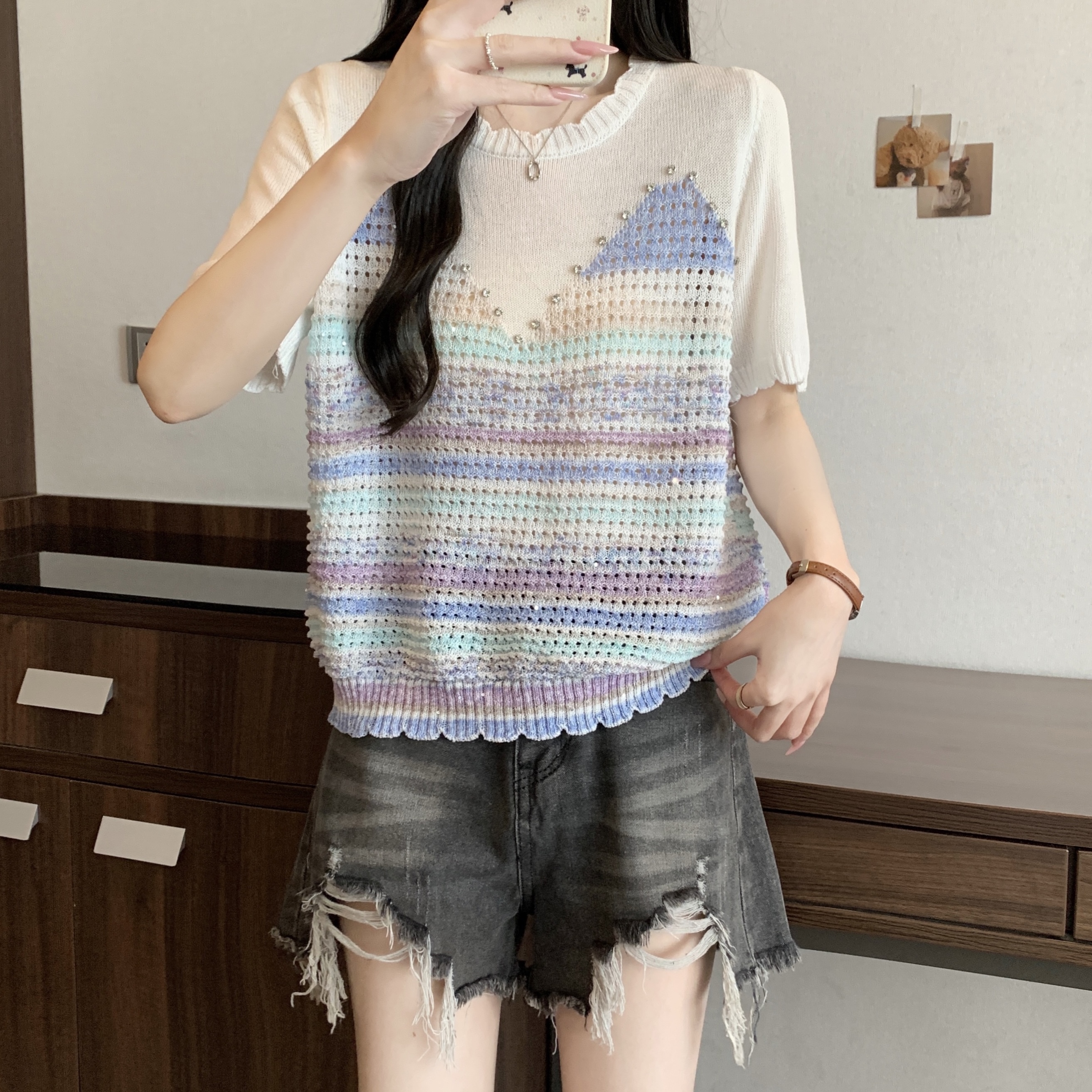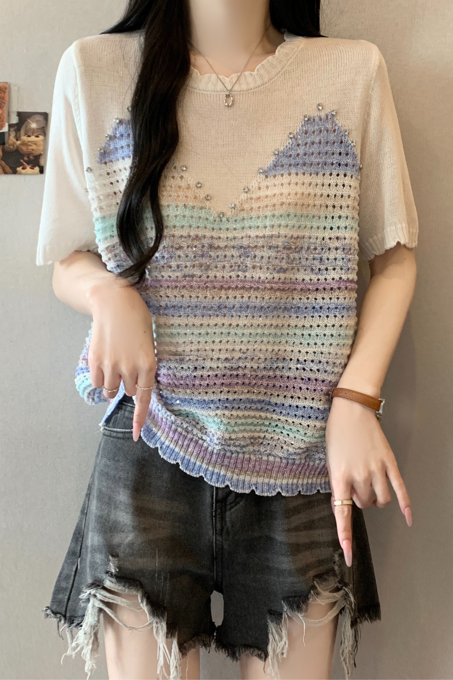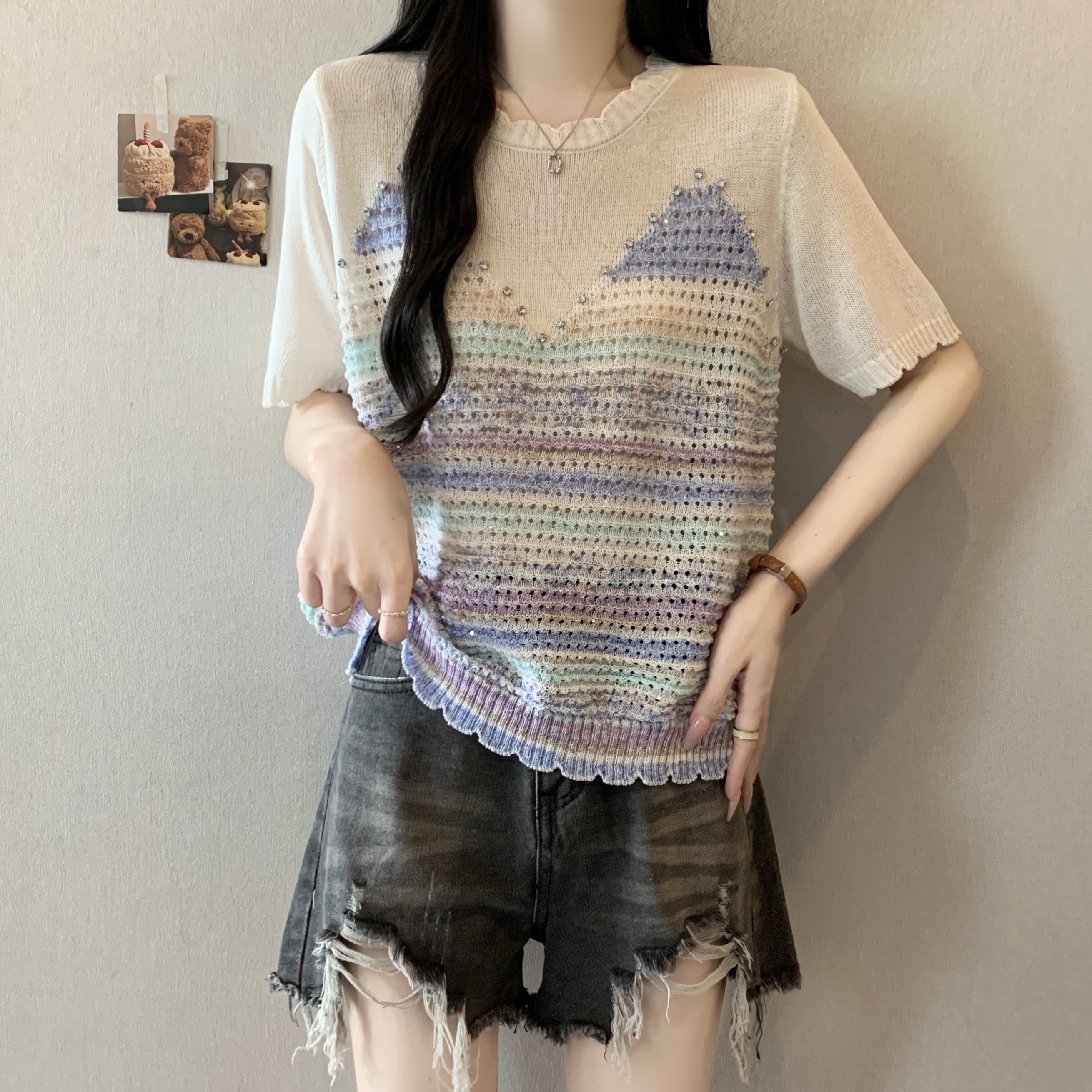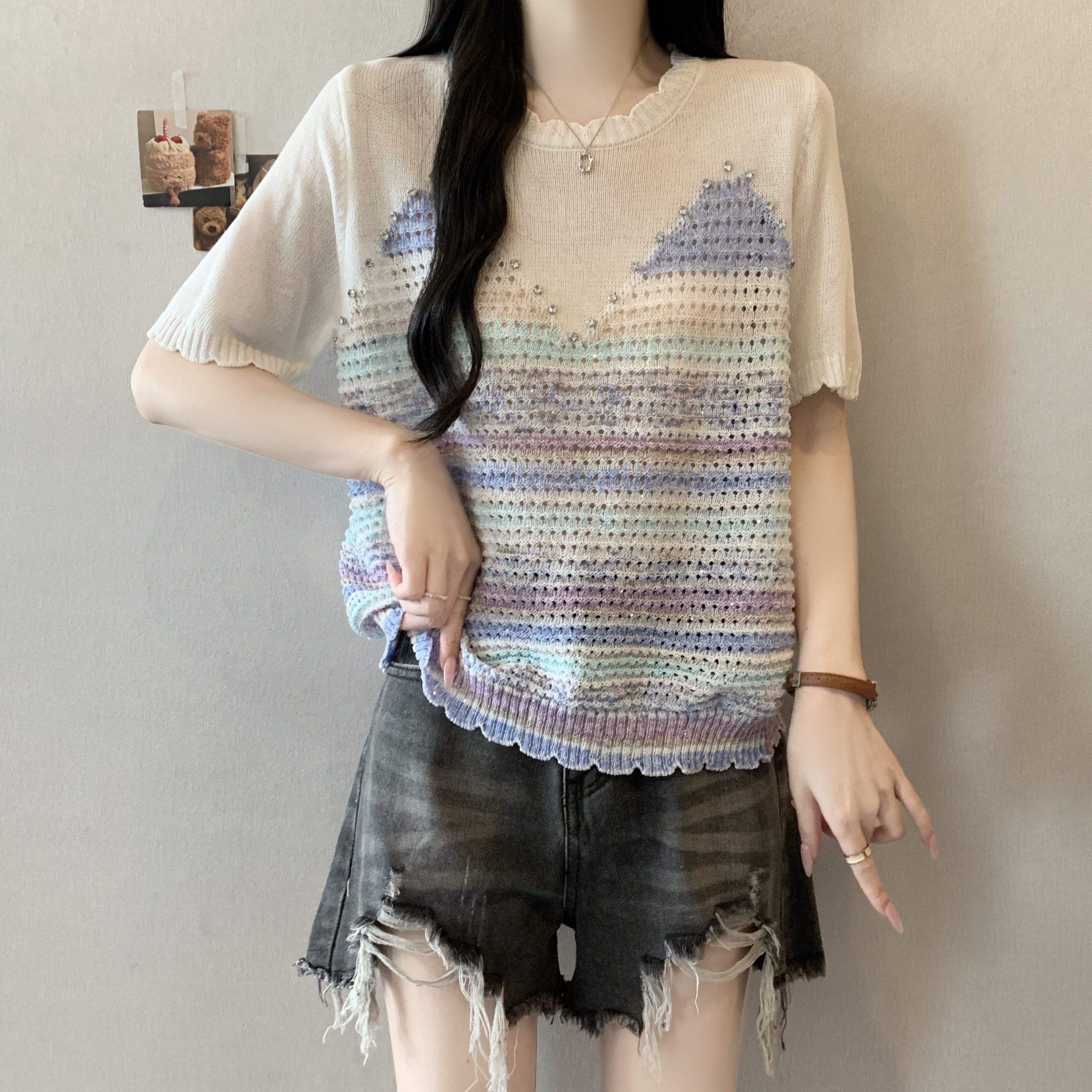 RY3896# 实拍 大码女装钉珠镂空彩色条纹针织衫宽松减龄短袖上衣