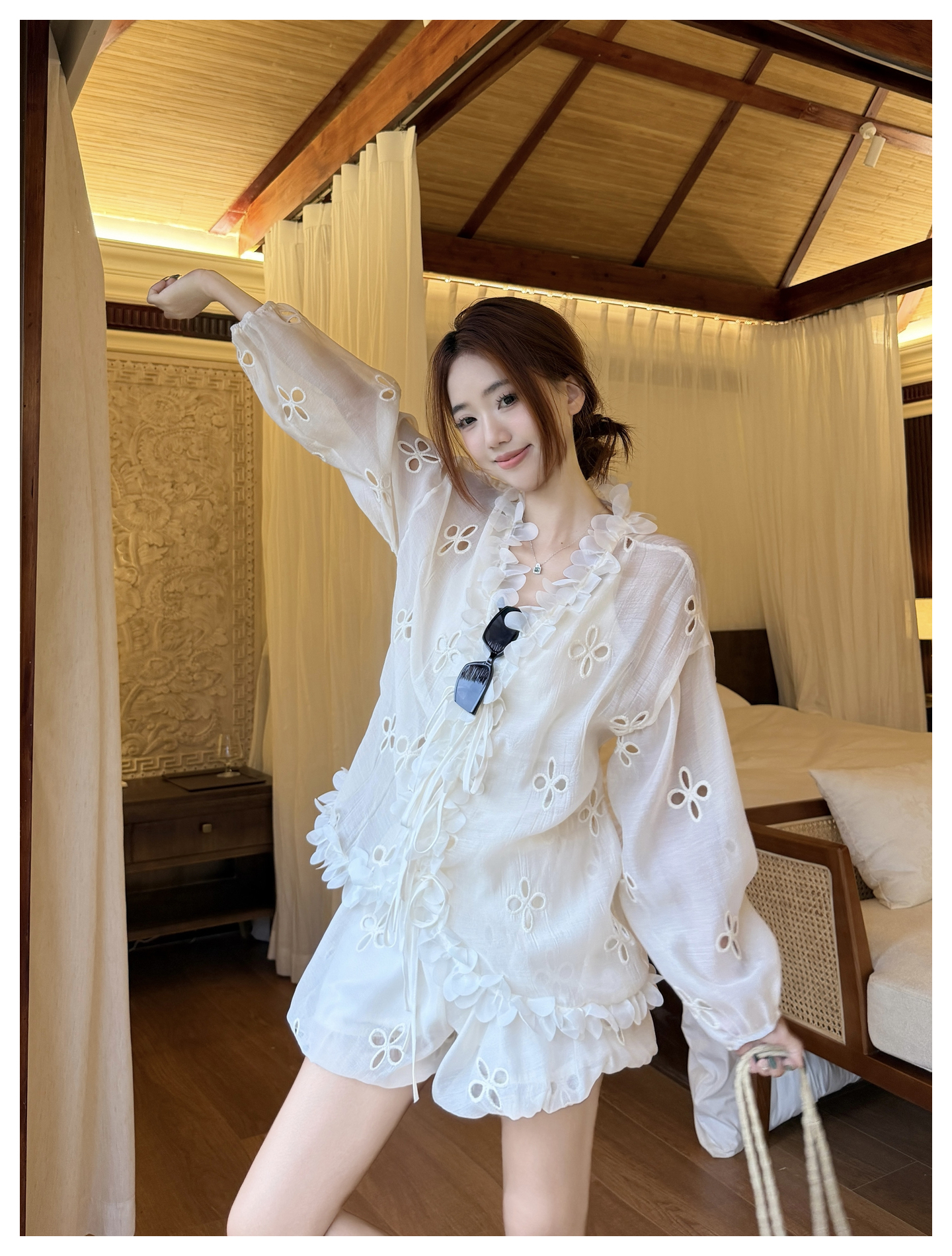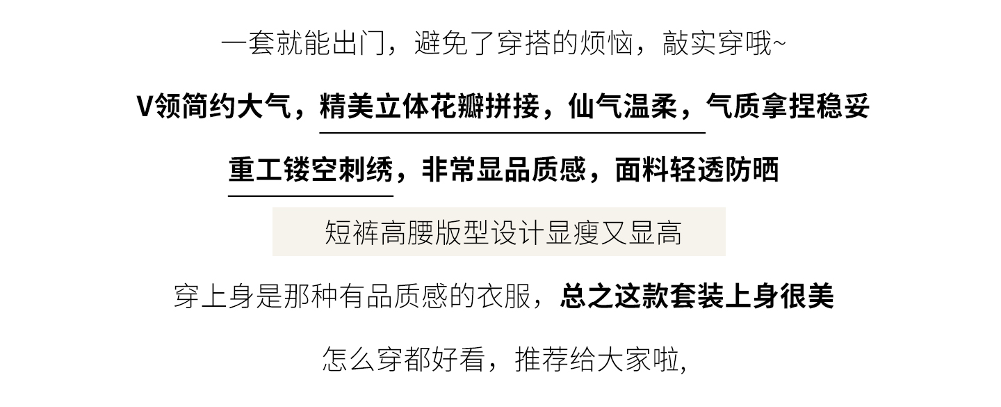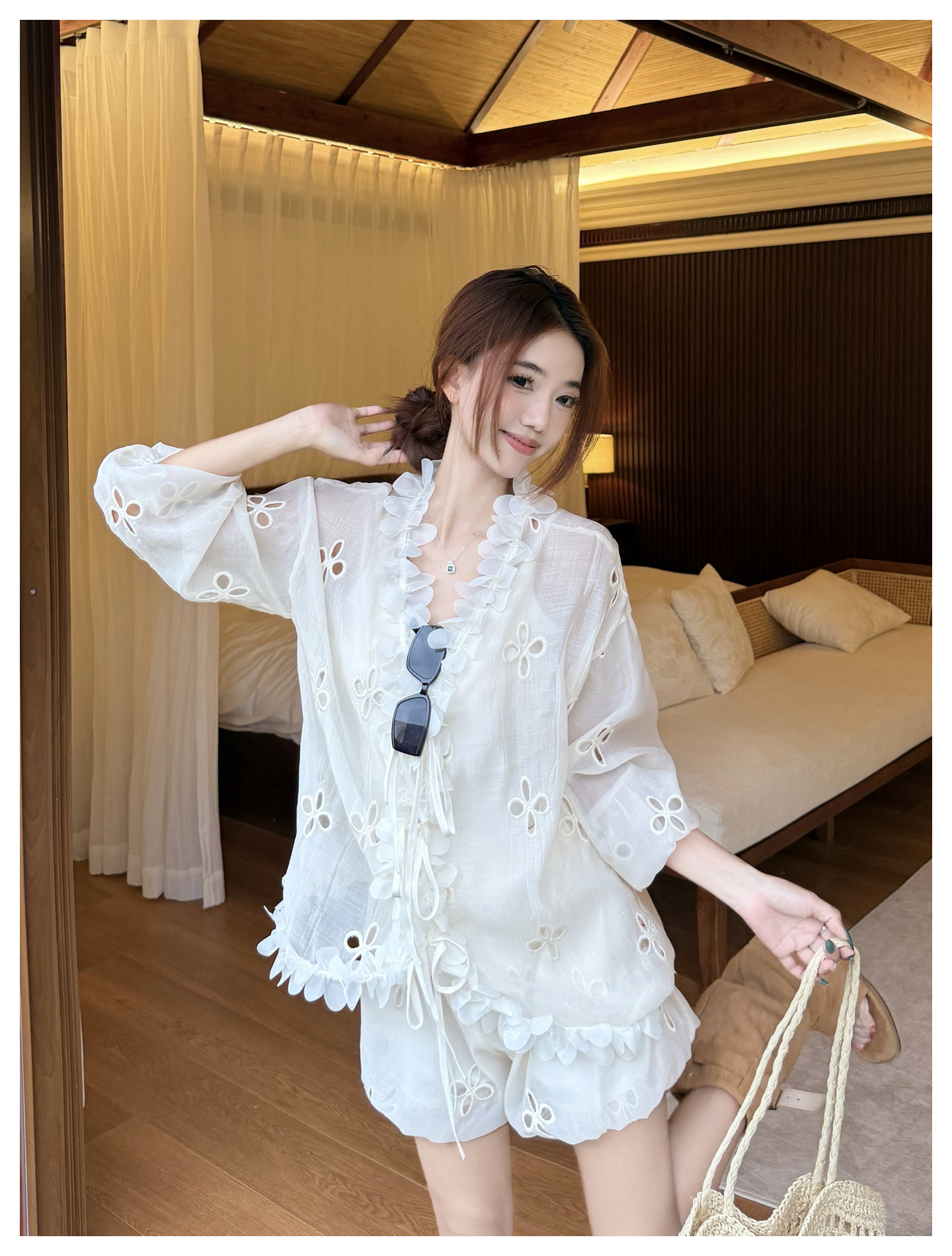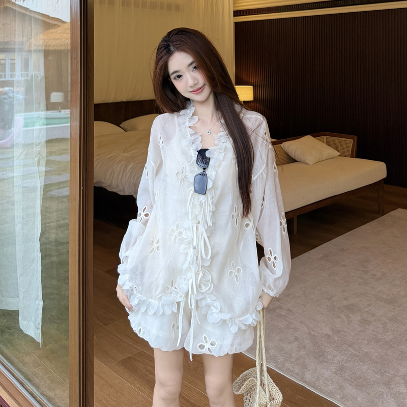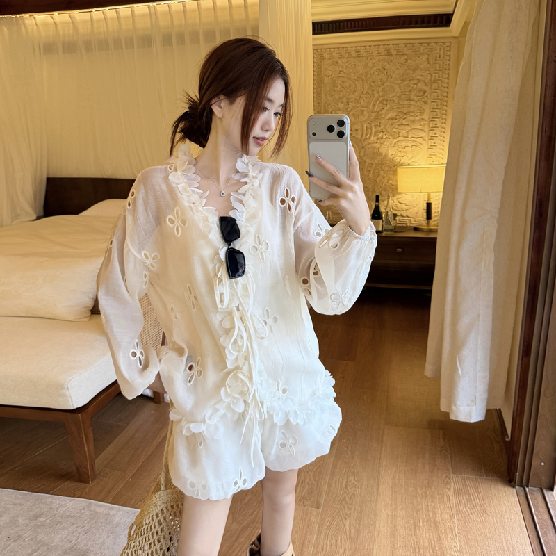 RY3902# 实拍·2026夏款甜美V领花边镂空花朵宽松衬衫+高腰短裤大码套装
