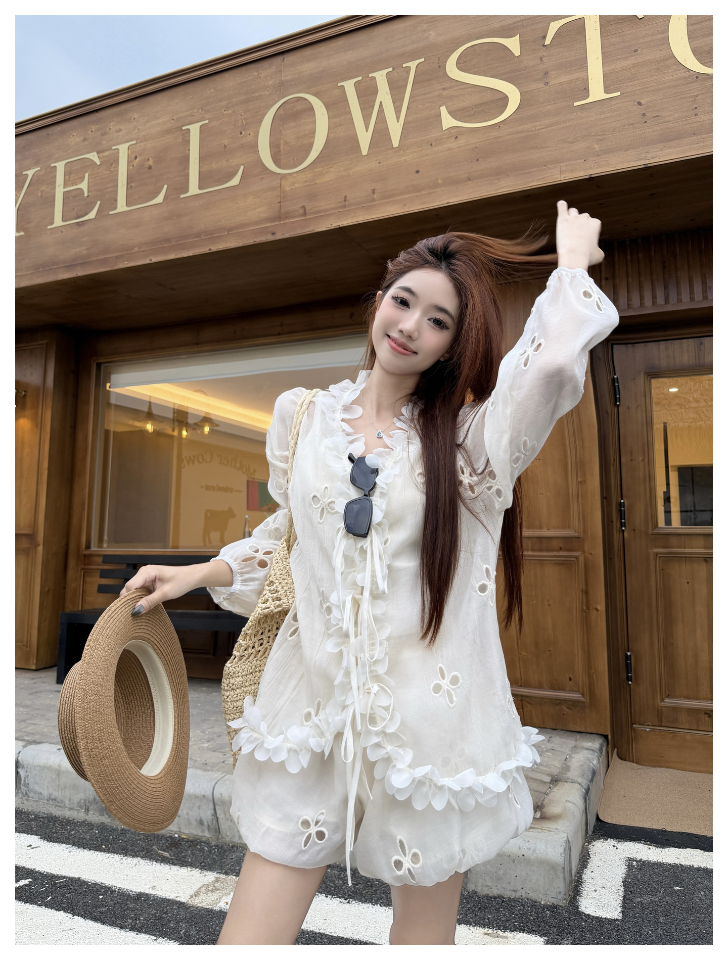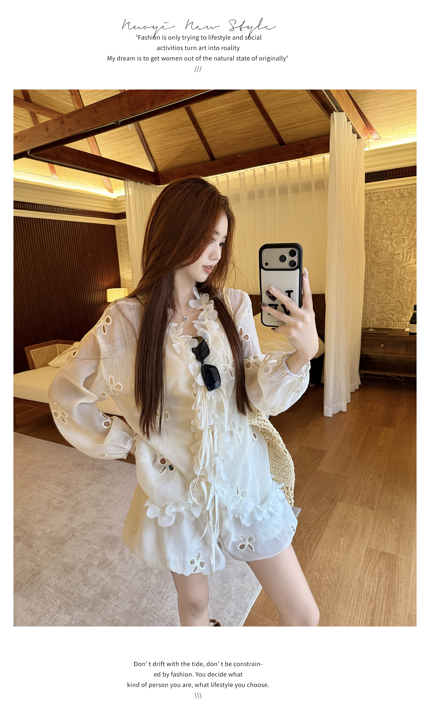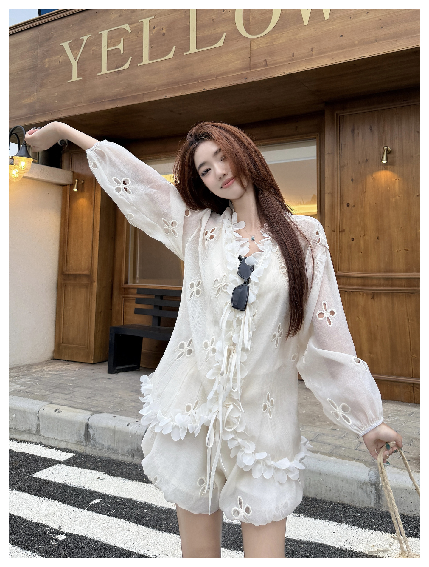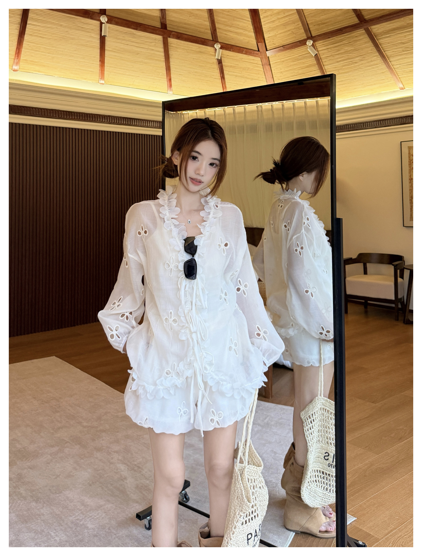 RY3902# 实拍·2026夏款甜美V领花边镂空花朵宽松衬衫+高腰短裤大码套装