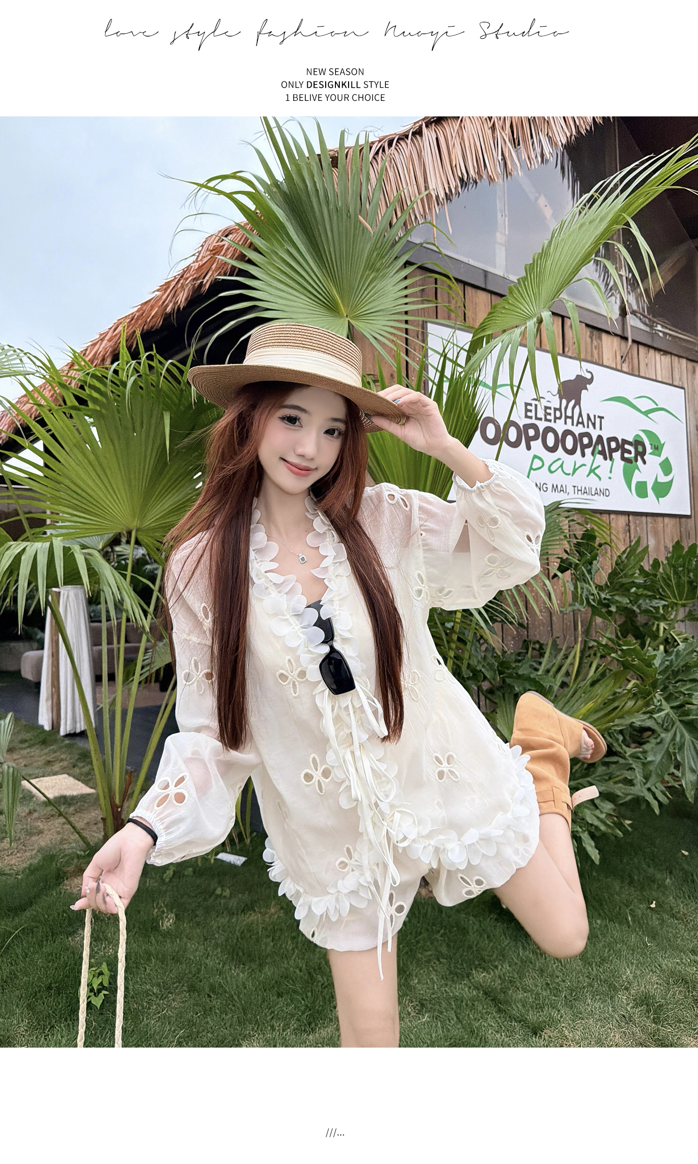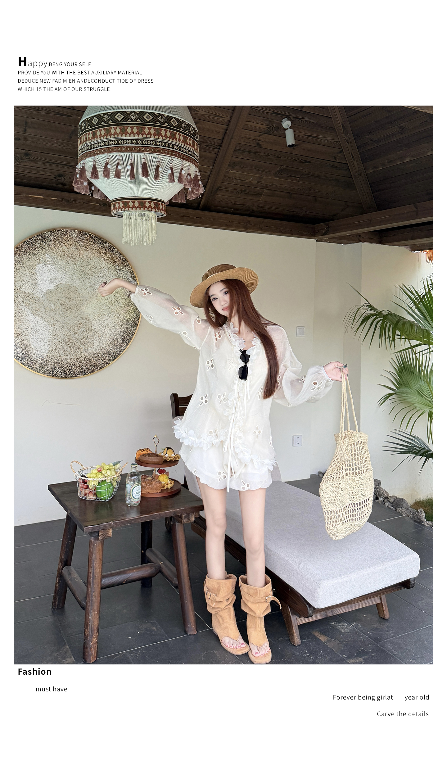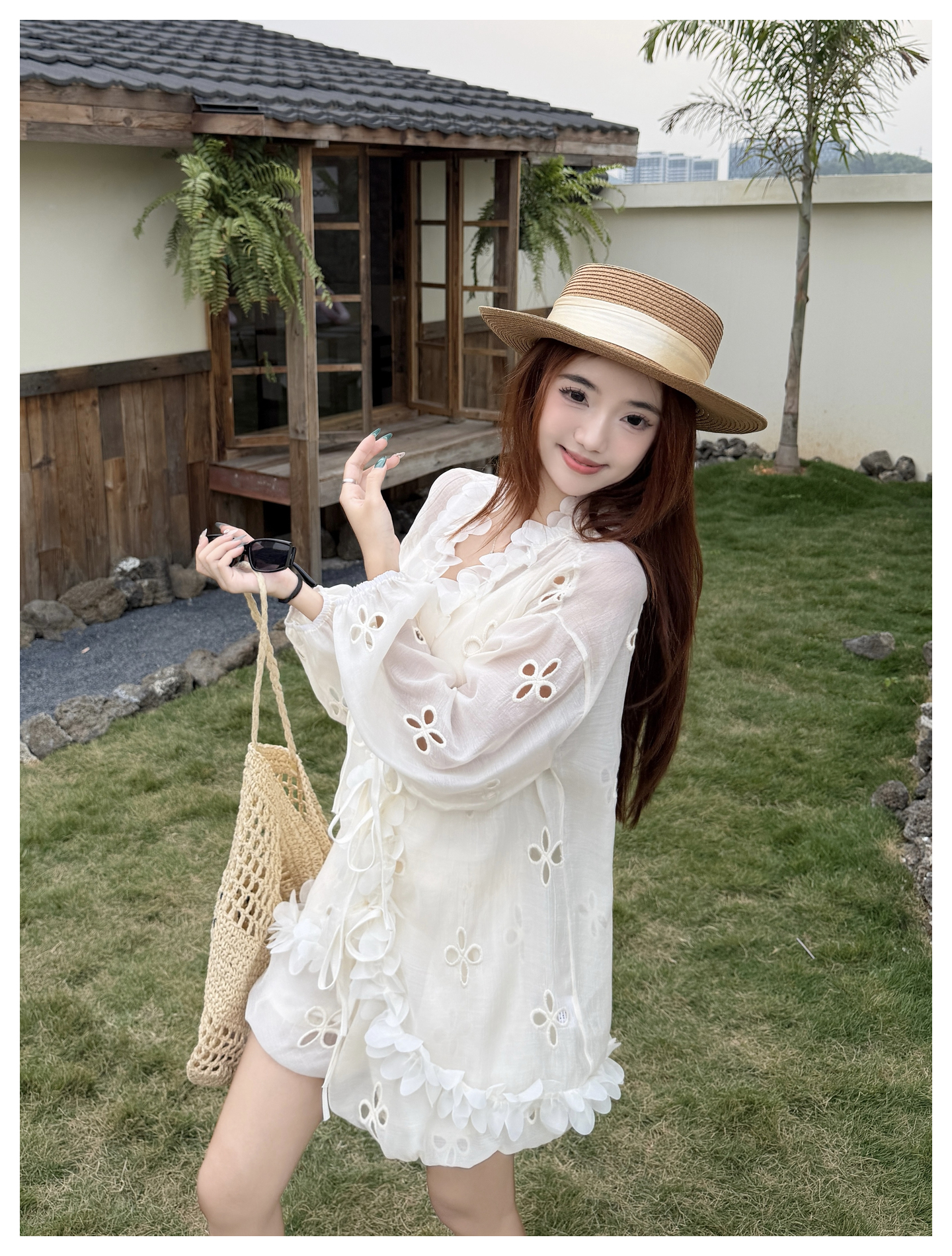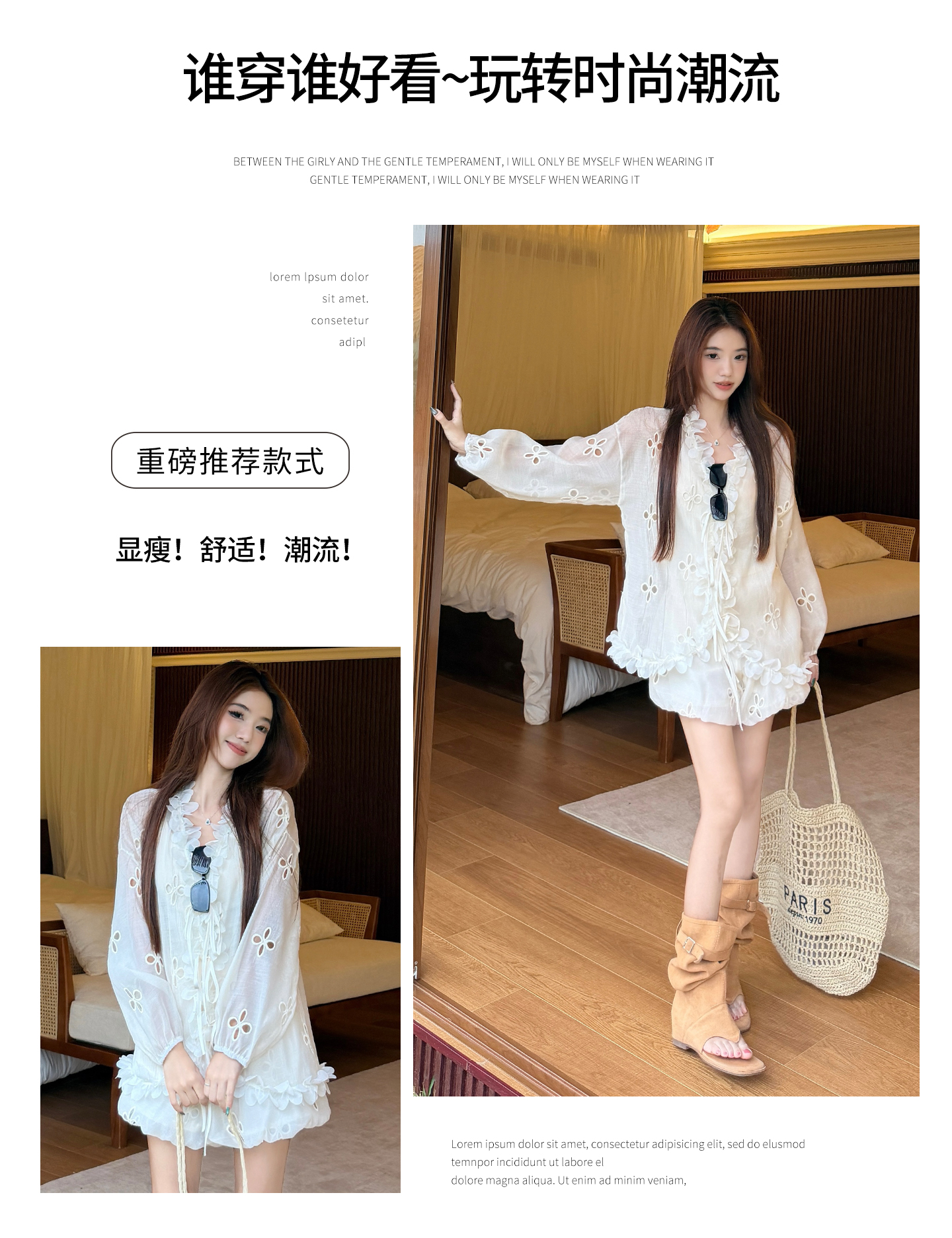 RY3902# 实拍·2026夏款甜美V领花边镂空花朵宽松衬衫+高腰短裤大码套装