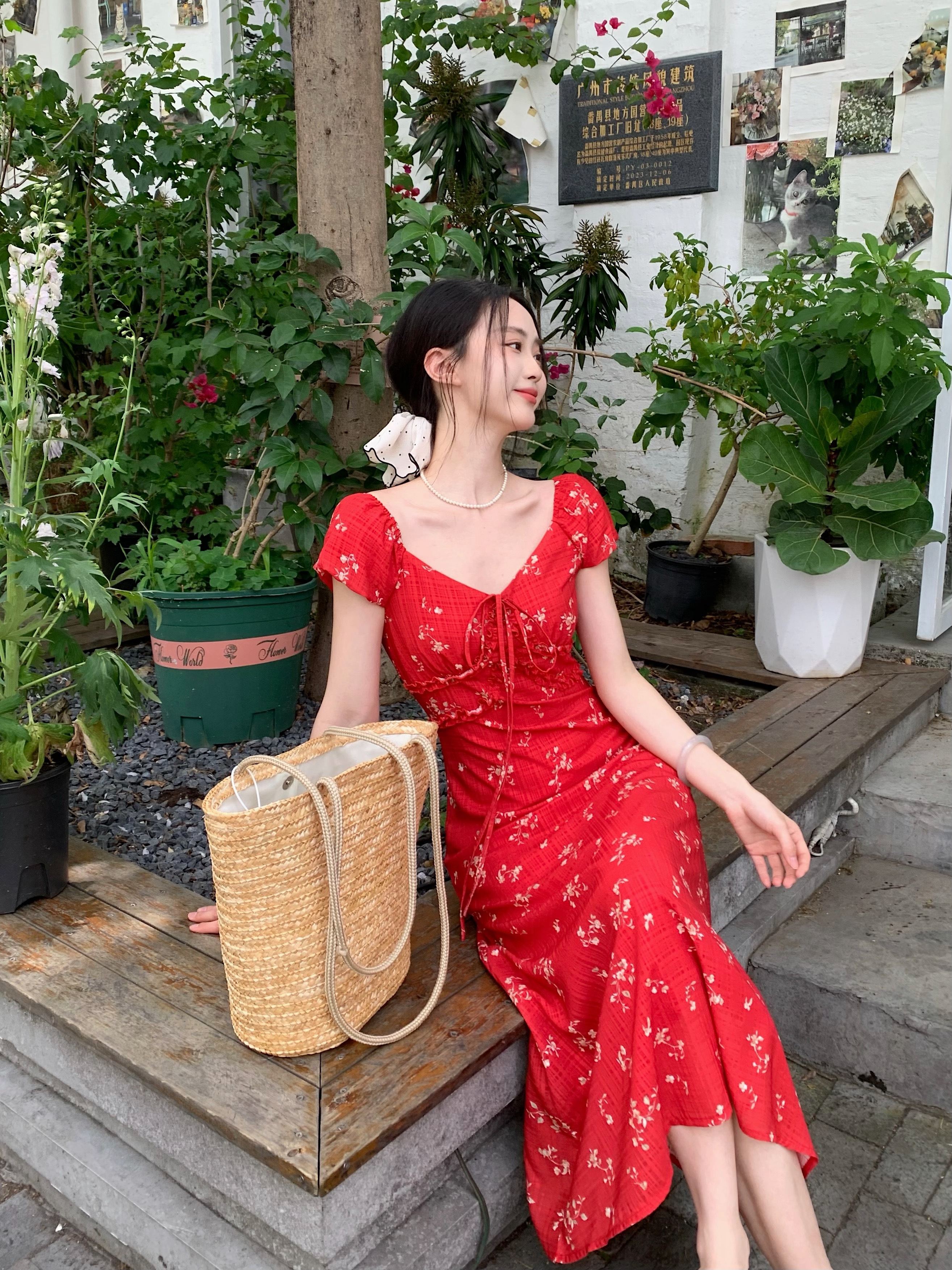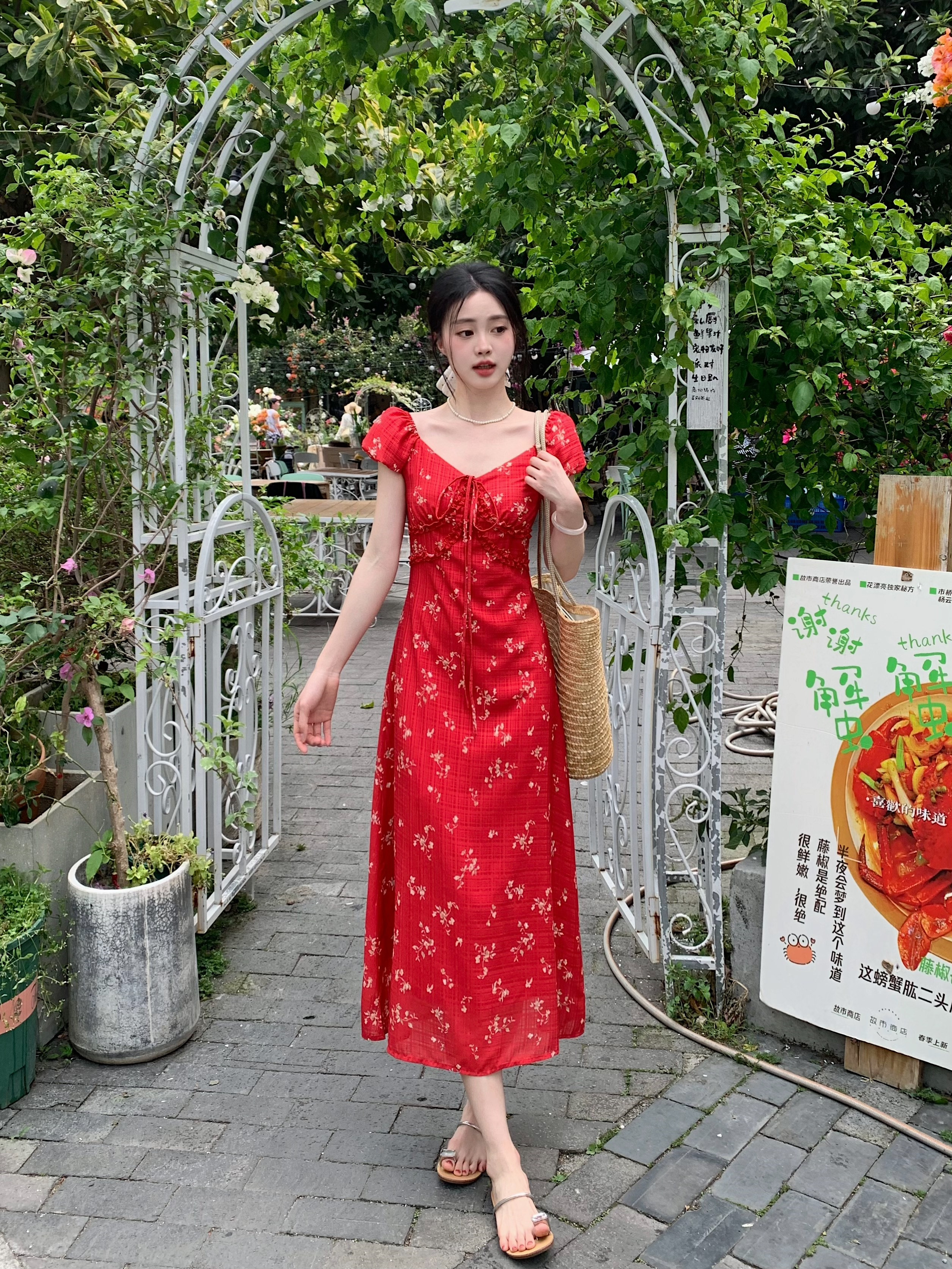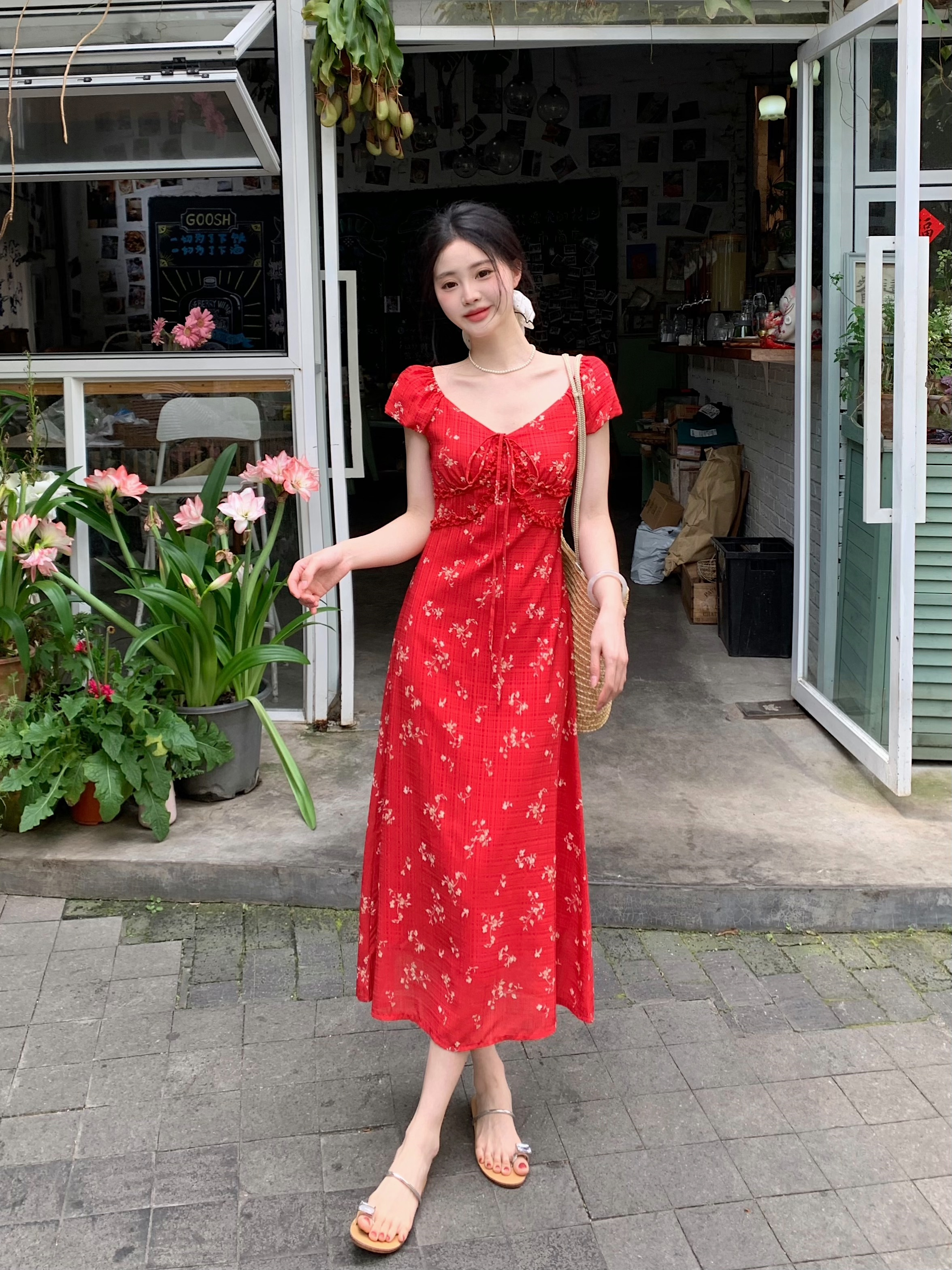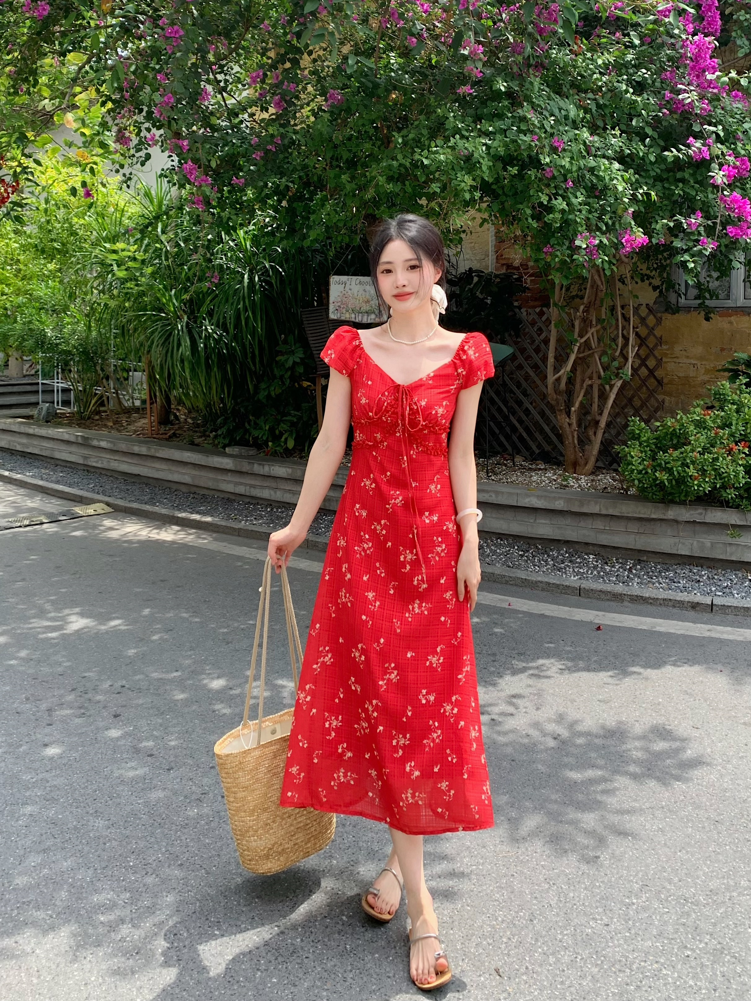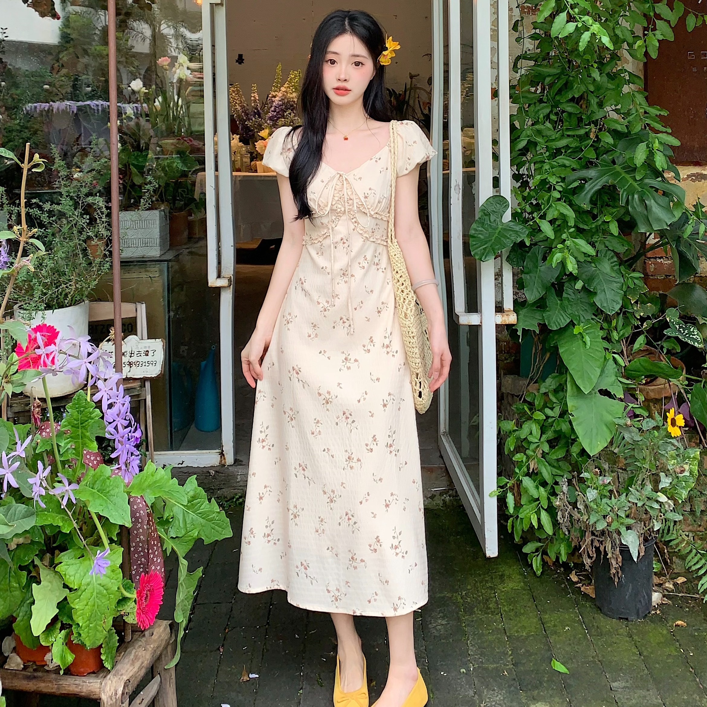 RY3914# 大码法式绝美V领碎花连衣裙女2026夏季气质收腰长裙茶歇裙度假裙
