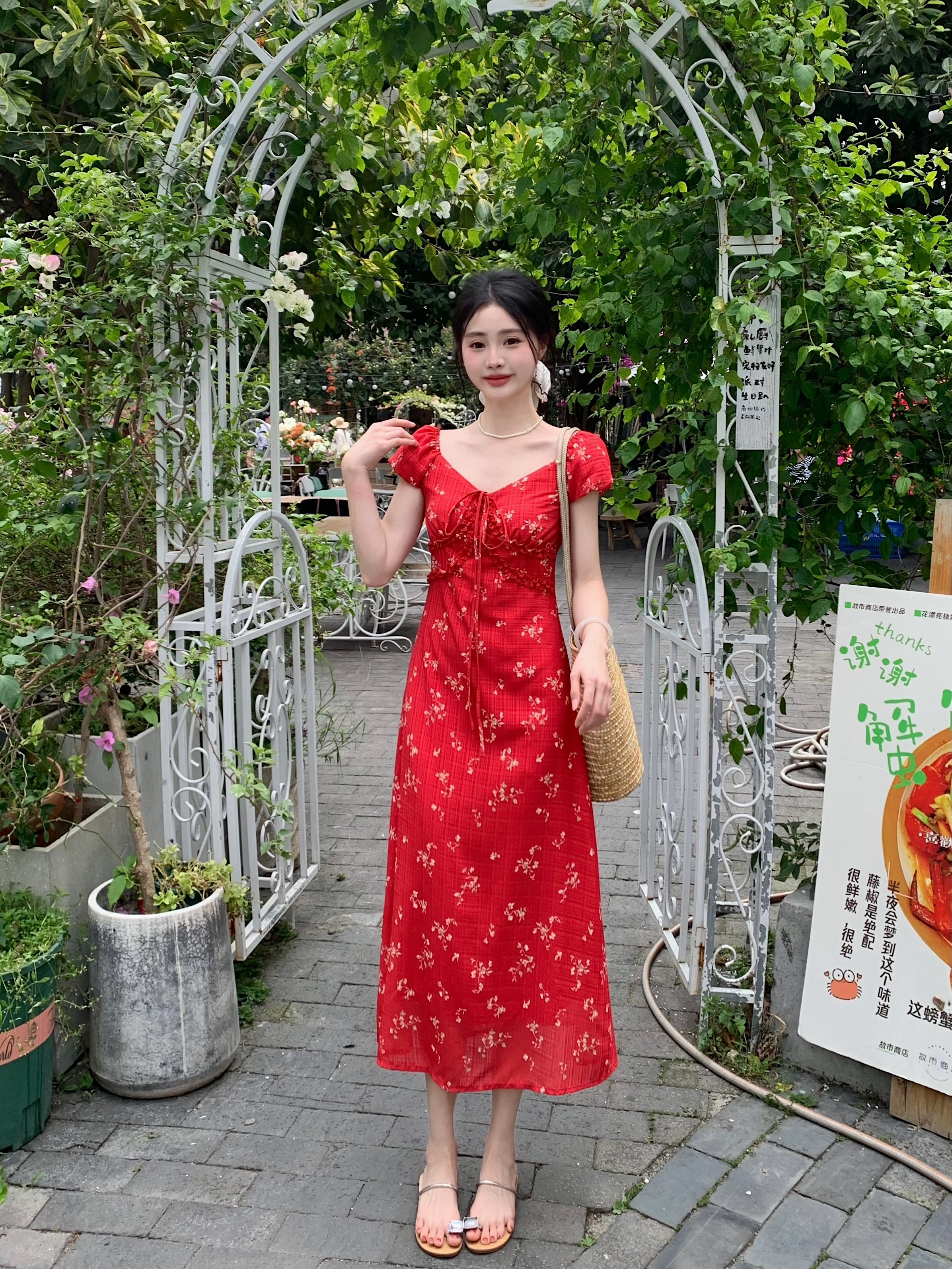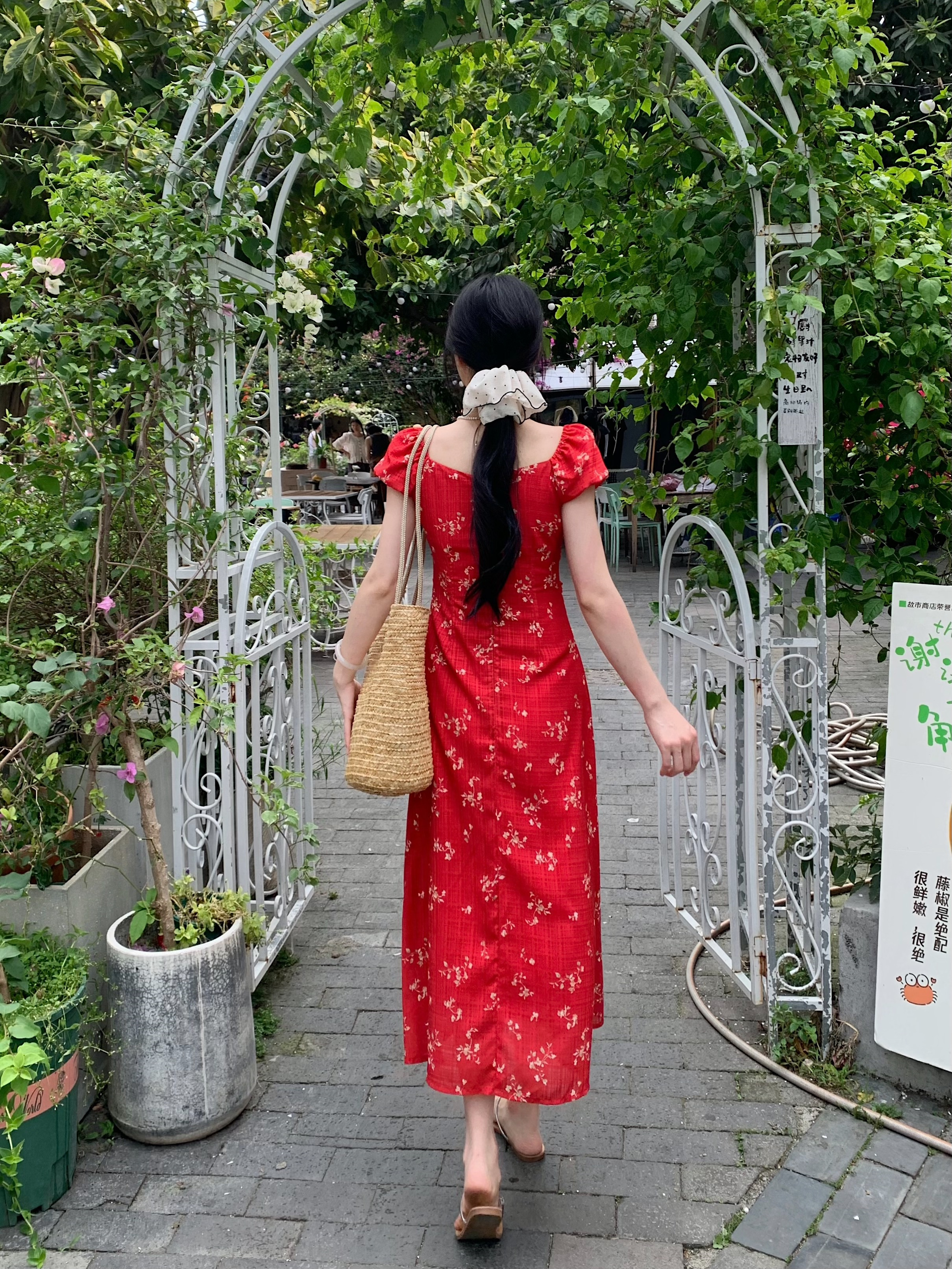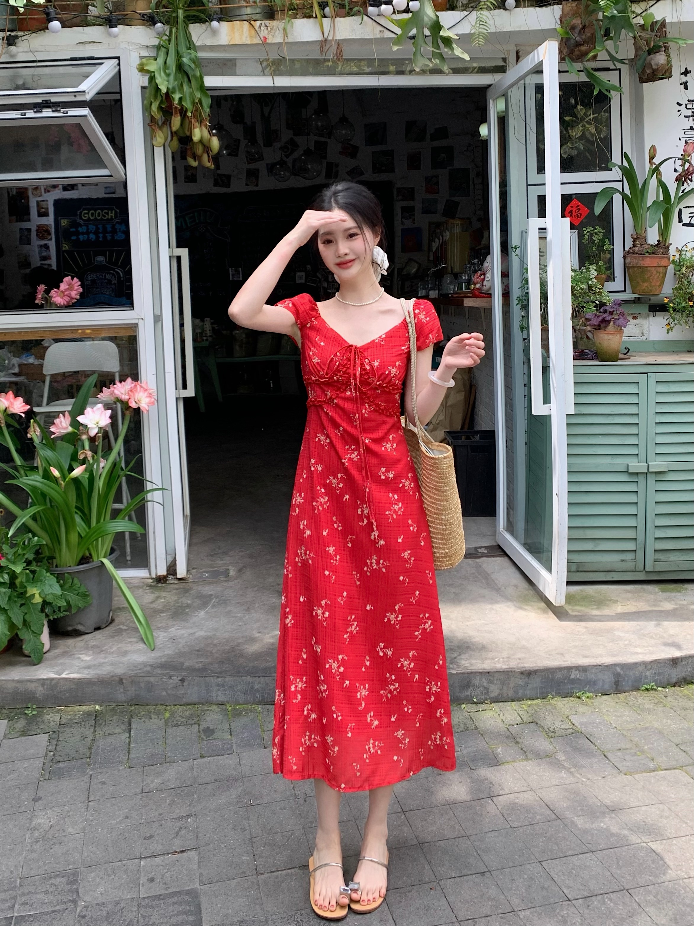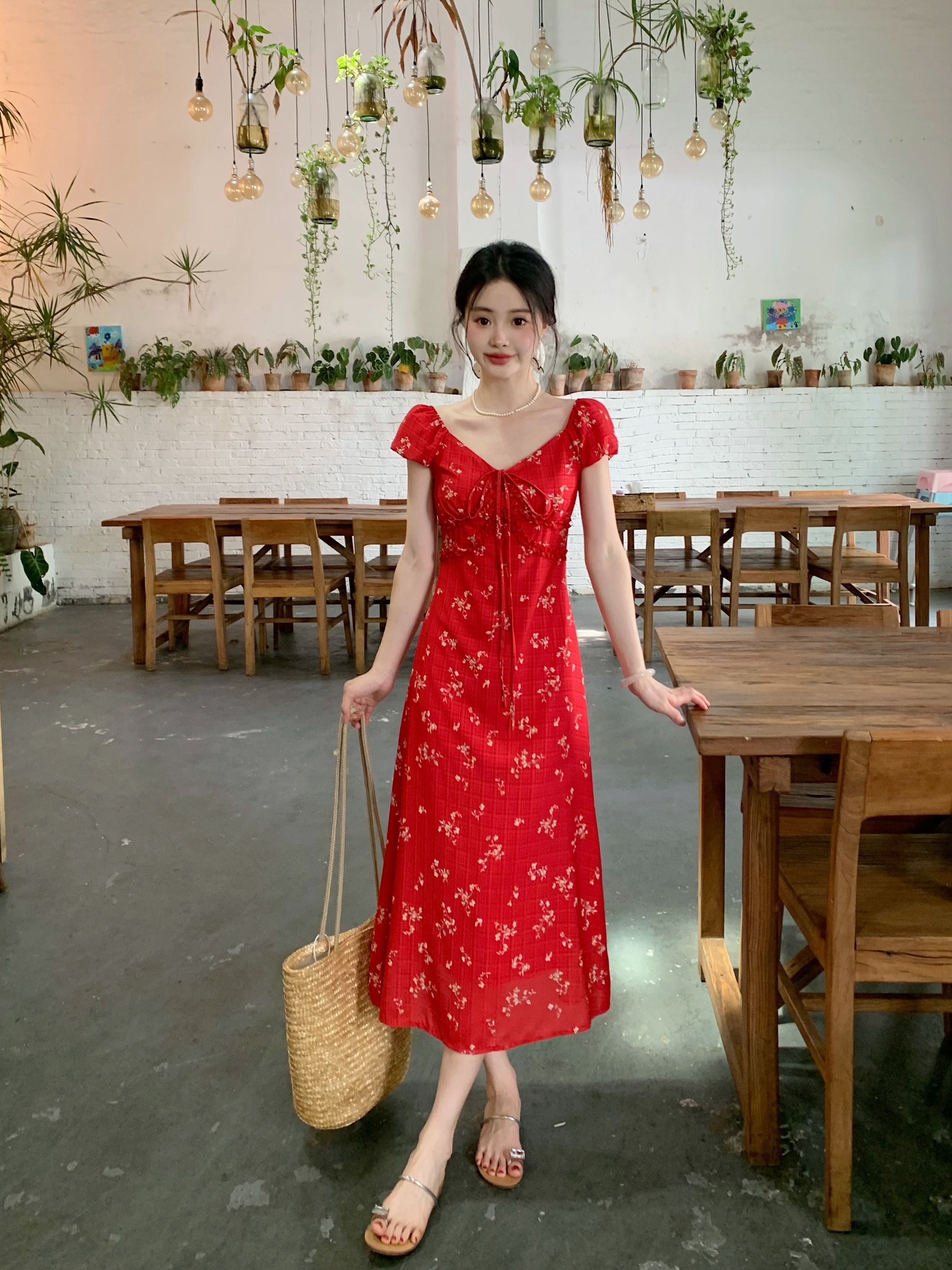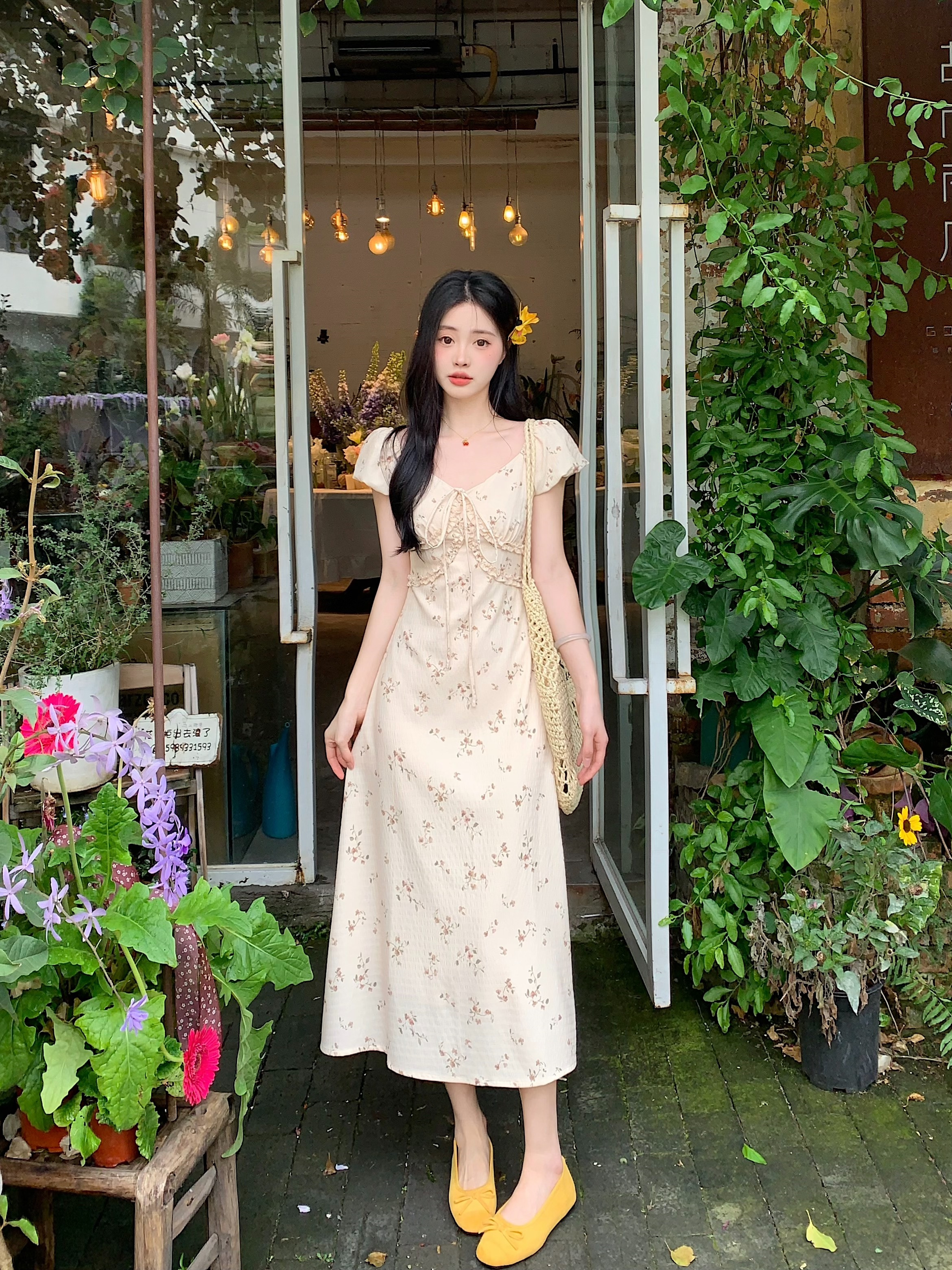 RY3914# 大码法式绝美V领碎花连衣裙女2026夏季气质收腰长裙茶歇裙度假裙