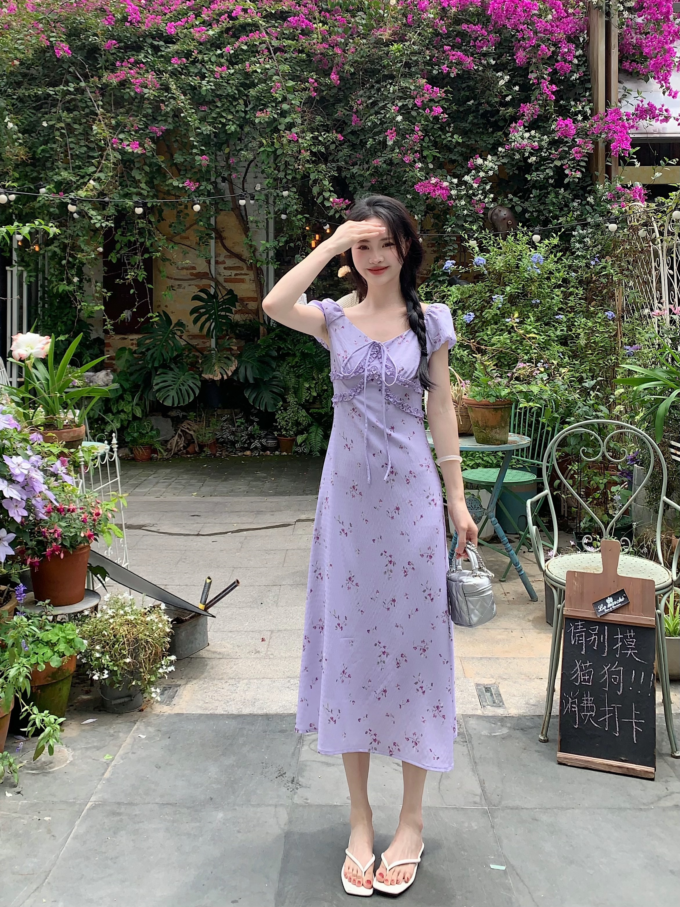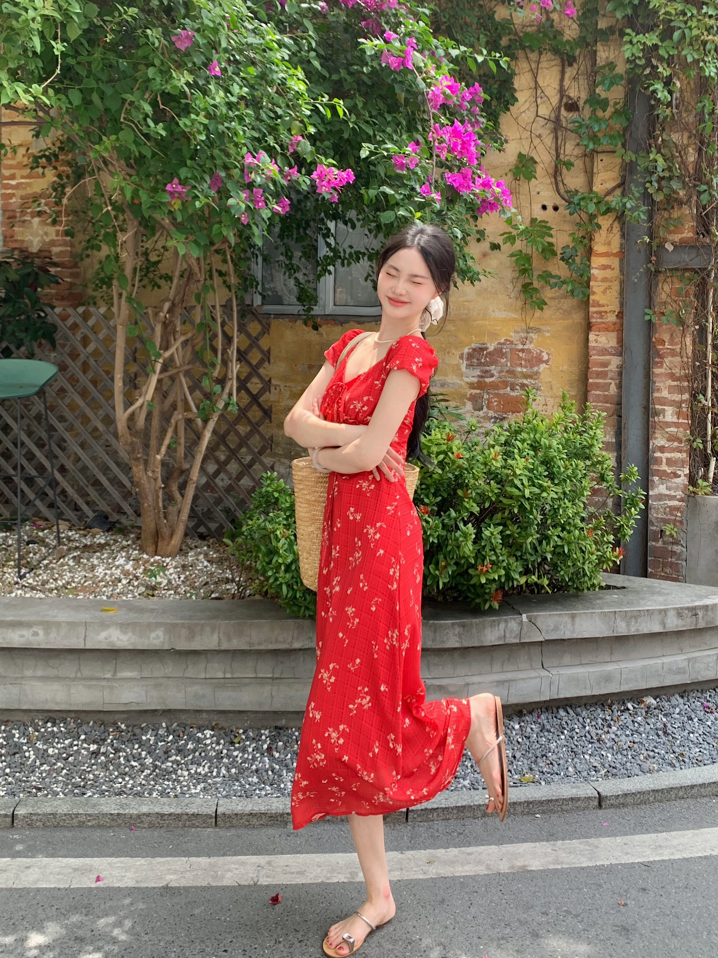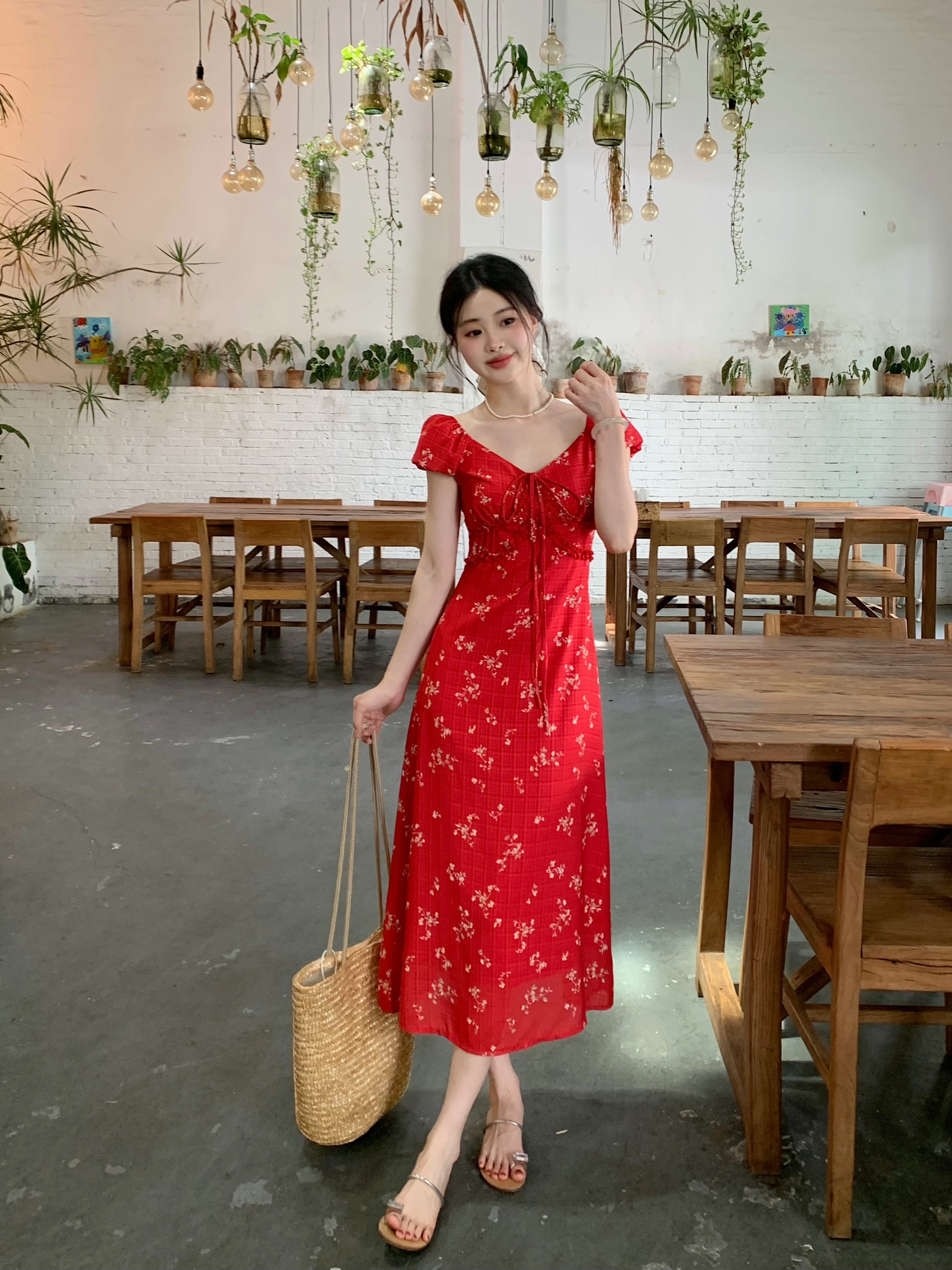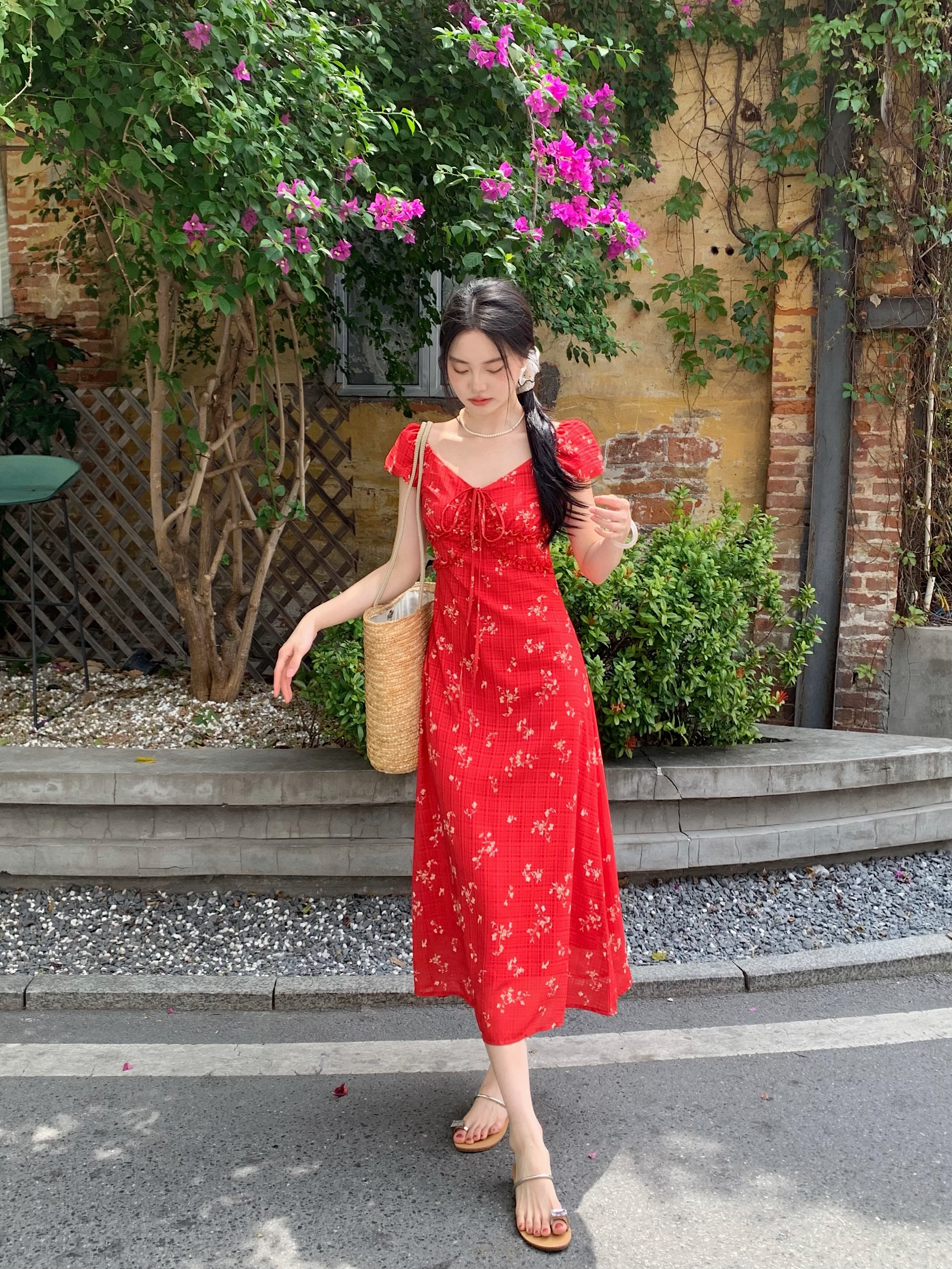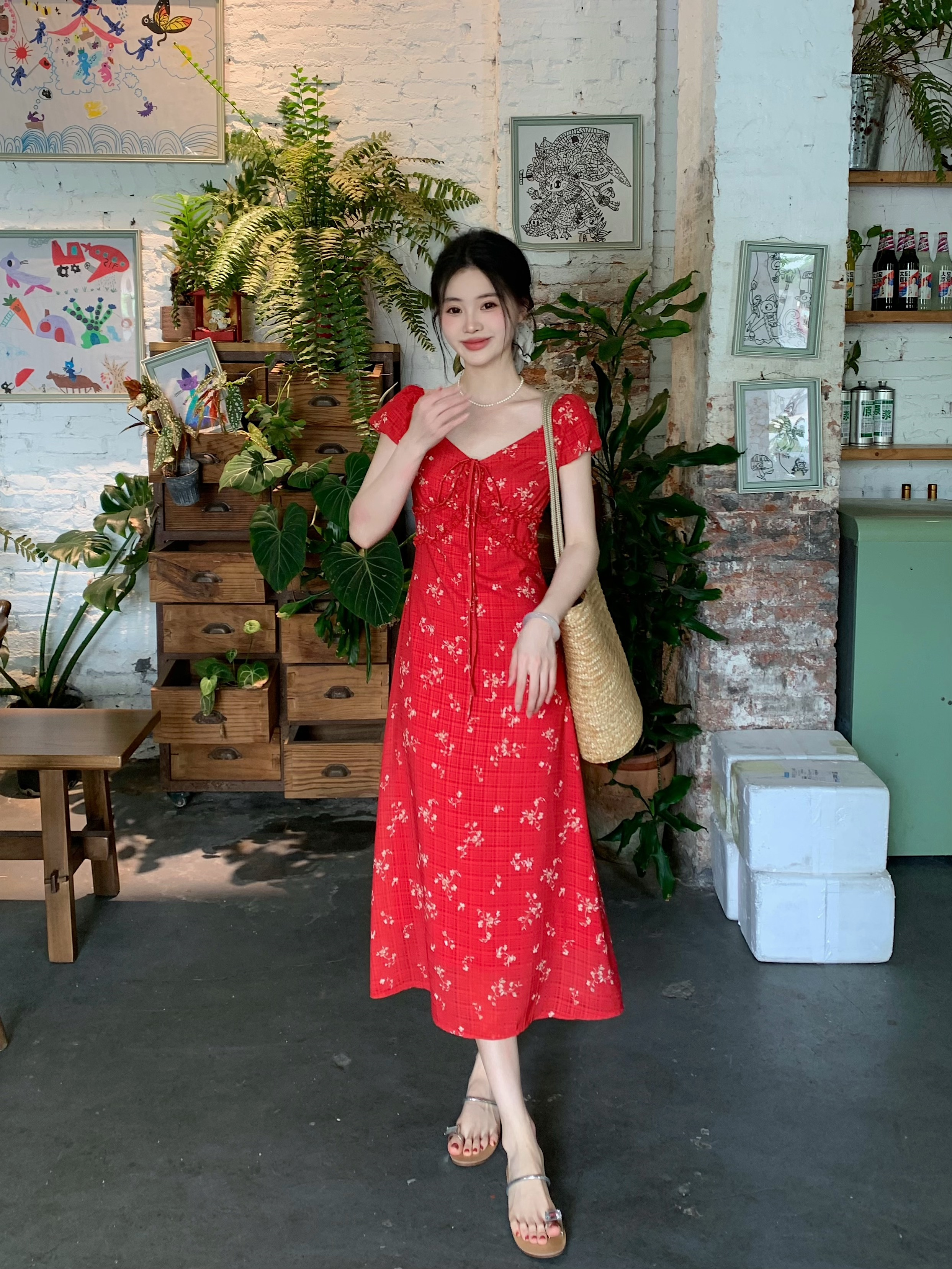 RY3914# 大码法式绝美V领碎花连衣裙女2026夏季气质收腰长裙茶歇裙度假裙