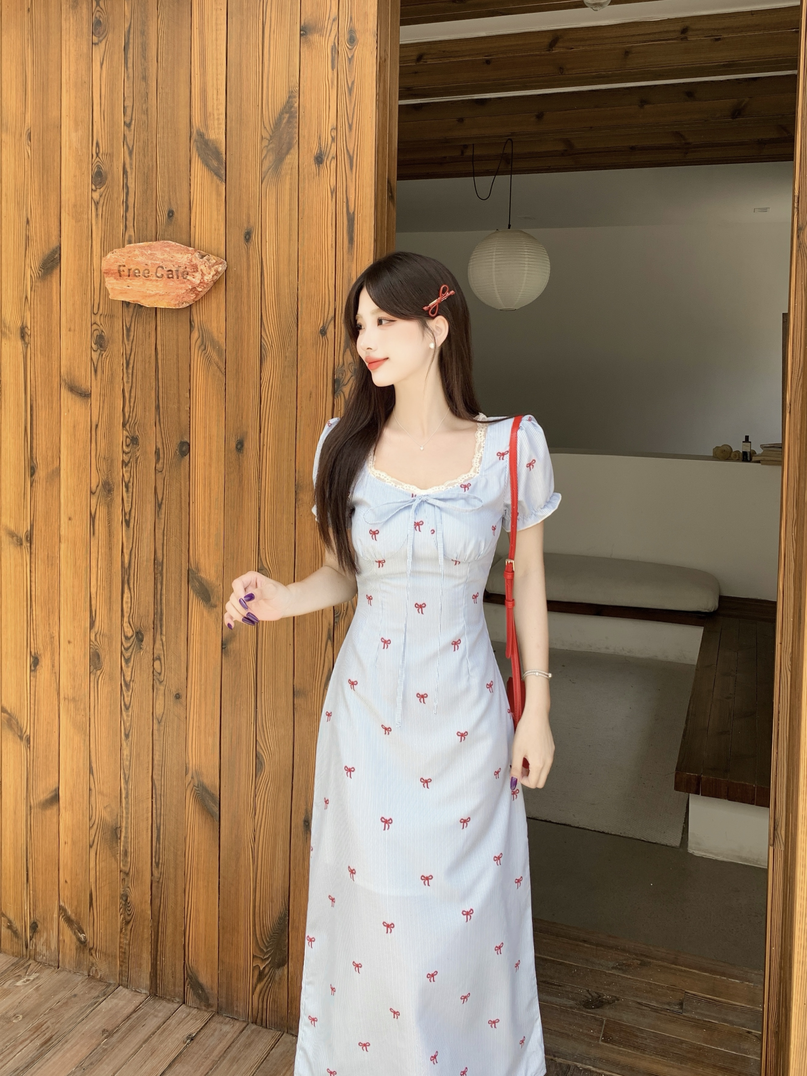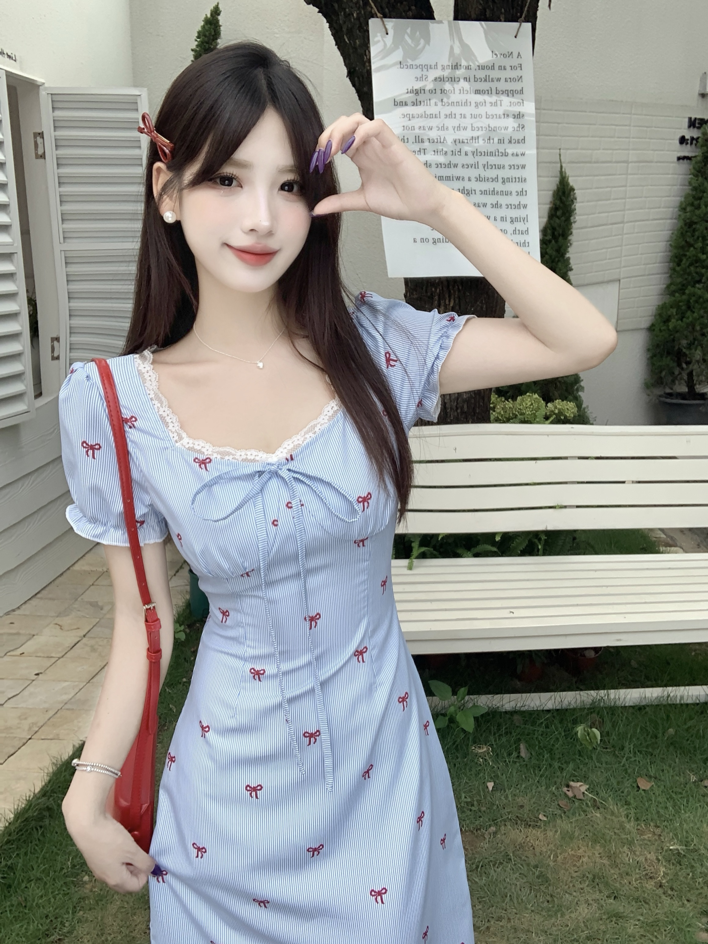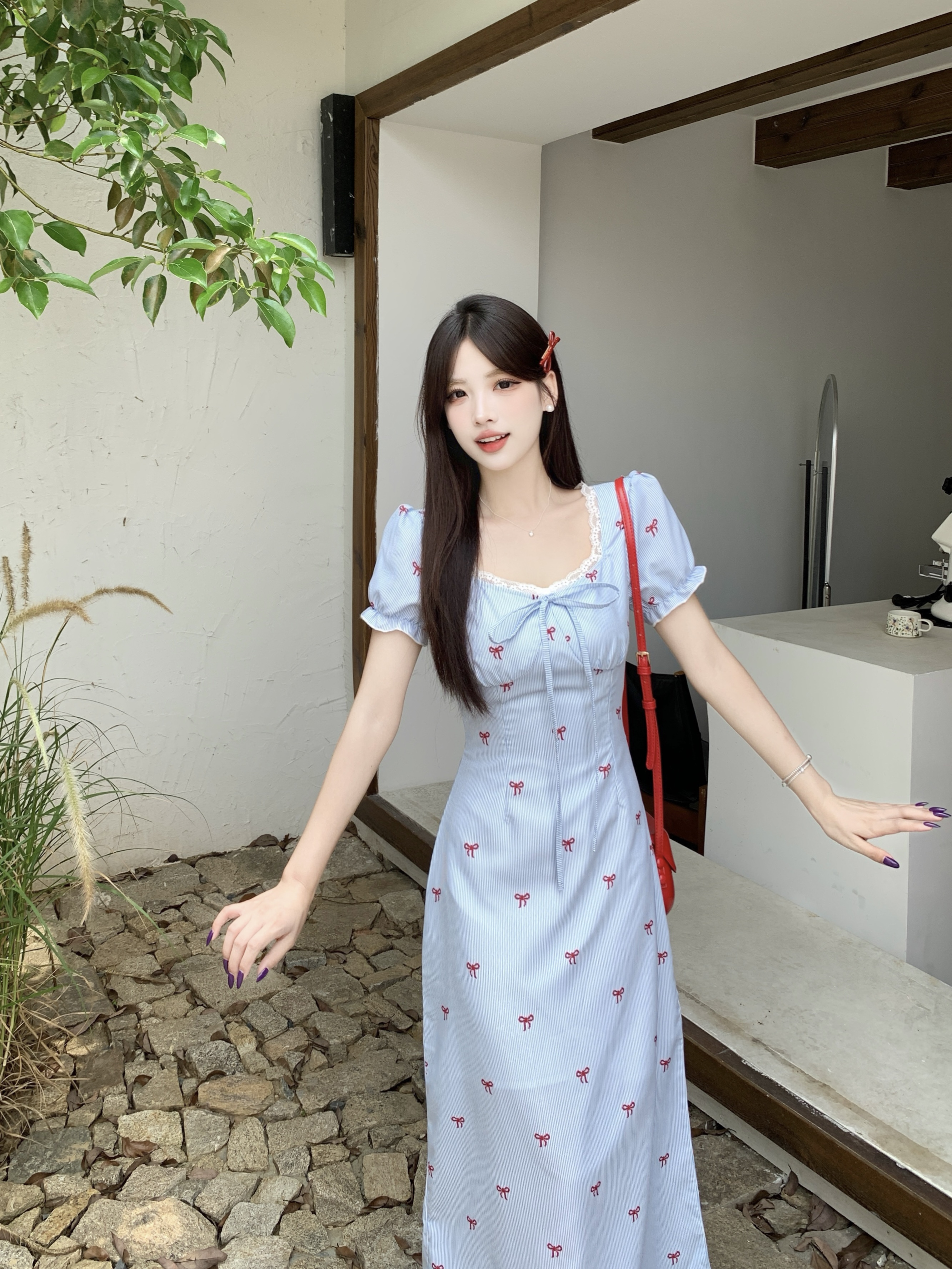 RY3916# 大码喜欢请响铃条纹气质夏季韩系小清新蝴蝶结泡泡袖花边连衣裙女