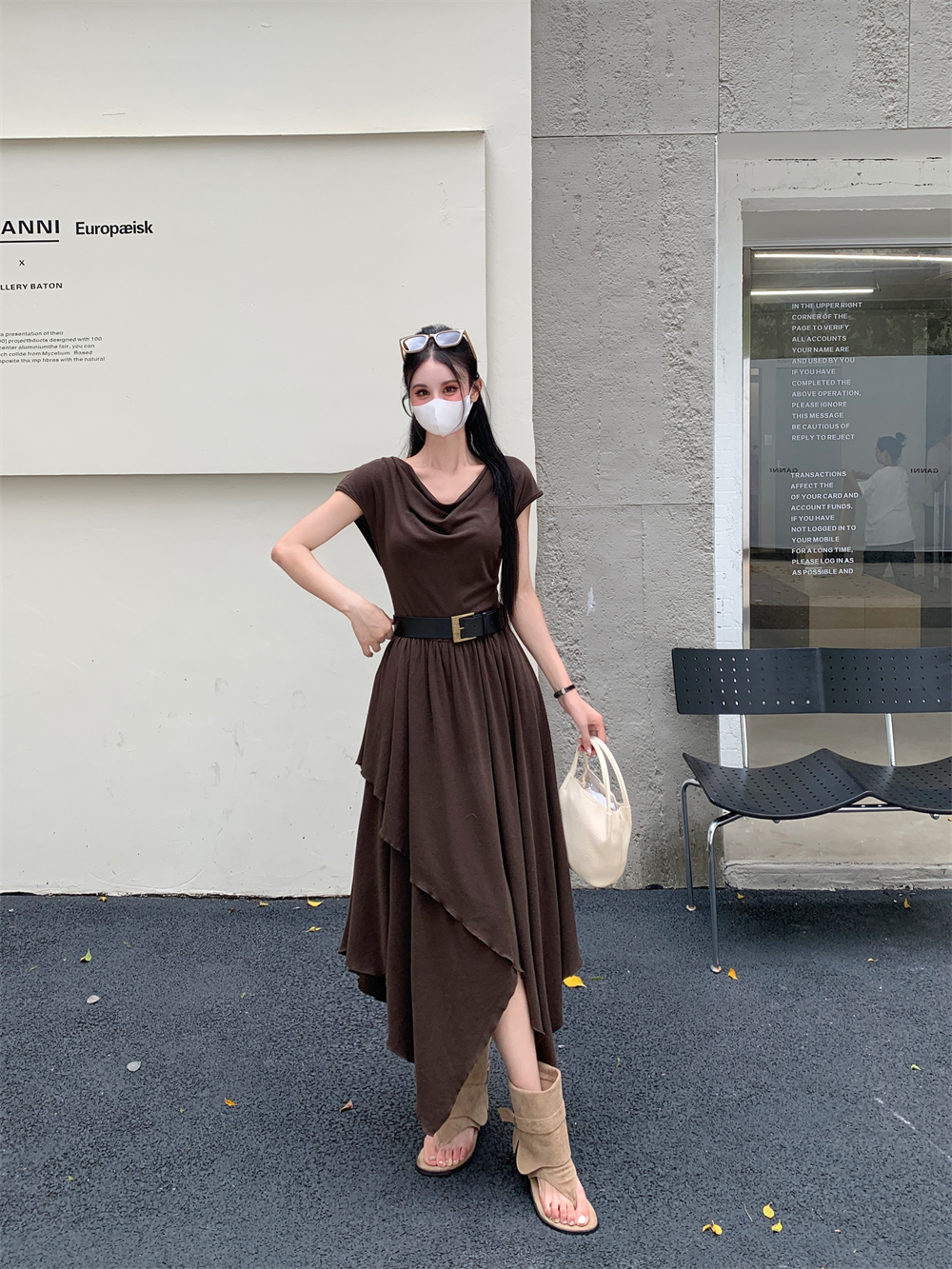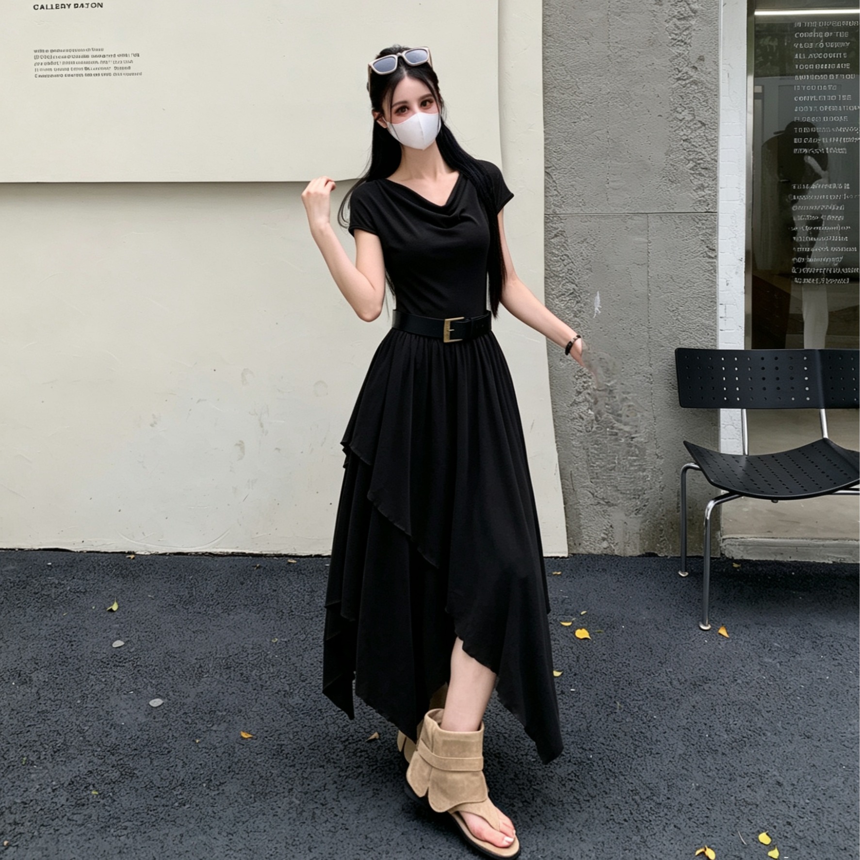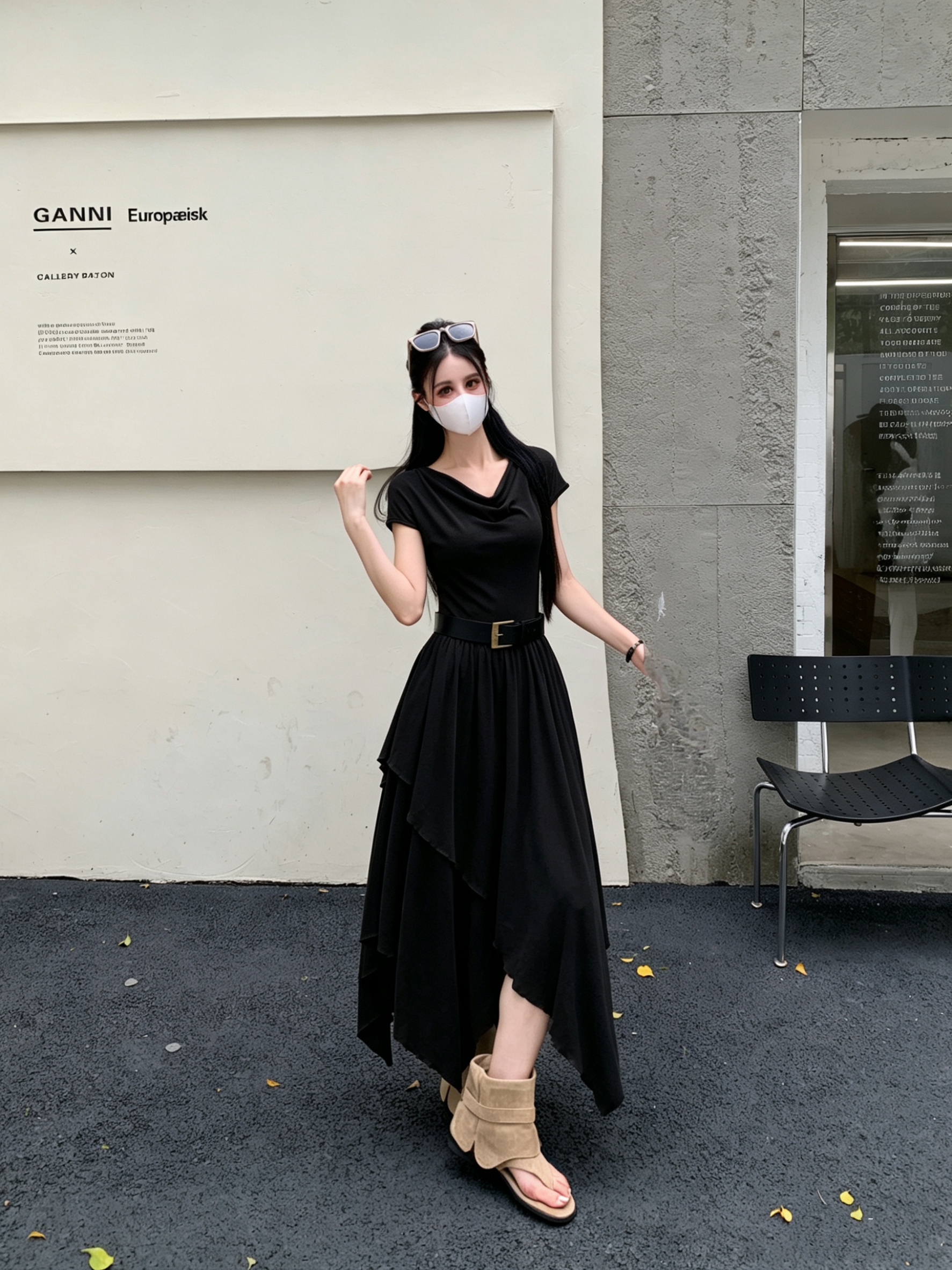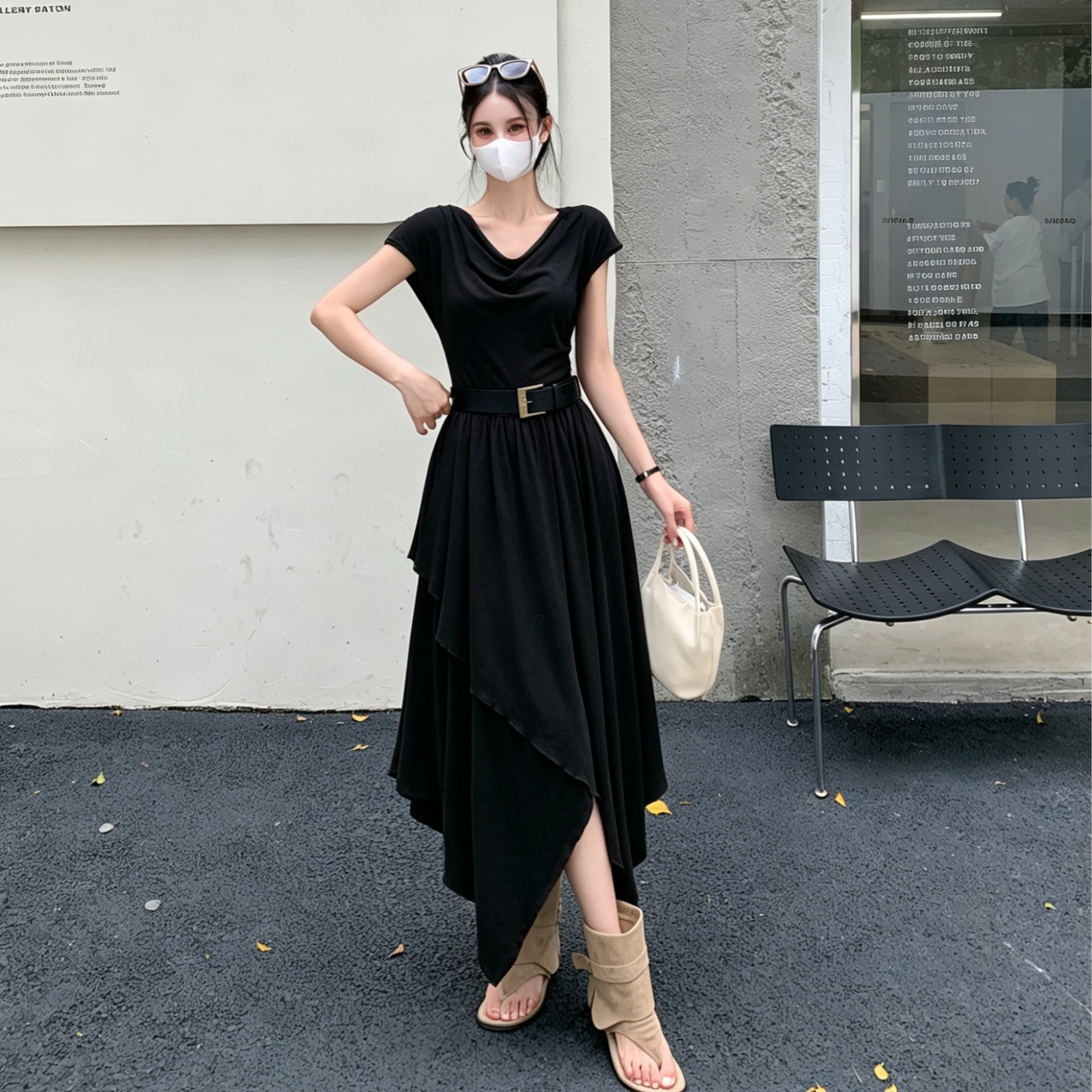 RY3928# 实拍夏季新款不规则垂感荡领遮肉显瘦收腰大码连衣裙女气质长裙