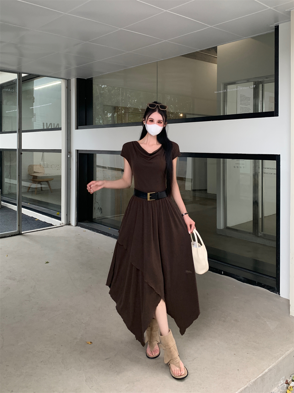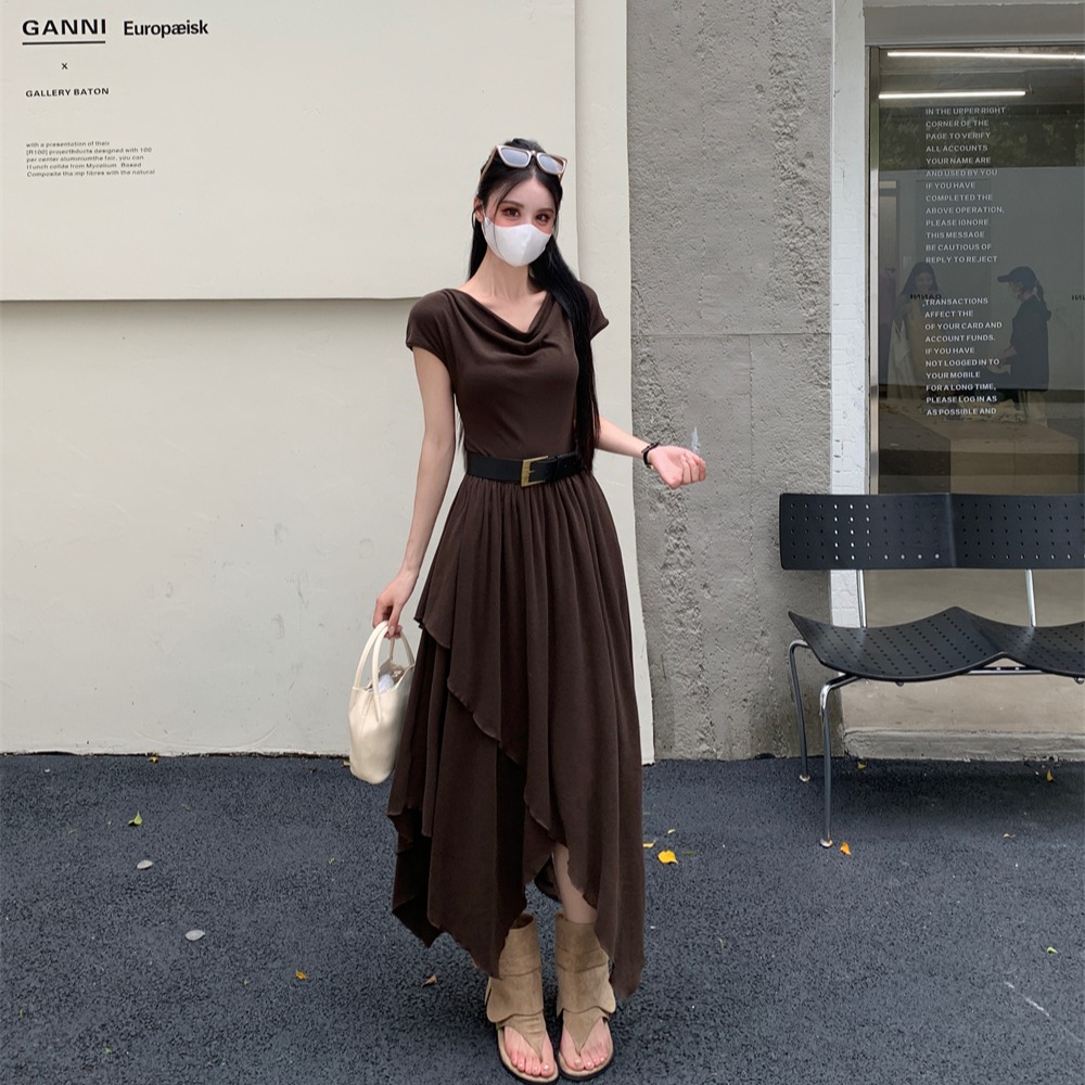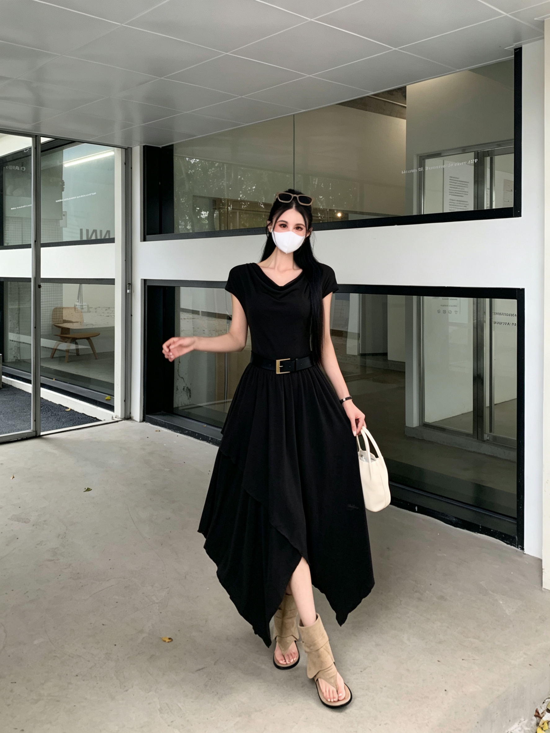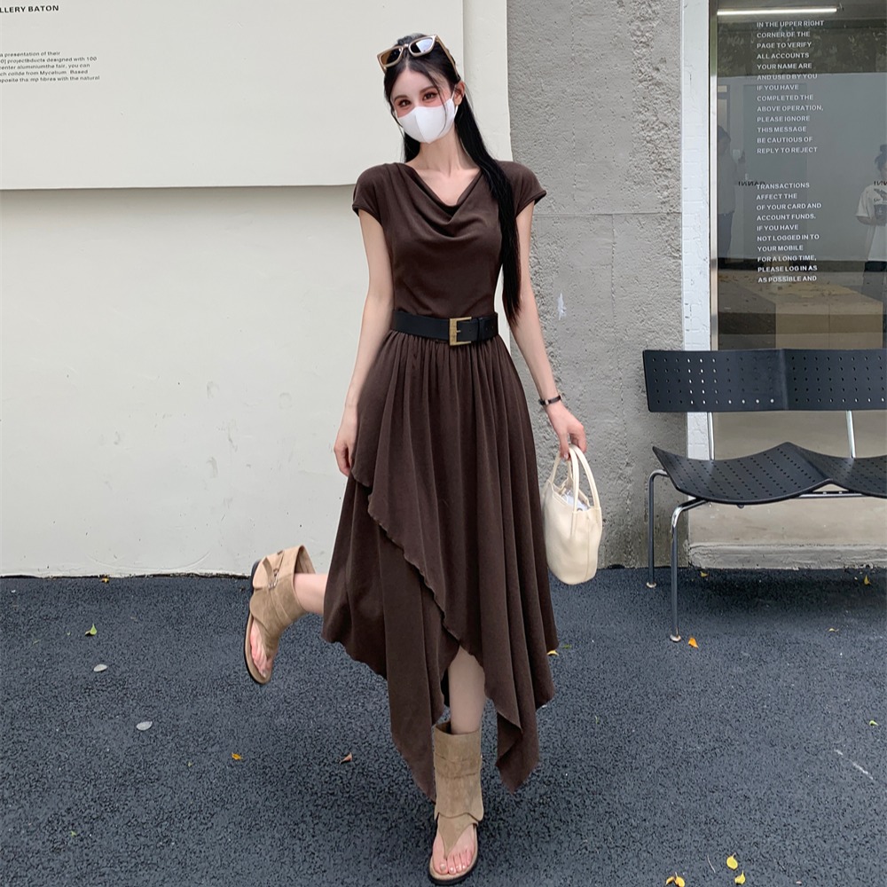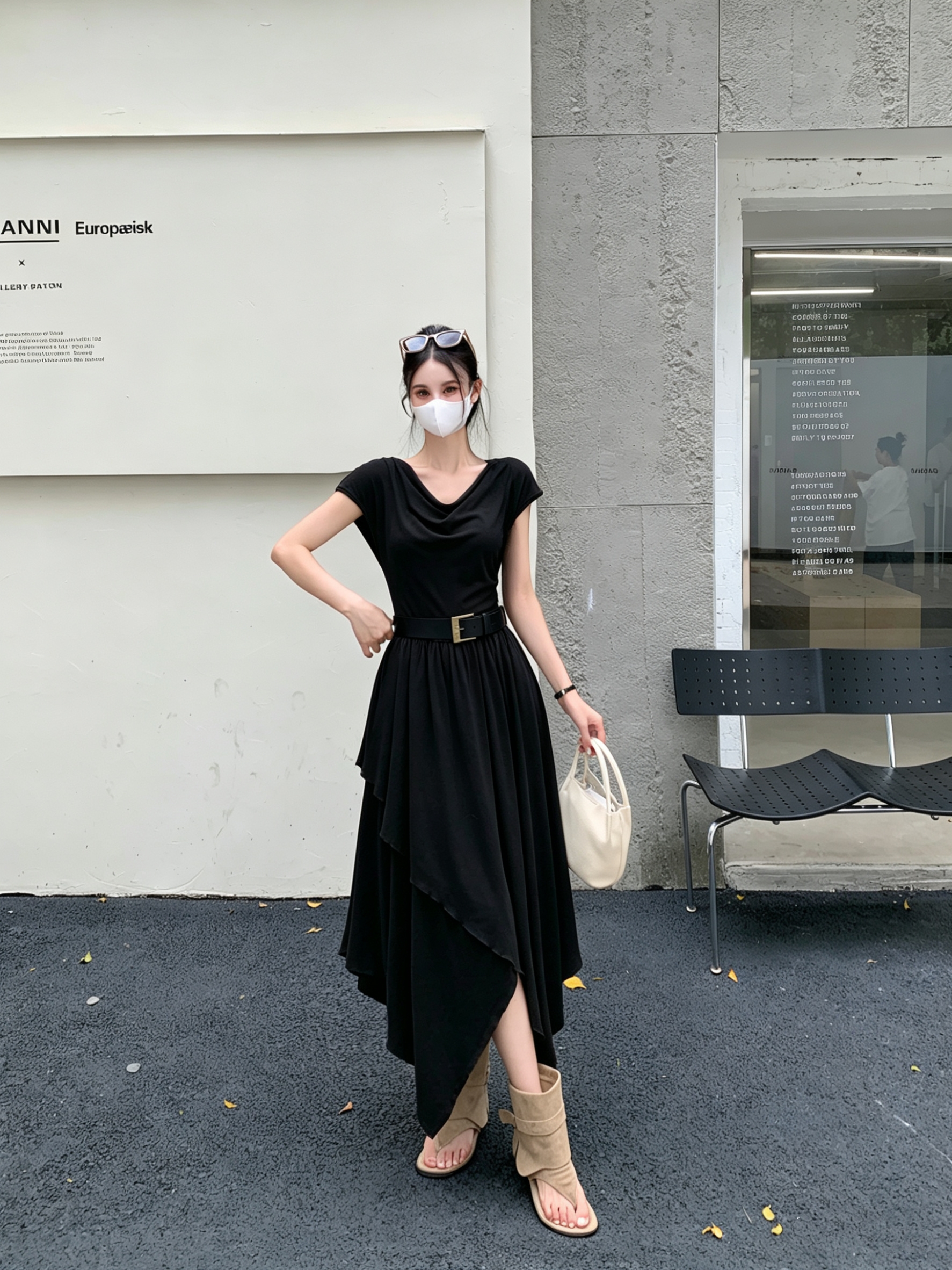 RY3928# 实拍夏季新款不规则垂感荡领遮肉显瘦收腰大码连衣裙女气质长裙