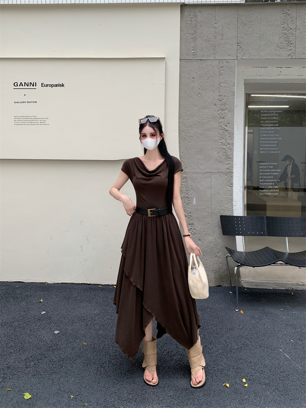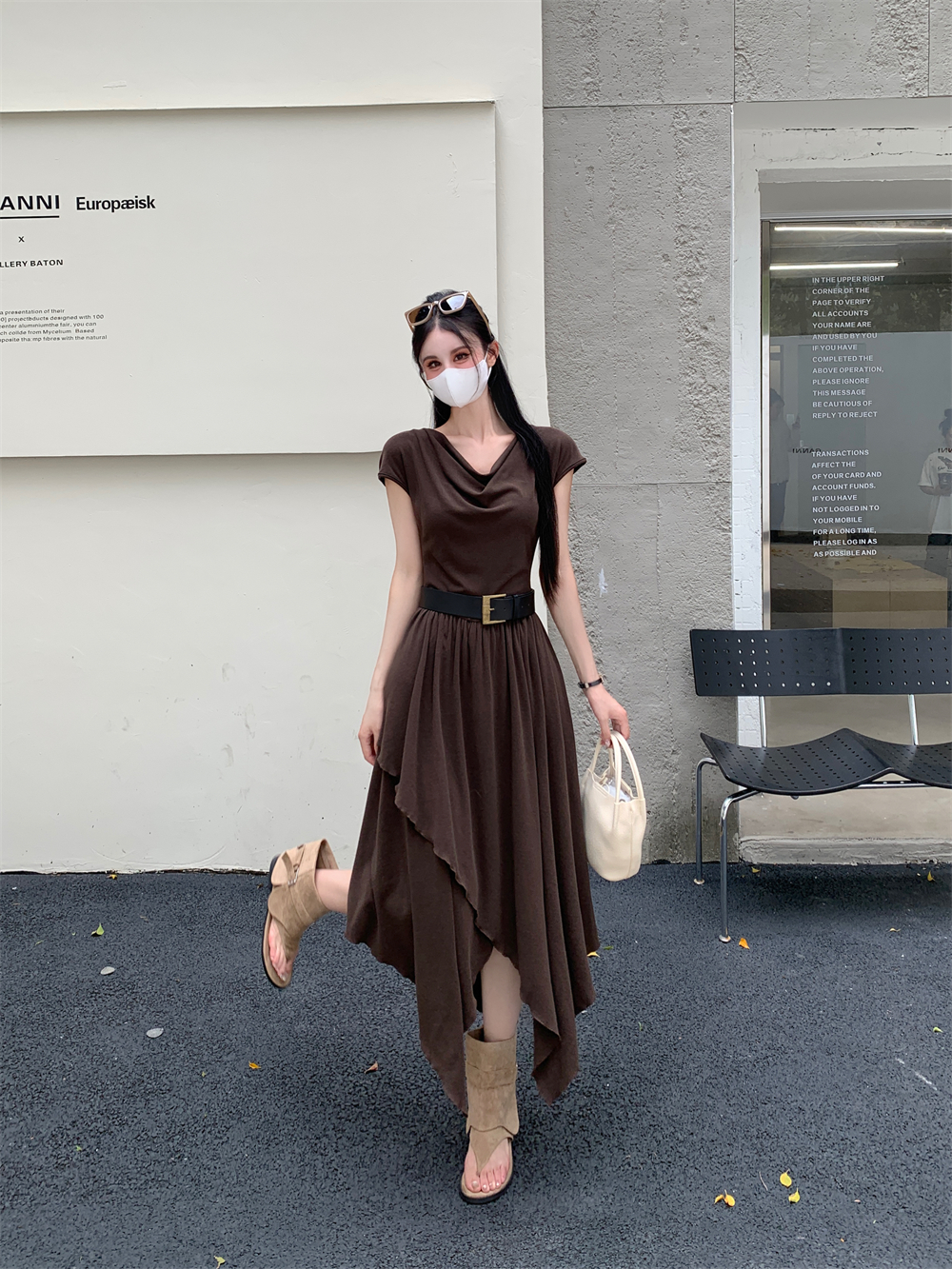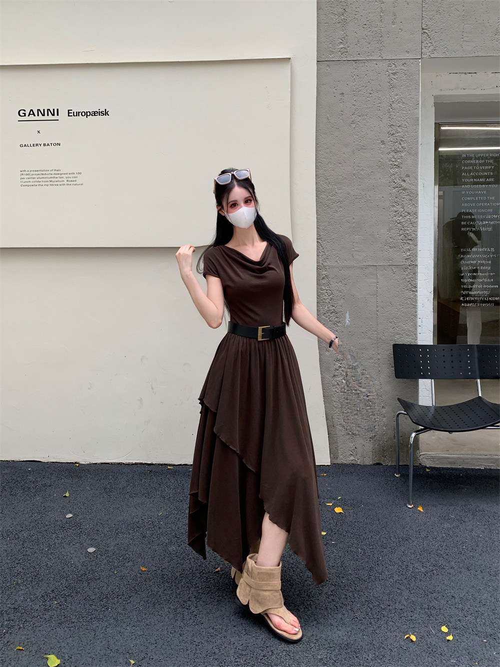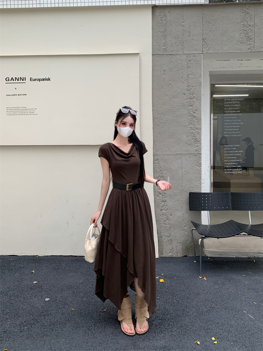 RY3928# 实拍夏季新款不规则垂感荡领遮肉显瘦收腰大码连衣裙女气质长裙